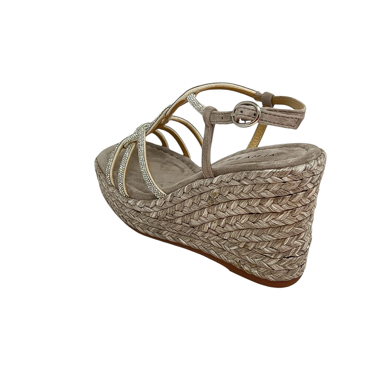 Sandalo in camoscio tortora con greca e strass.Zeppa di 8 centimetri