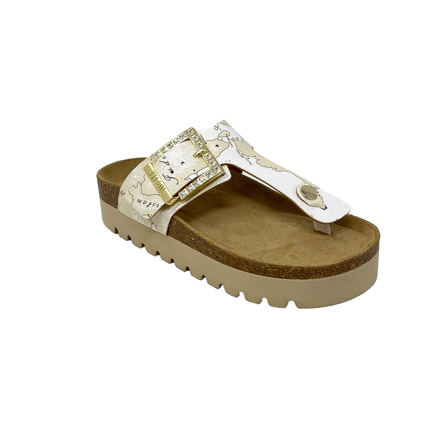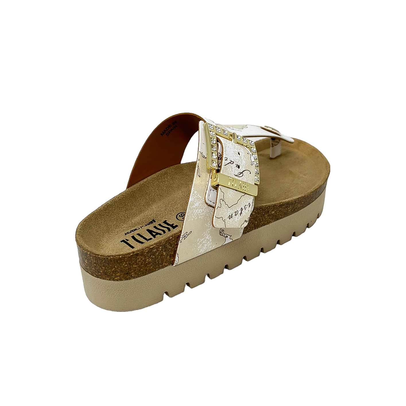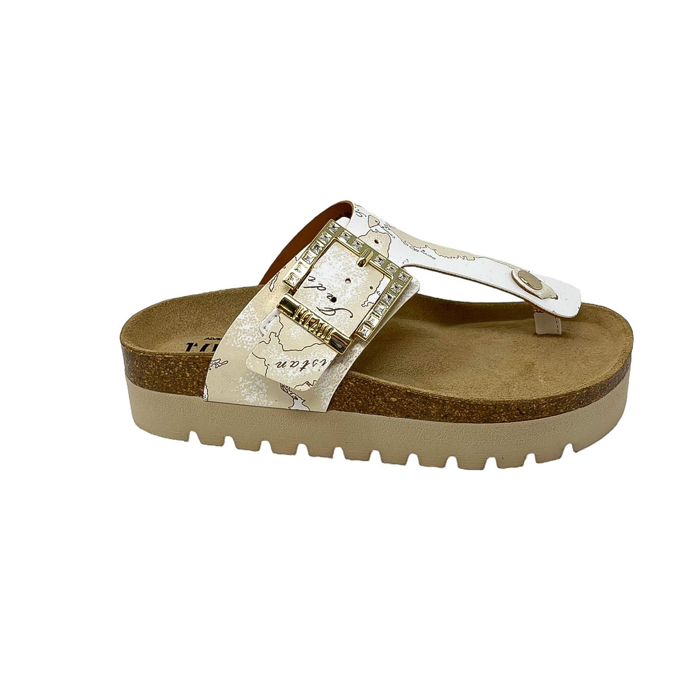 Ciabatta infradito in stampa alviero martini bianca o beige/cuoio con fibbia laterale in strass e suola in fussbett di 3 centimetri