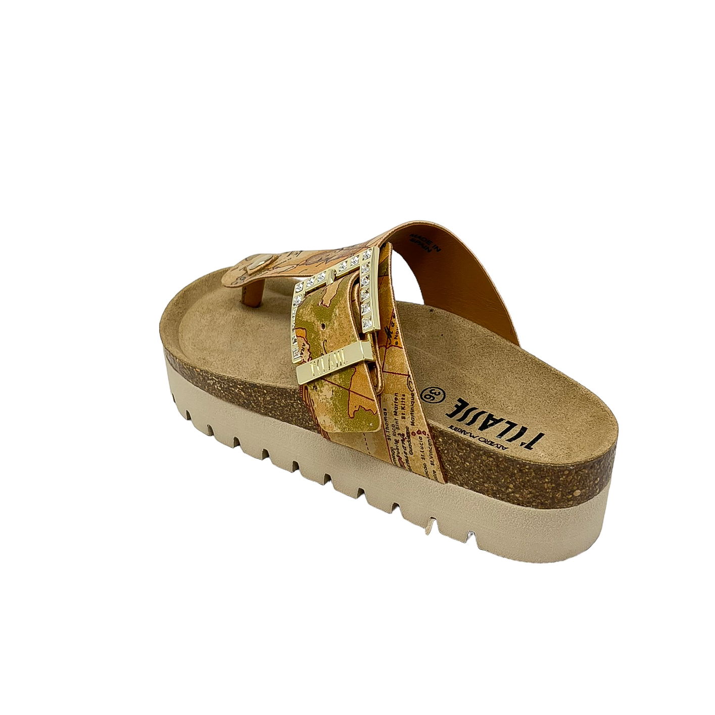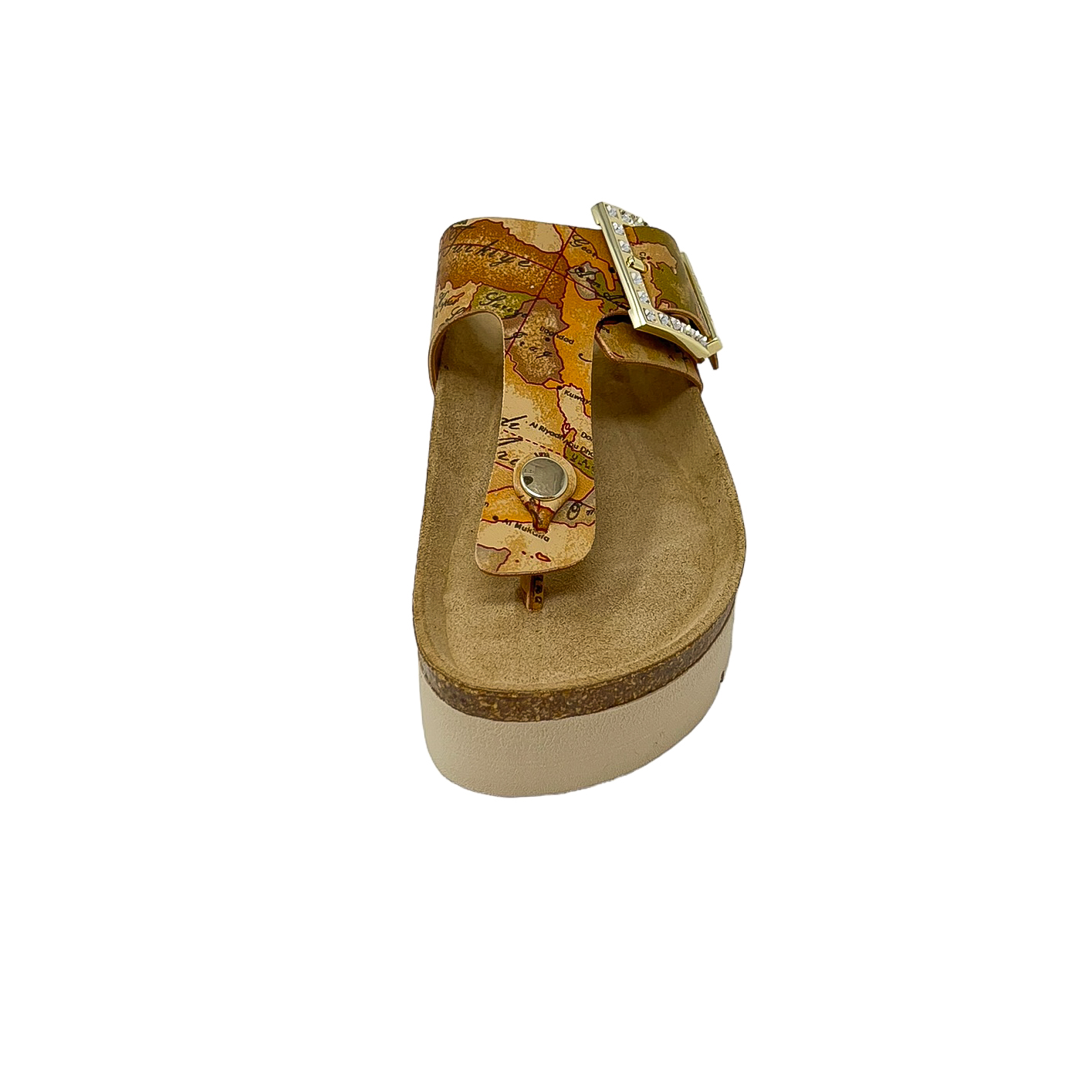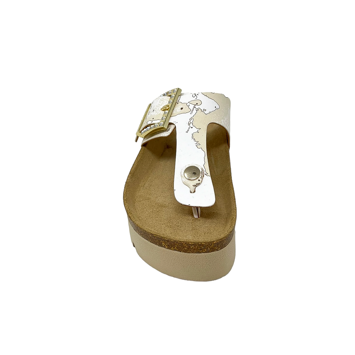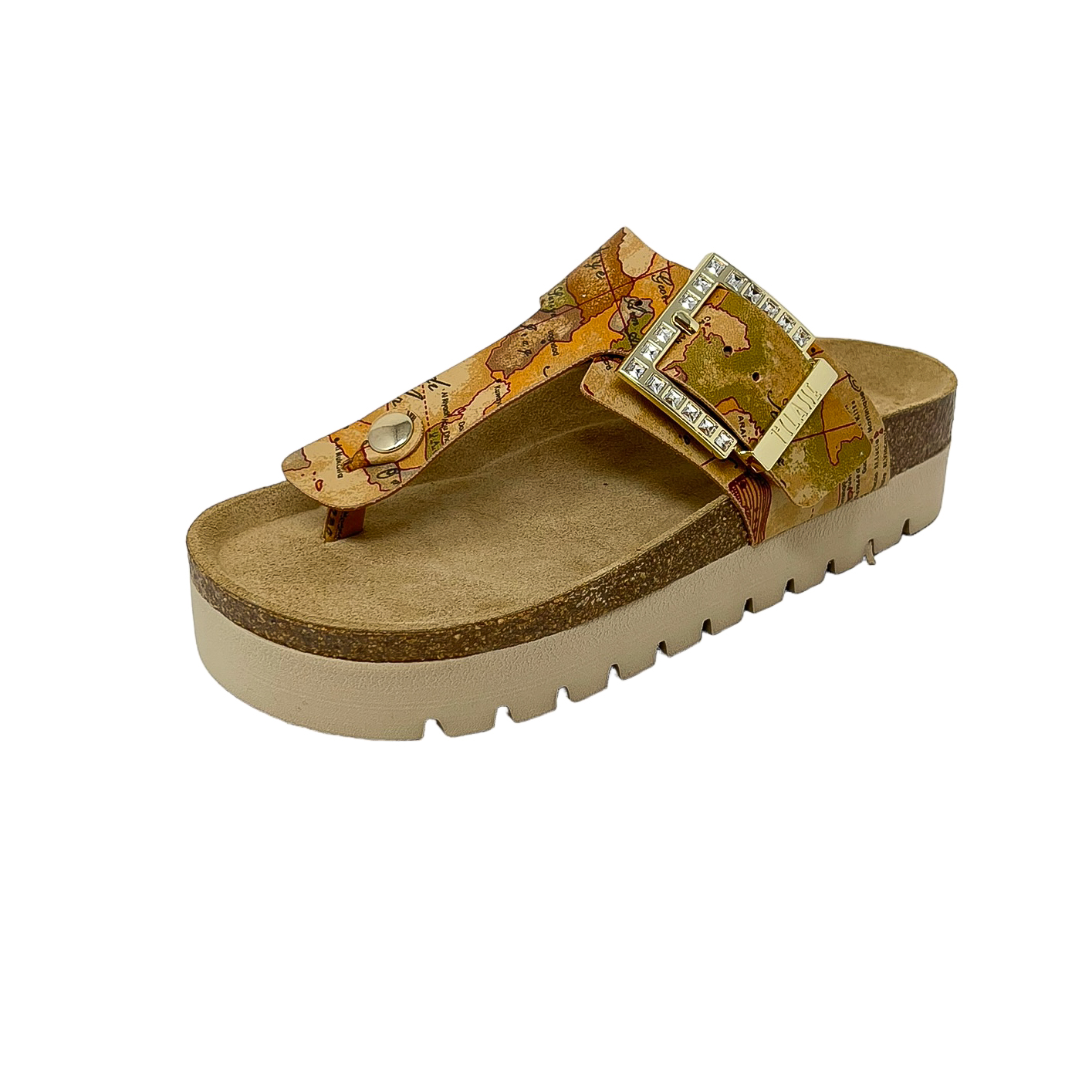 Ciabatta infradito in stampa alviero martini bianca o beige/cuoio con fibbia laterale in strass e suola in fussbett di 3 centimetri