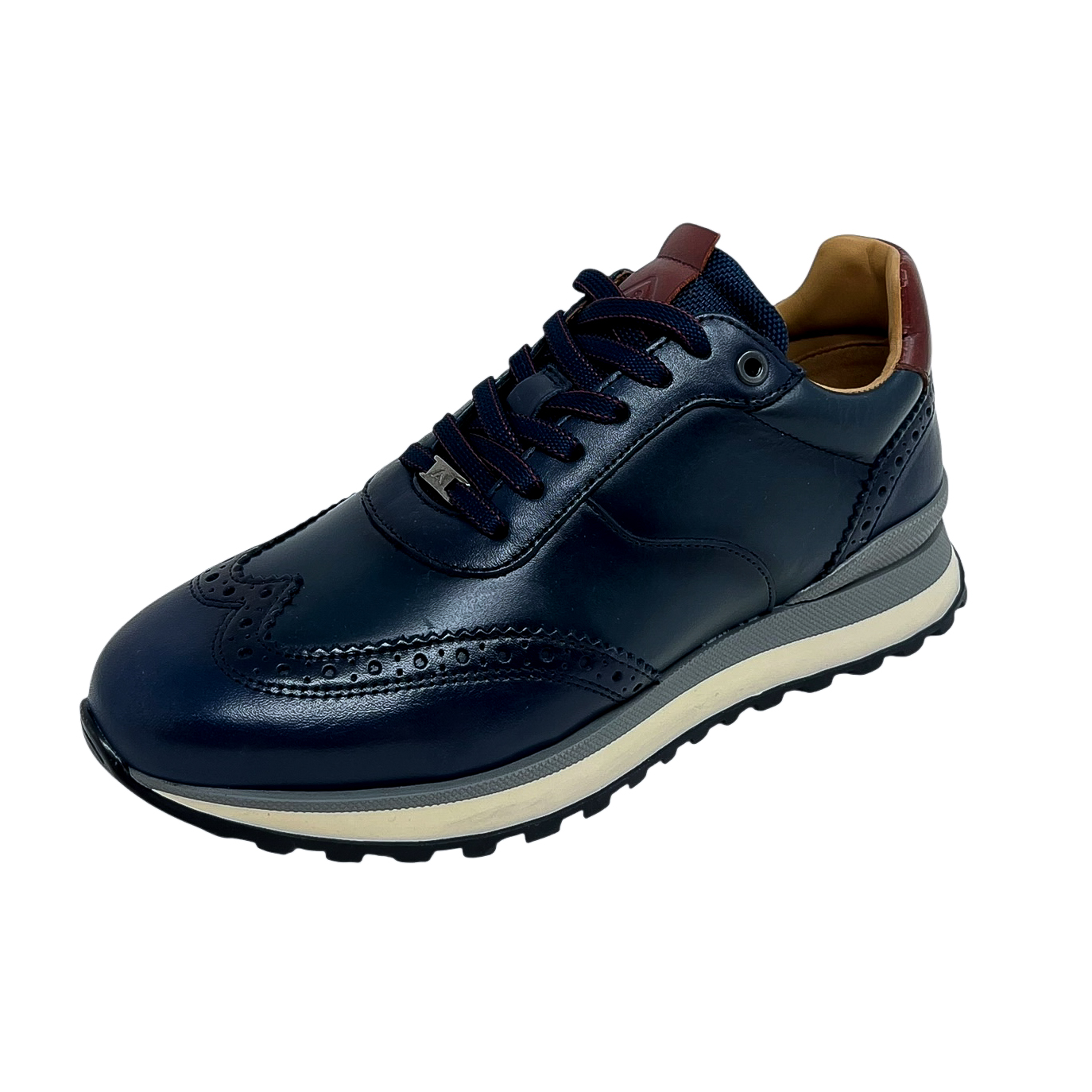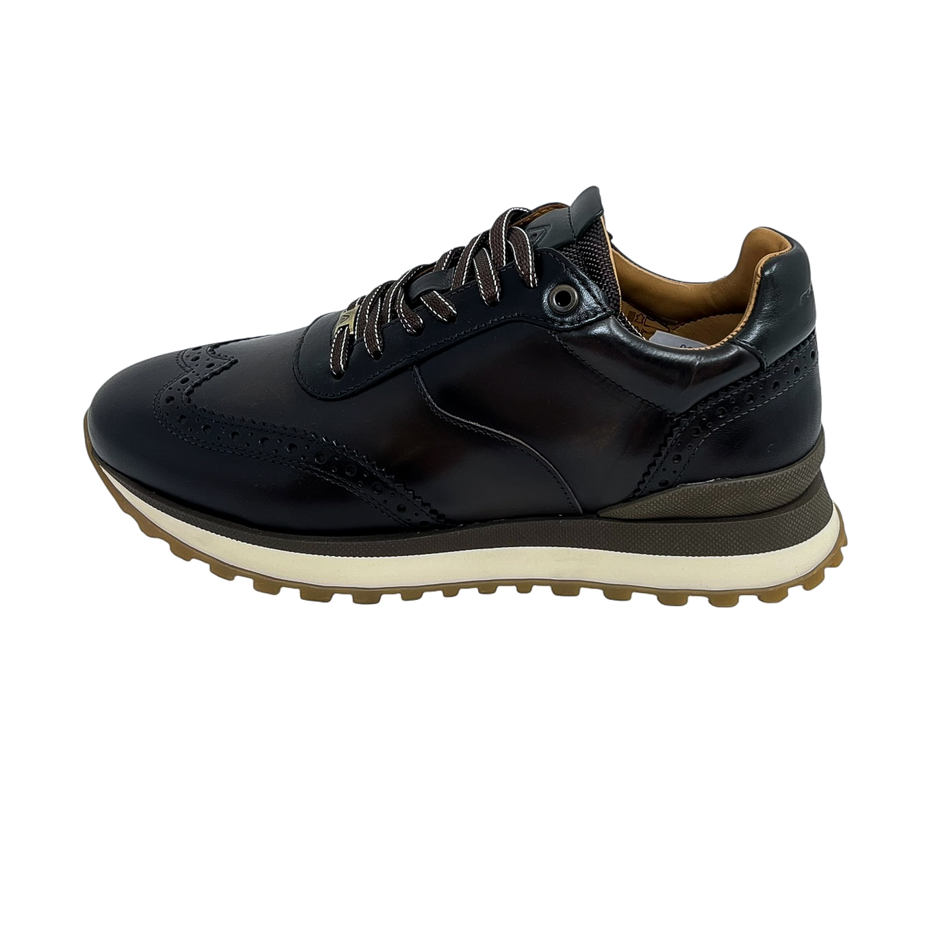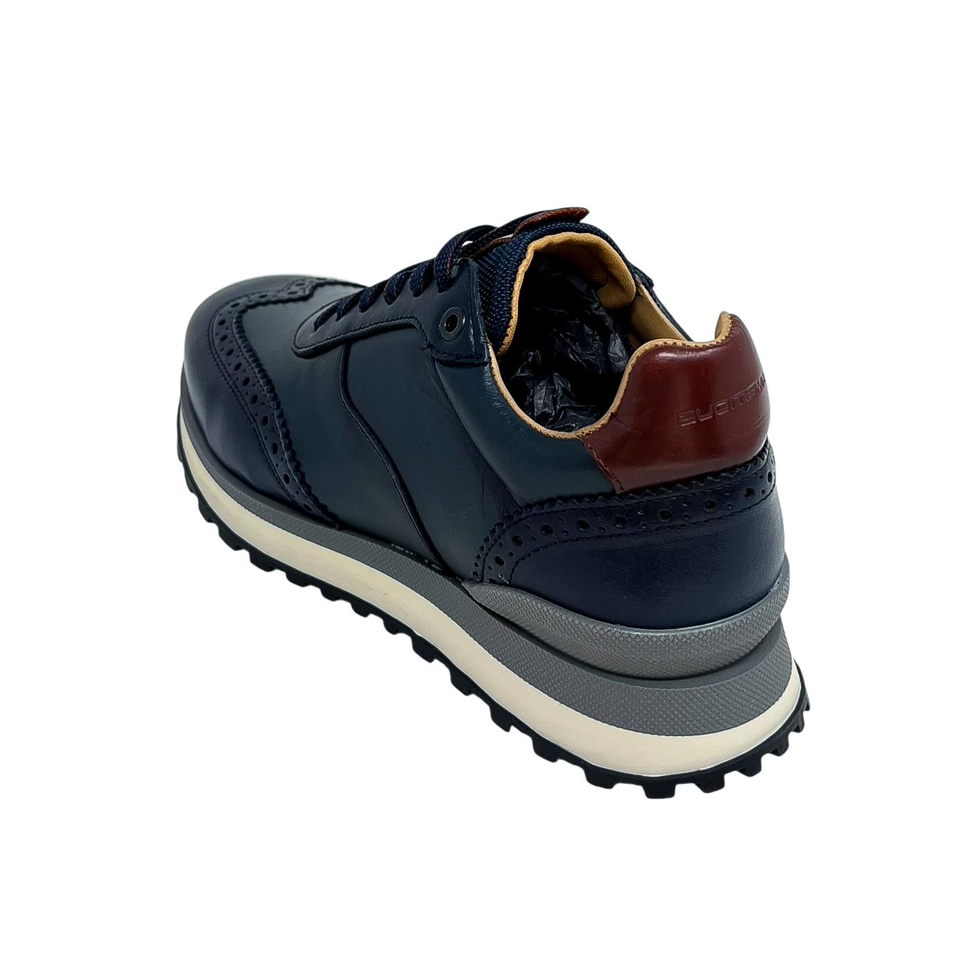 Stringata running in pelle blu o marrone con ricamo a coda di rondine
