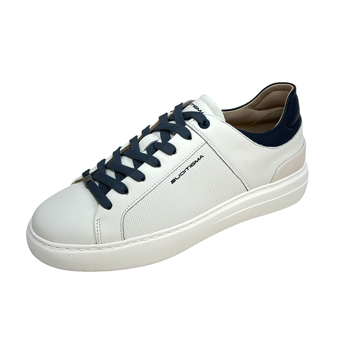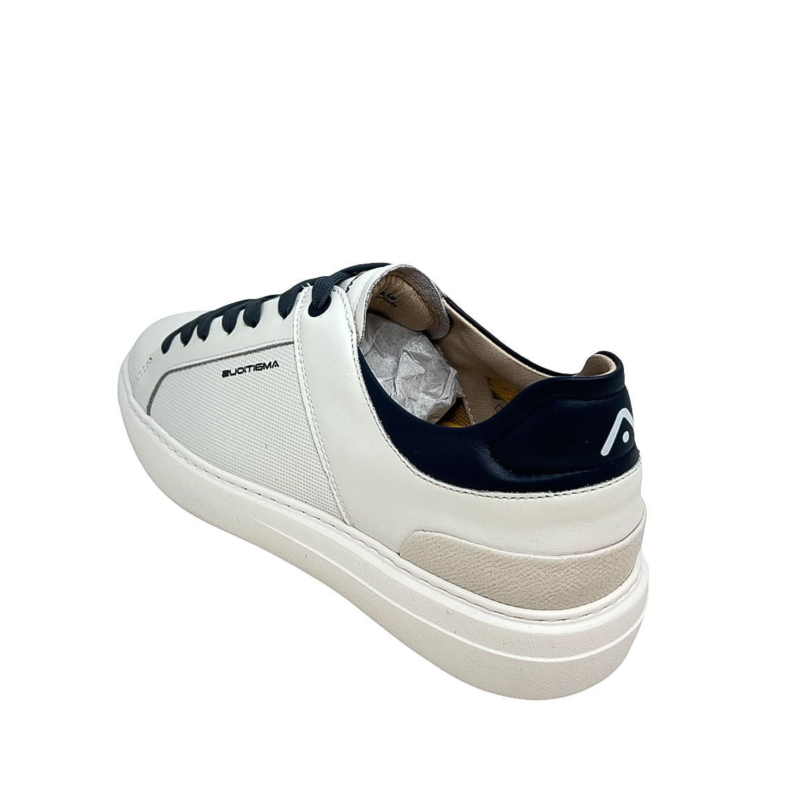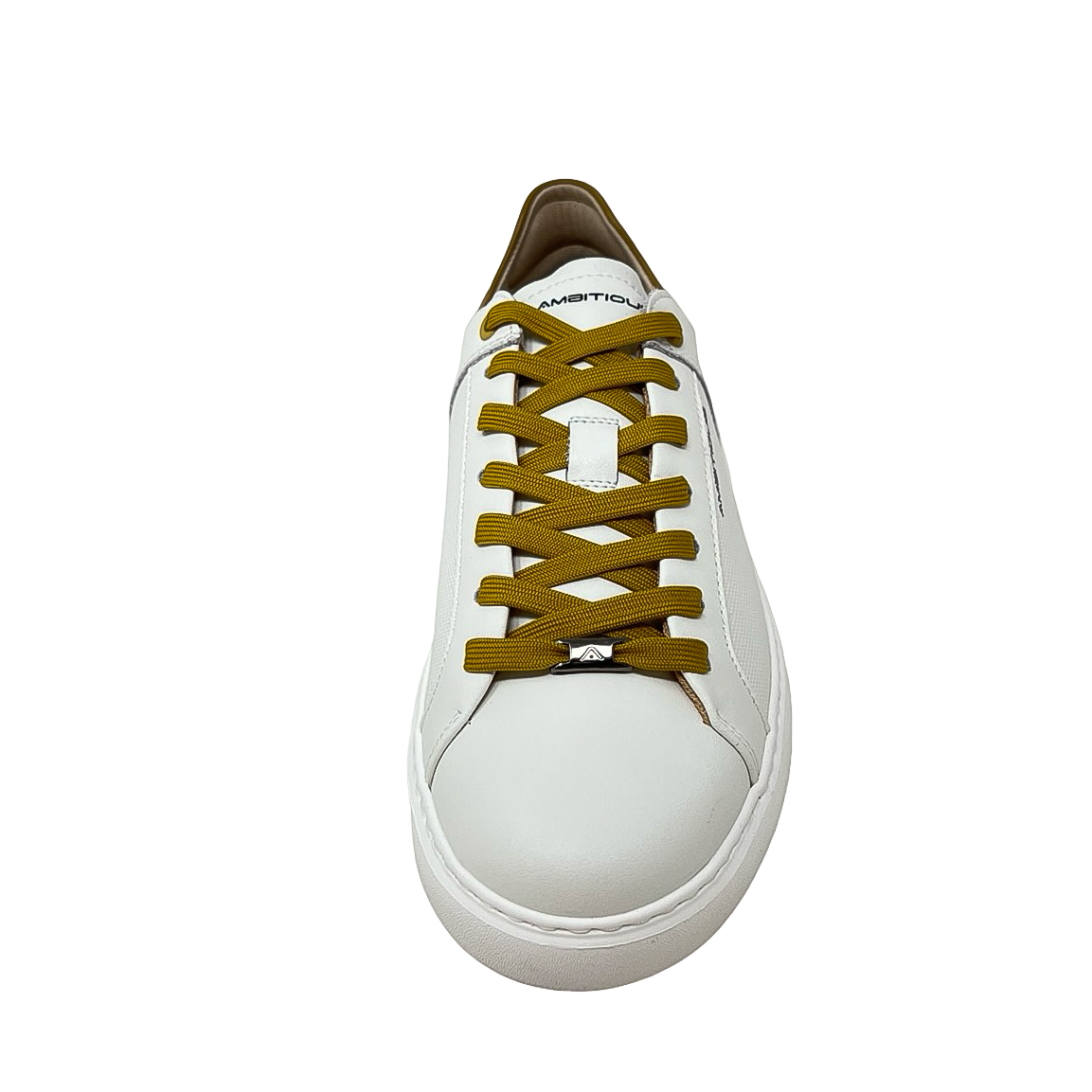 Sneaker in pelle bianca con dettagli blu o senape e suola di 2 centimetri