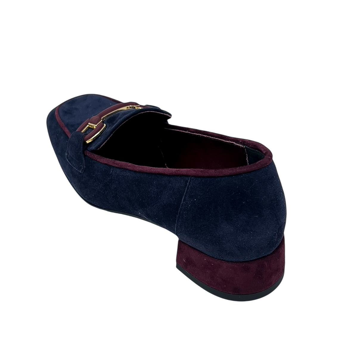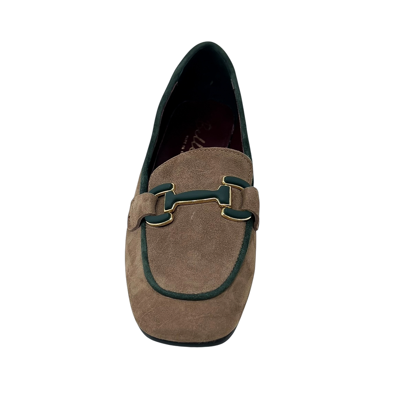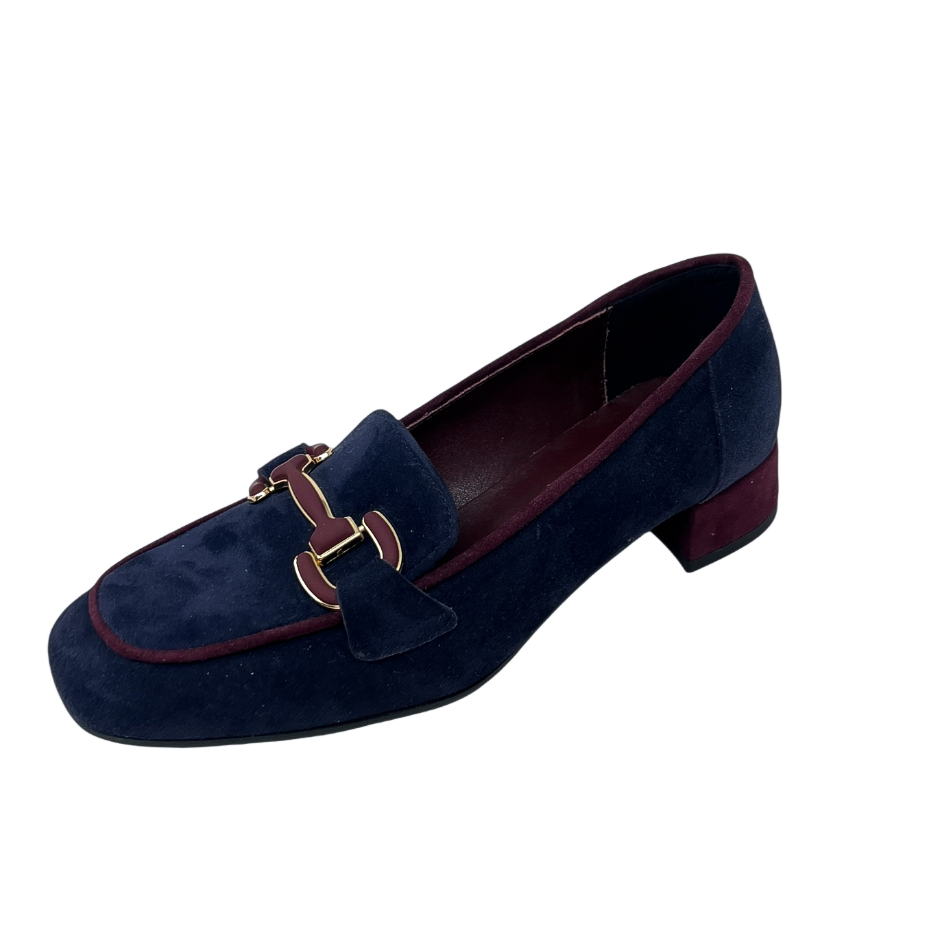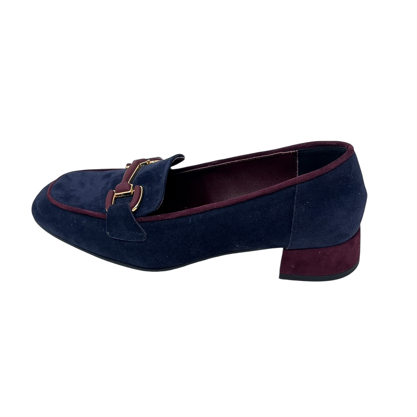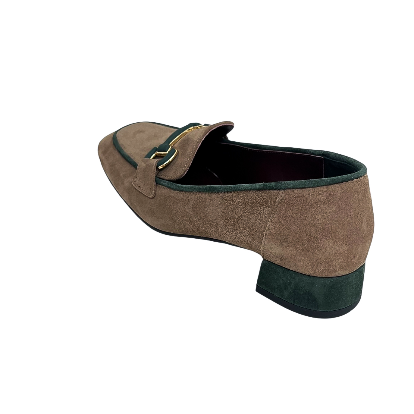 Mocassino in camoscio tortora con profili verdi o in camoscio blu con profili bordeaux, tacco grosso di 3 centimetri e morsetto
