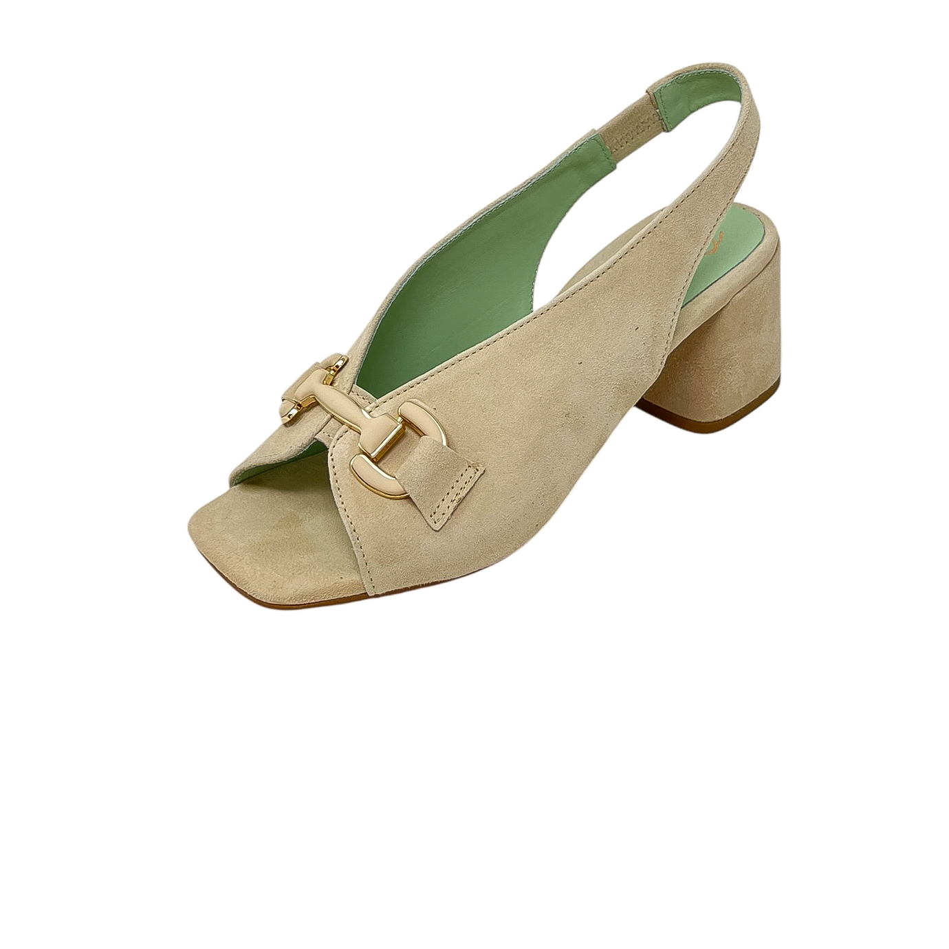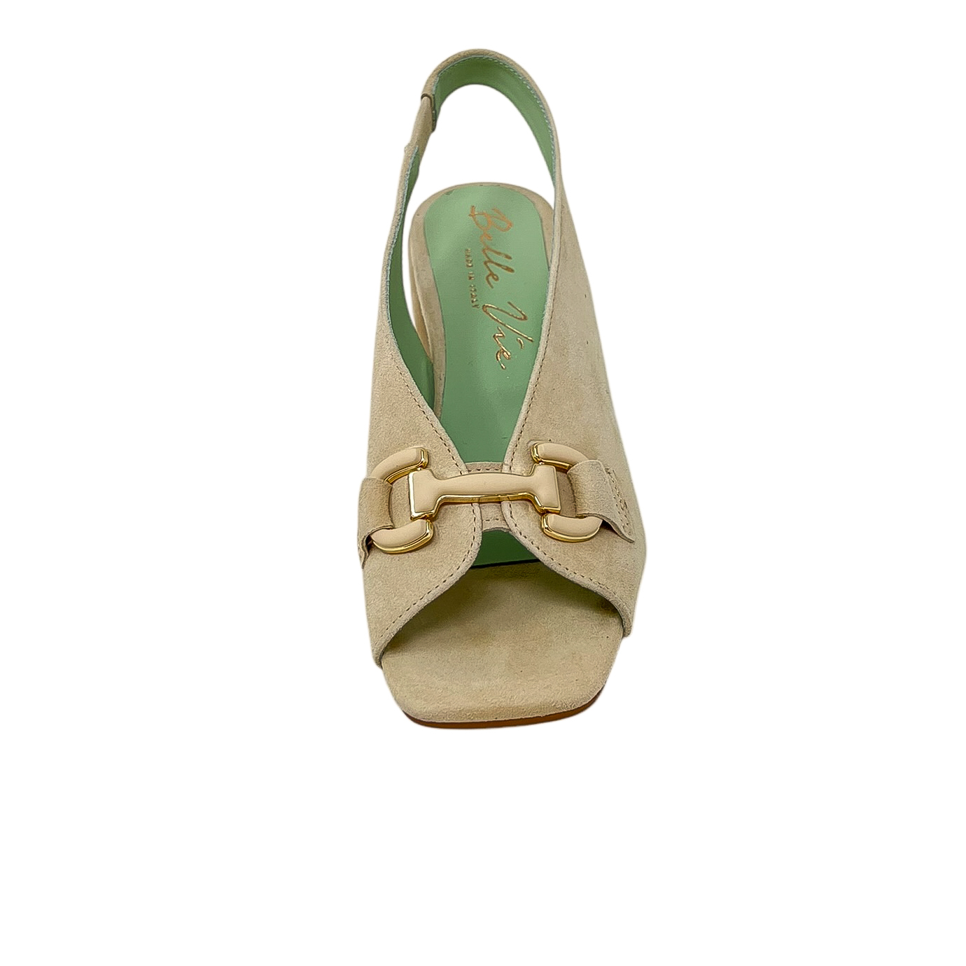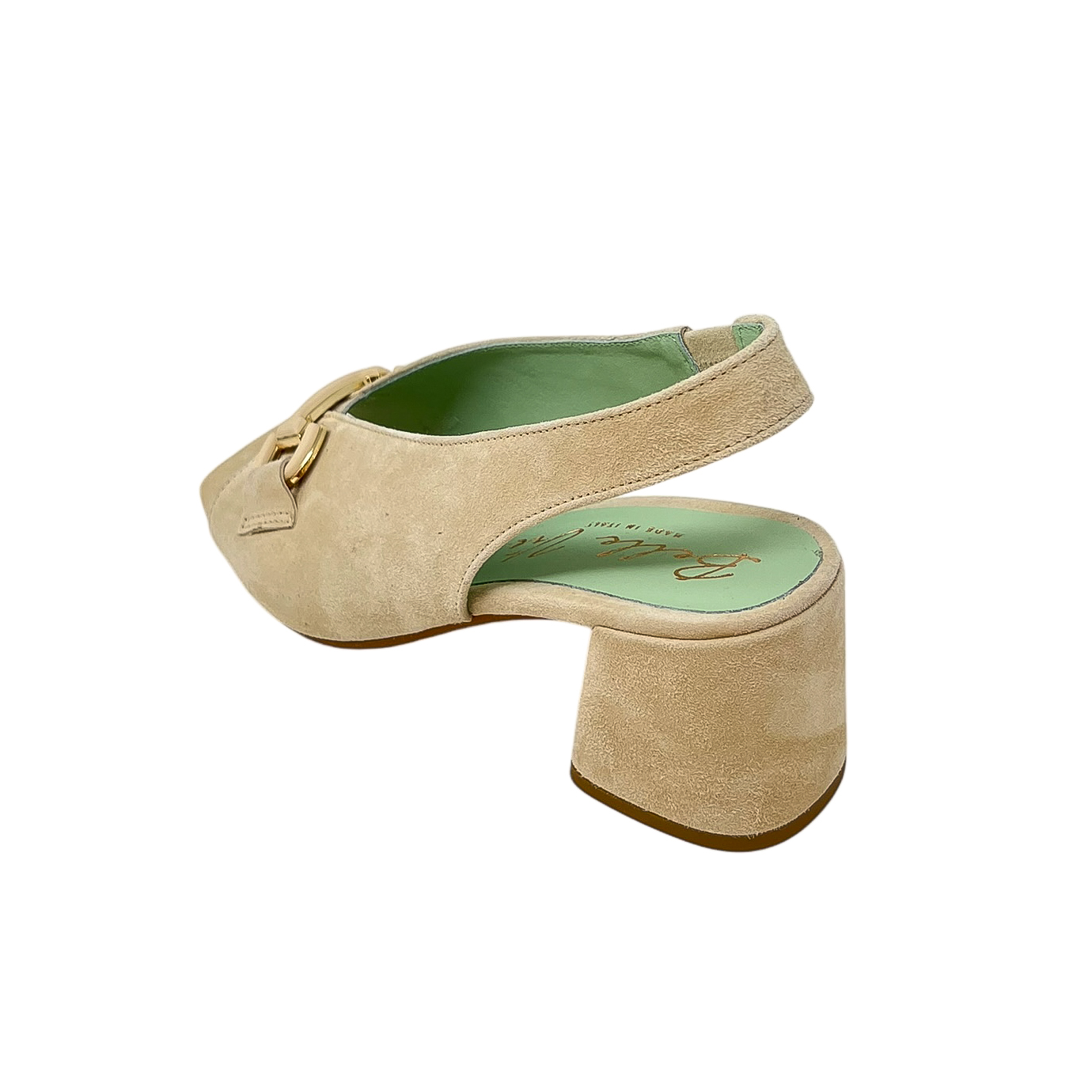 Sandalo in camoscio beige o blu con morsetto e tacco grosso di 5 centimetri
