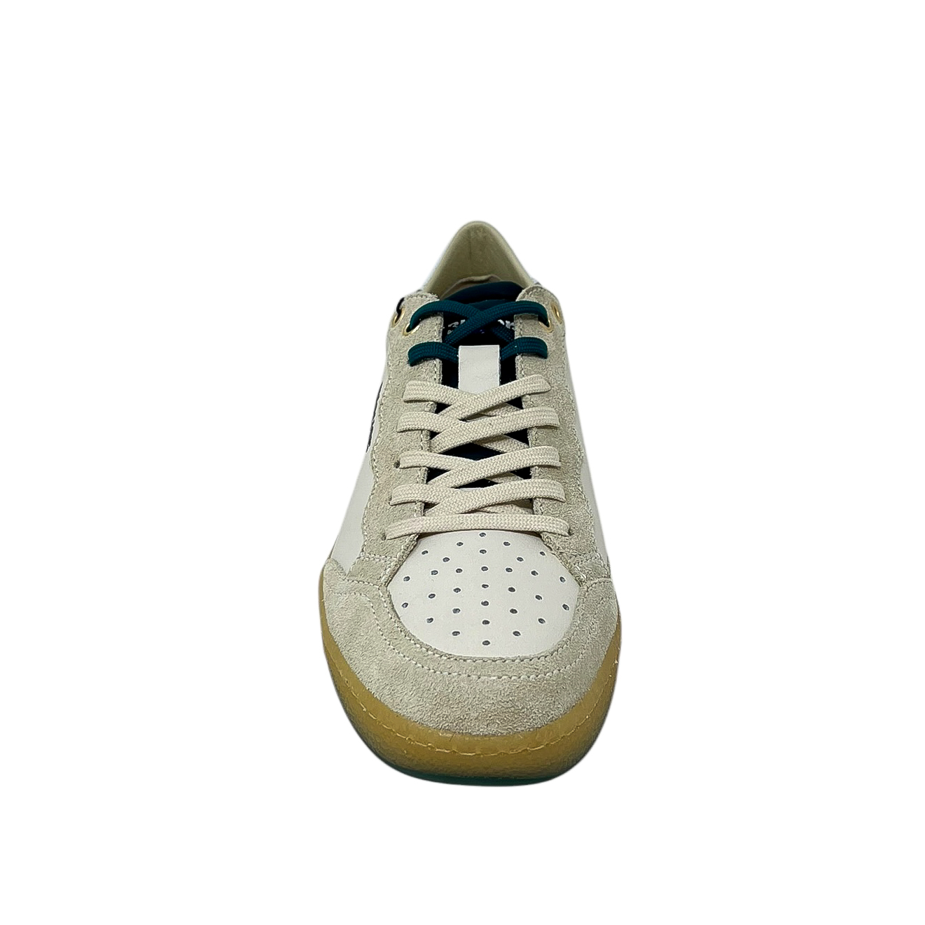 Sneaker basket in pelle bianca con inserti in camoscio blu o verdi