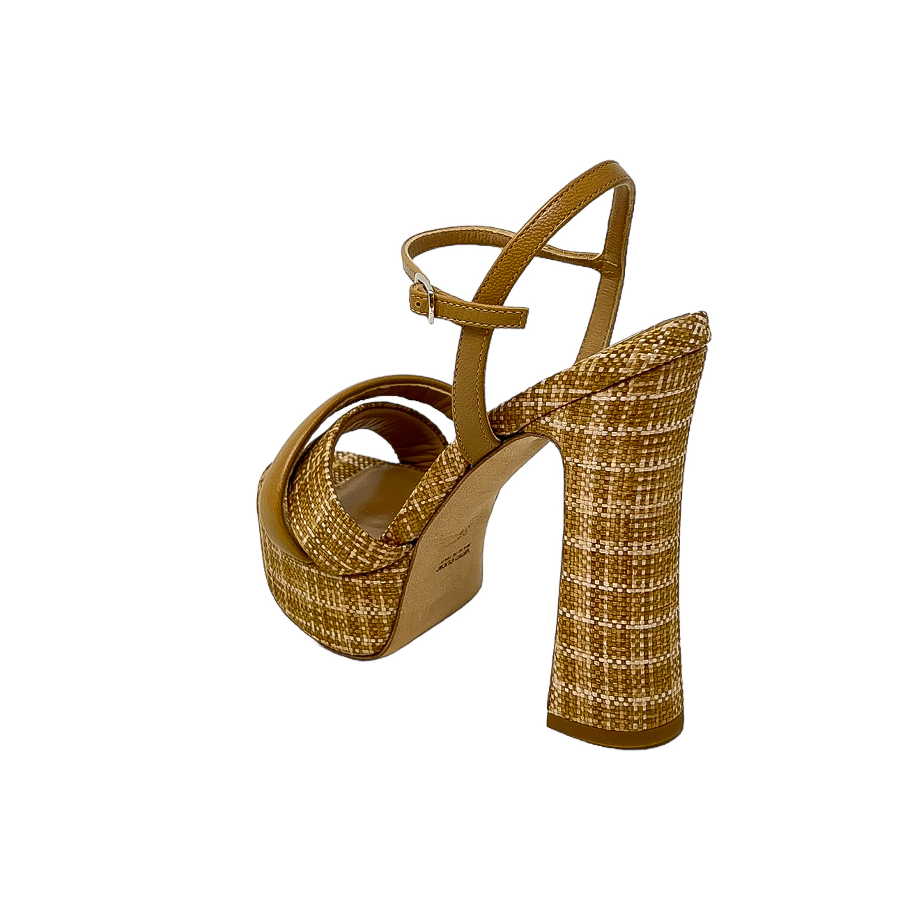 Sandalo in tessuto rafia e pelle beige con tacco di 13 centimetri grosso con platform