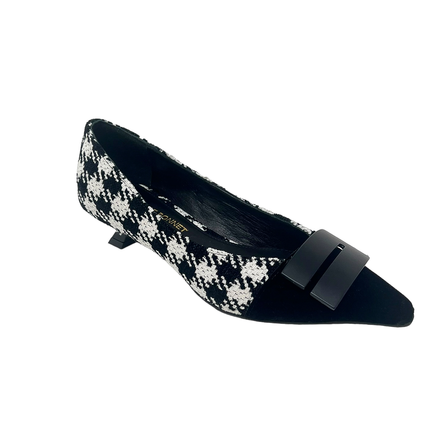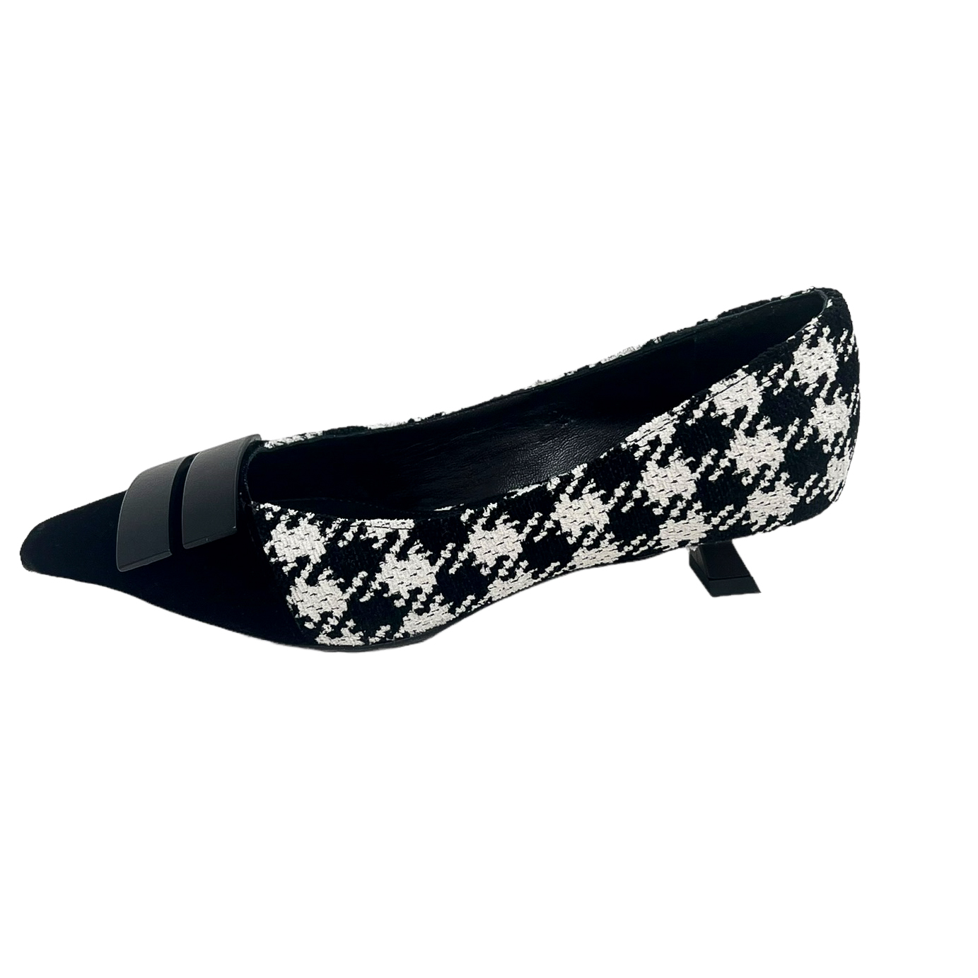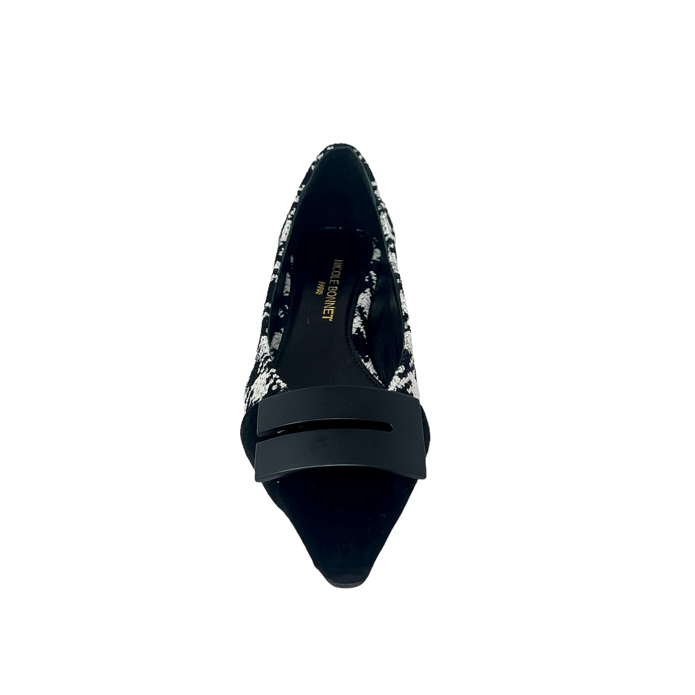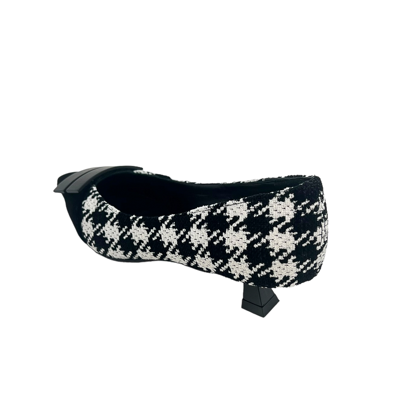 Ballerina in tessuto tweed bianco e nero con punta scamosciata nera ed accessorio nero. Tacco di 1 centimetro