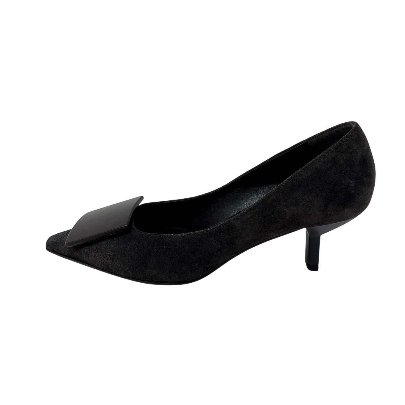 Mocassino in camoscio cuoio con accessorio dorato e tacco grosso di 7 centimetri