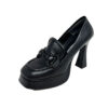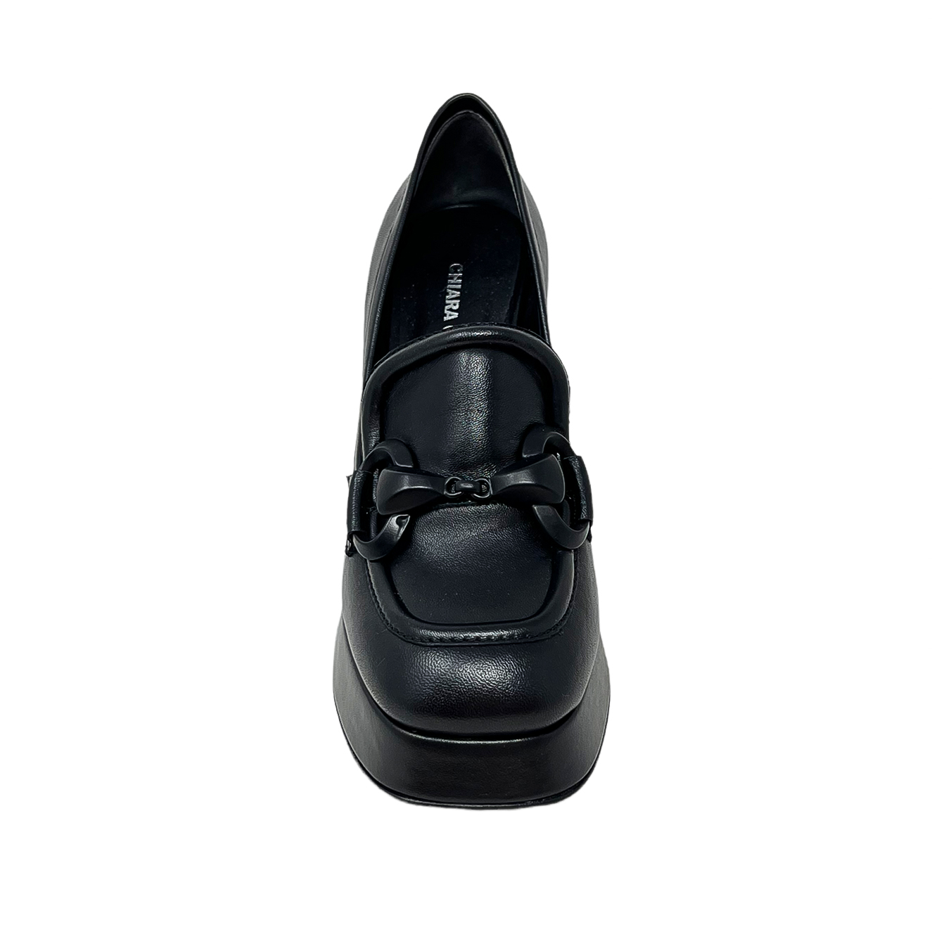 Mocassino in pelle nera con morsetto nero o pelle ghiaccio con morsetto piombo e tacco grosso di 12 centimetri con platform