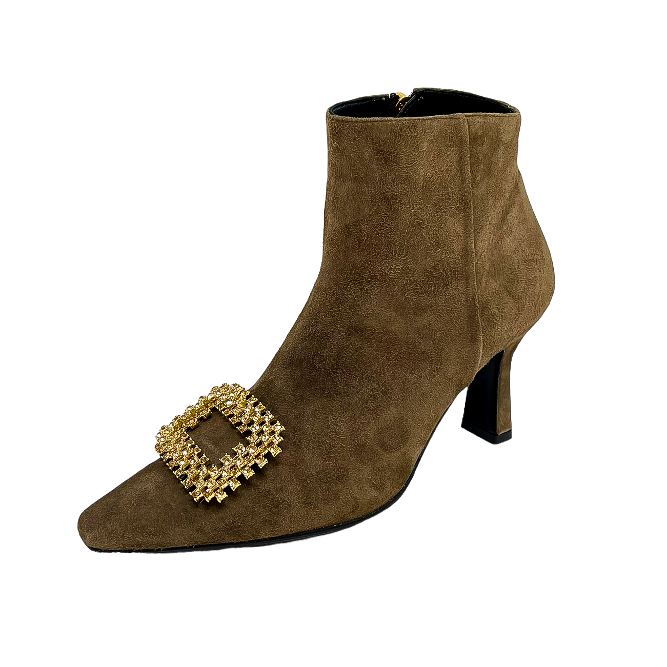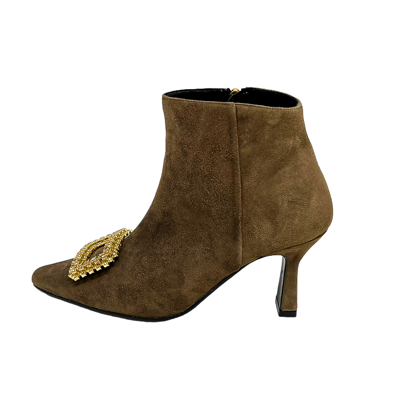 Tronchetto in camoscio tortora con accessorio in strass e tacco a tocchetto di 7 centimetri