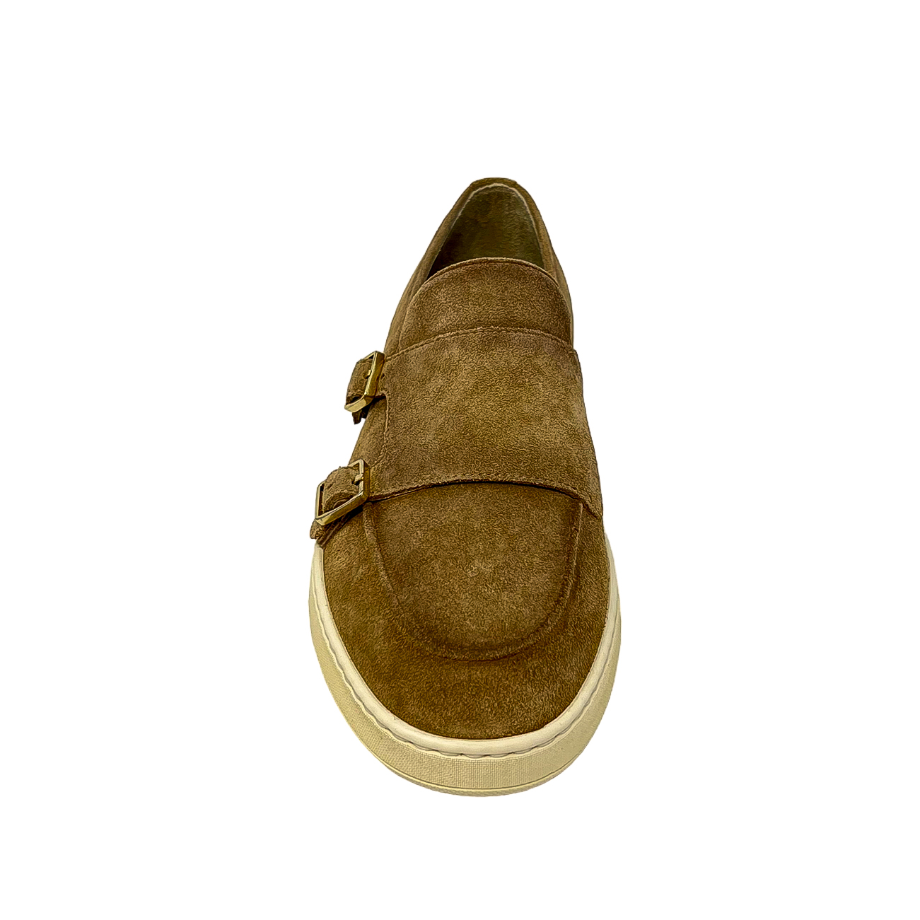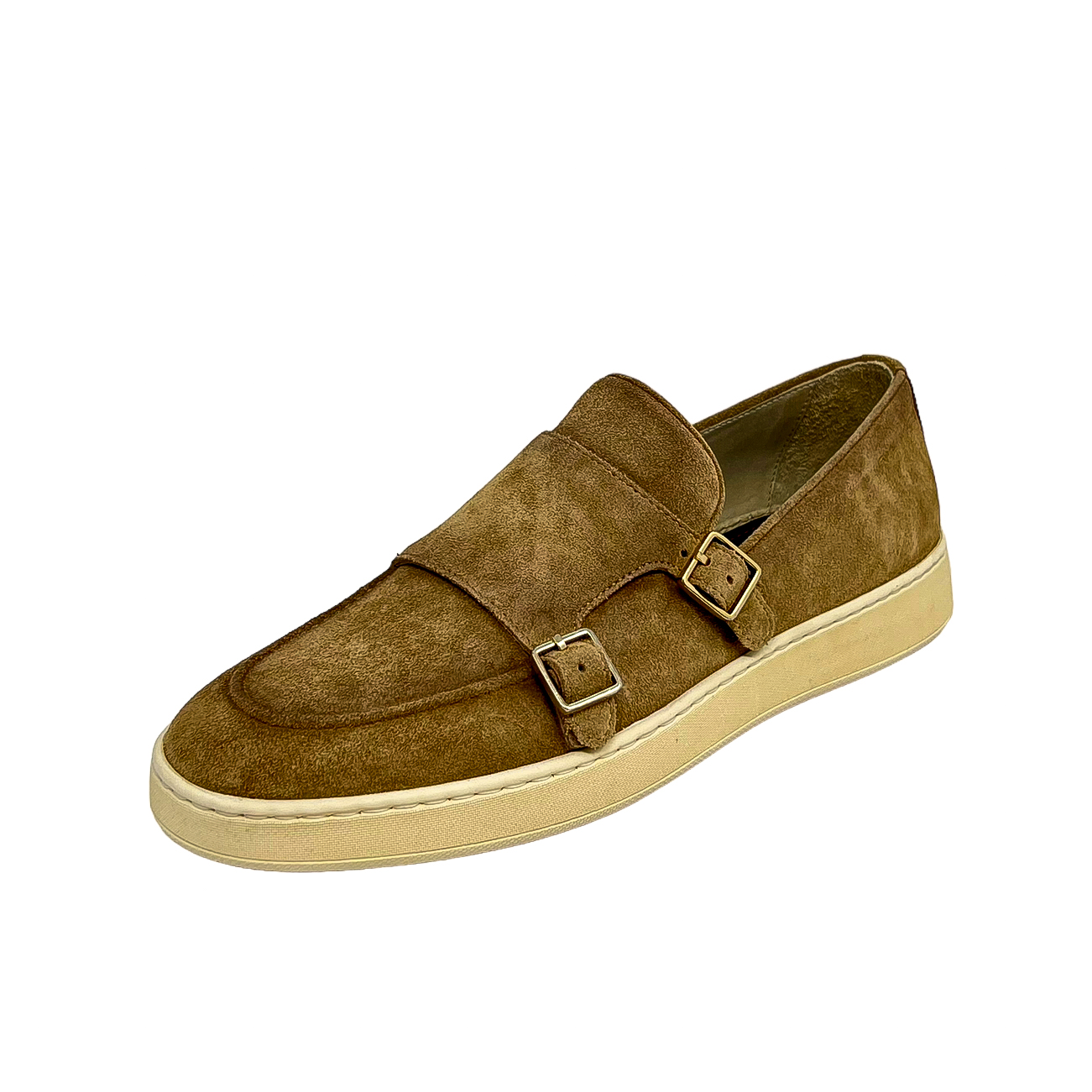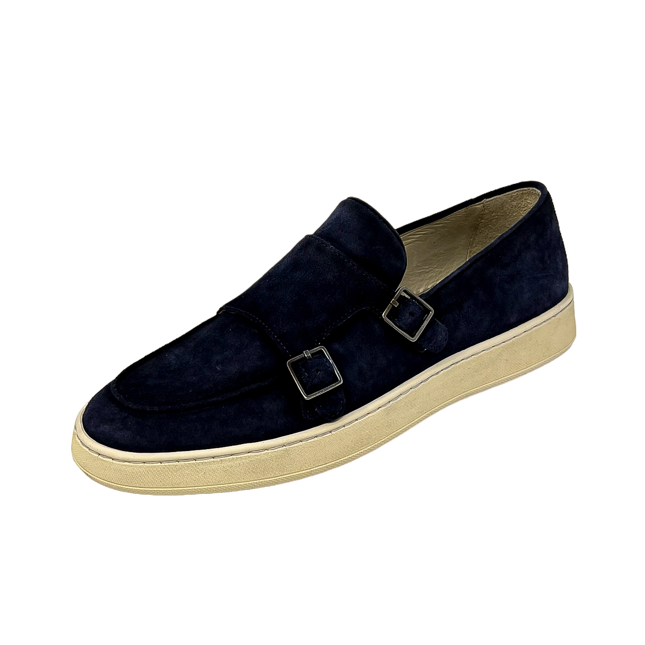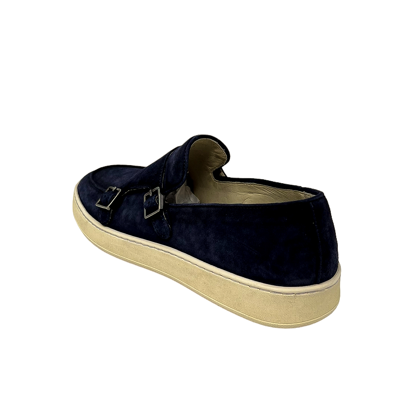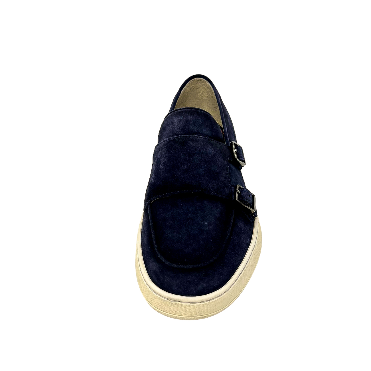 Mocassino in camoscio blu o camoscio beige con due fibbie laterali e suola a sneaker