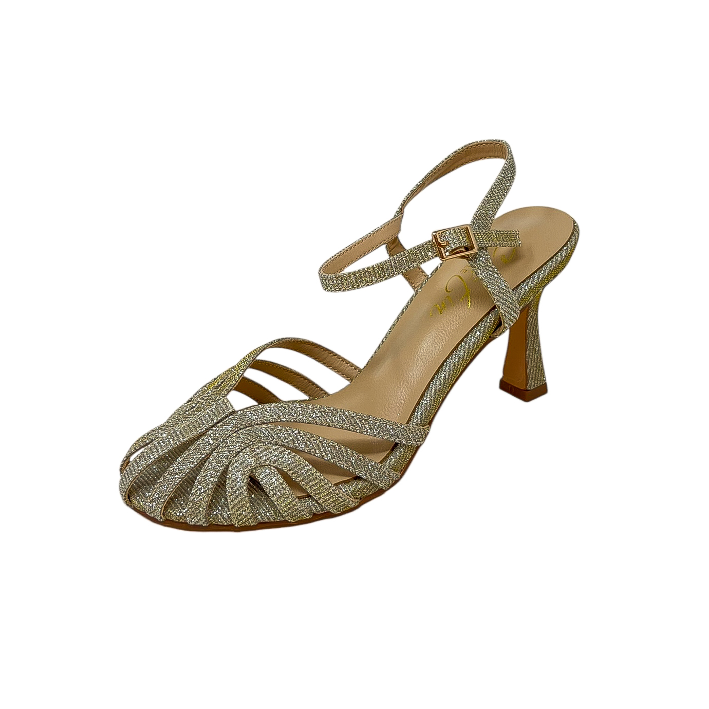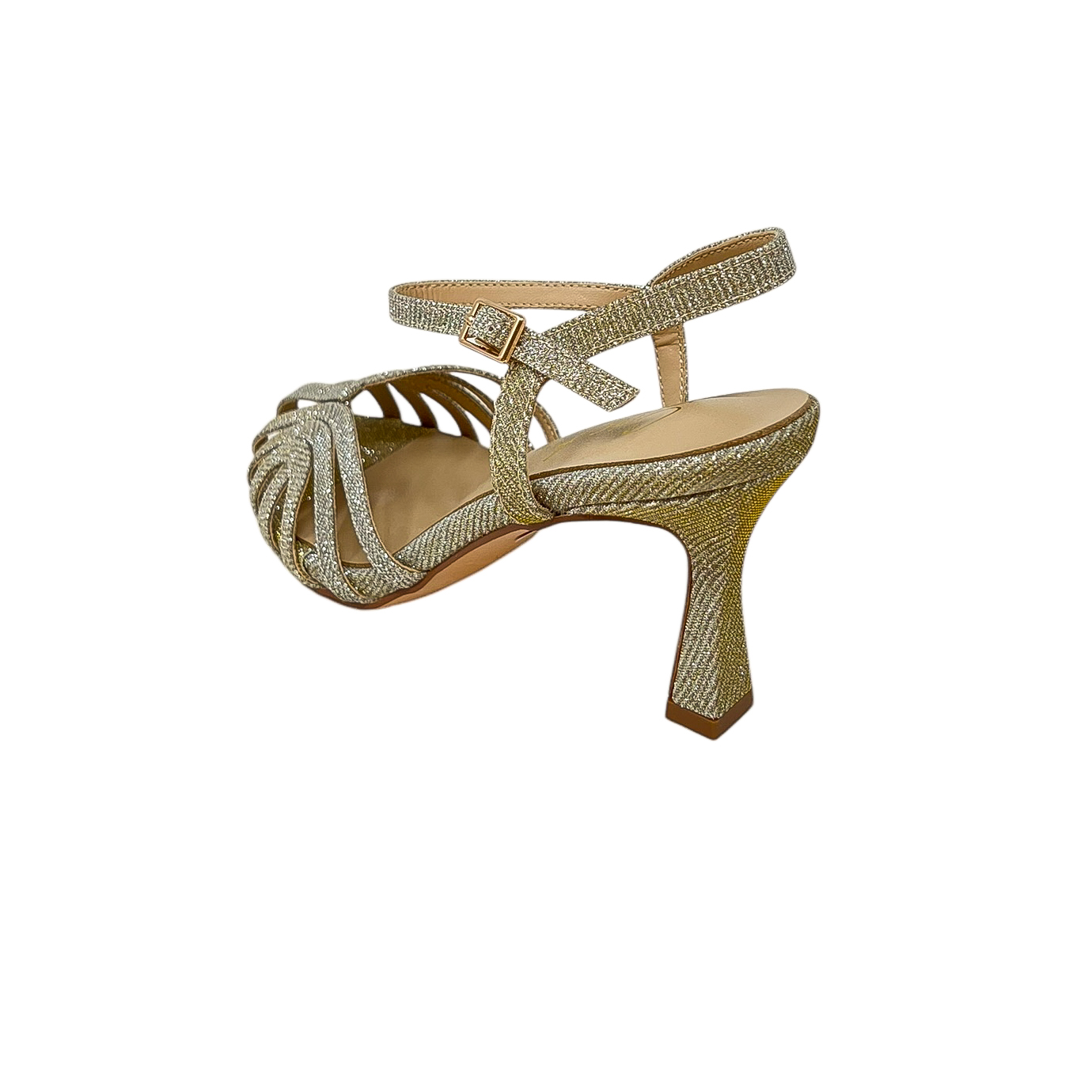 Sandalo tinge tangherina in glitter platino con tacco a rocchetto di 6 centimetri