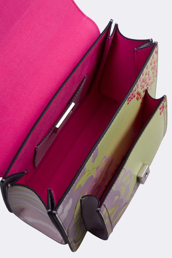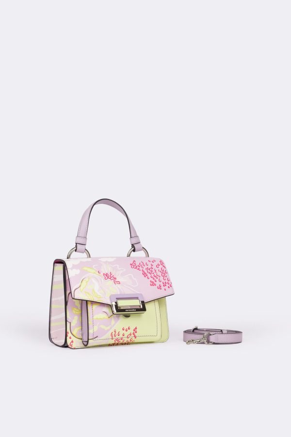 Borsa a mano realizzata in vitello liscio stampato, chiusura in metallo e resina, con parte centrale smaltata. Finiture argento. Dotata di tracolla regolabile in pelle.