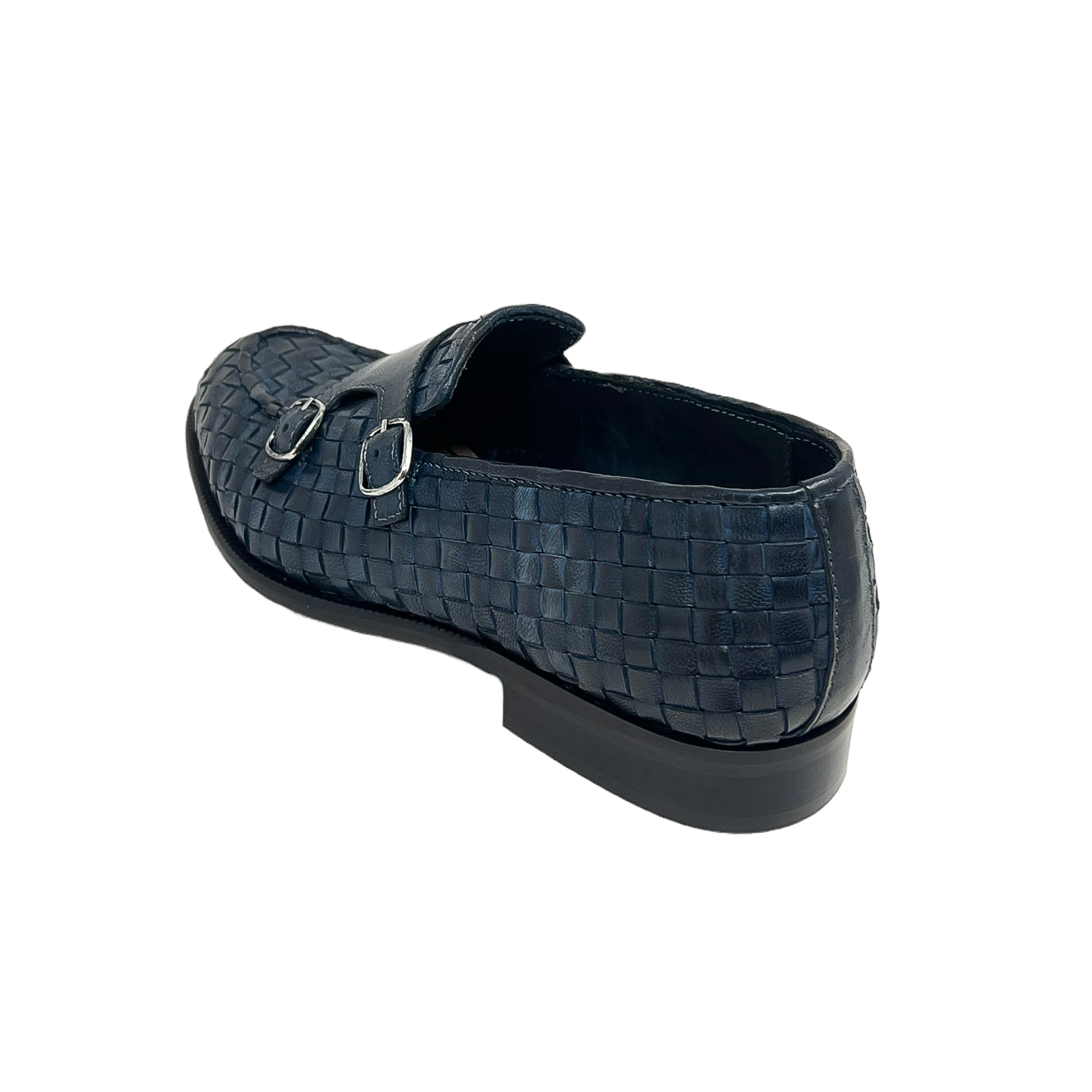 Mocassino in pelle intrecciata blu con due fibbie laterali