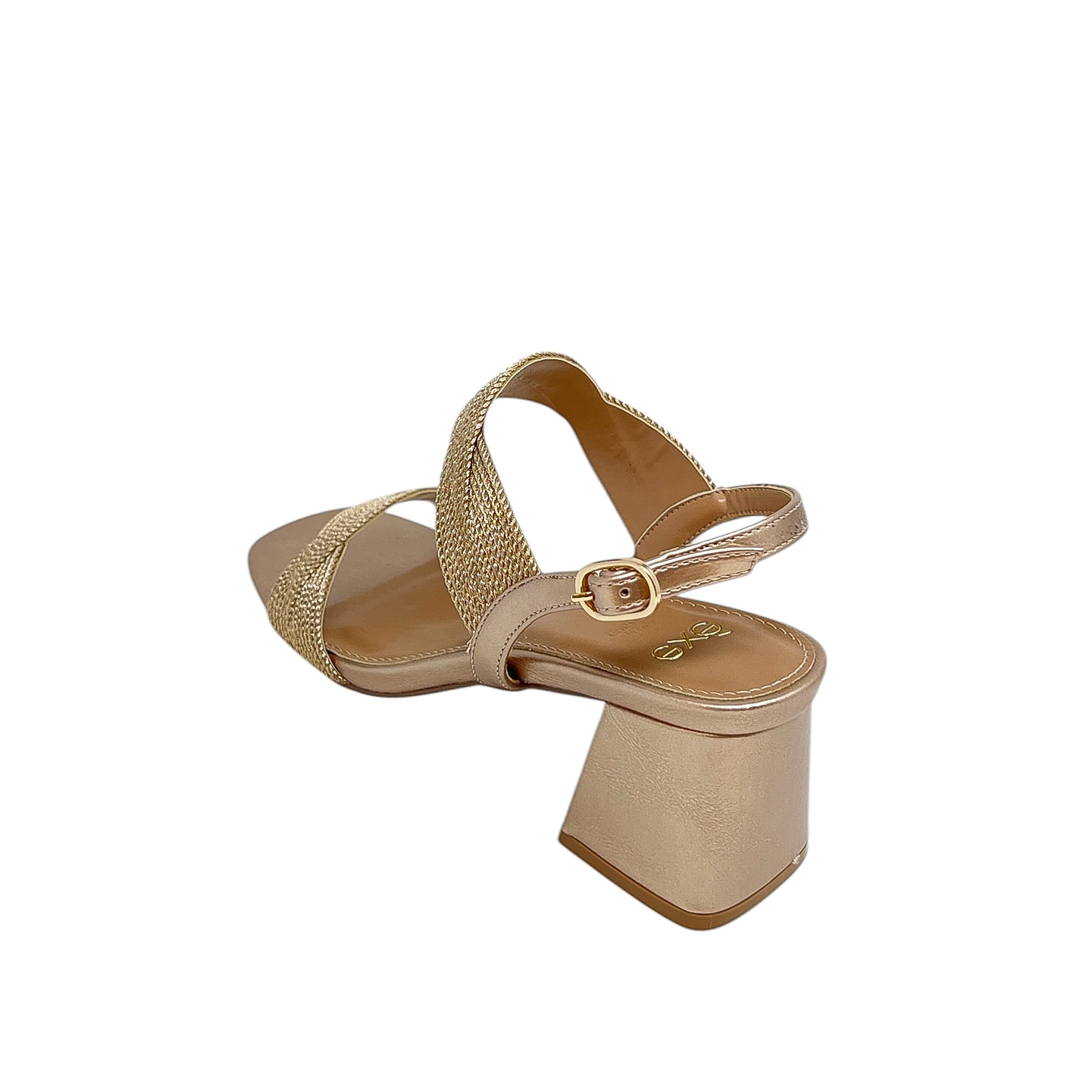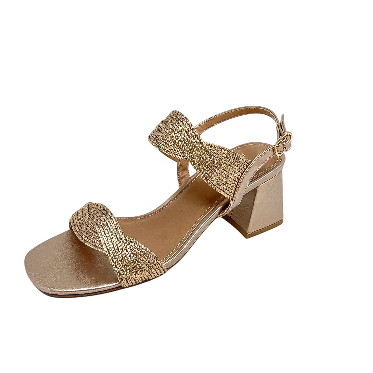 Sandalo in oro rosa con due fasce intrecciate e tacco grosso di 6 centimetri