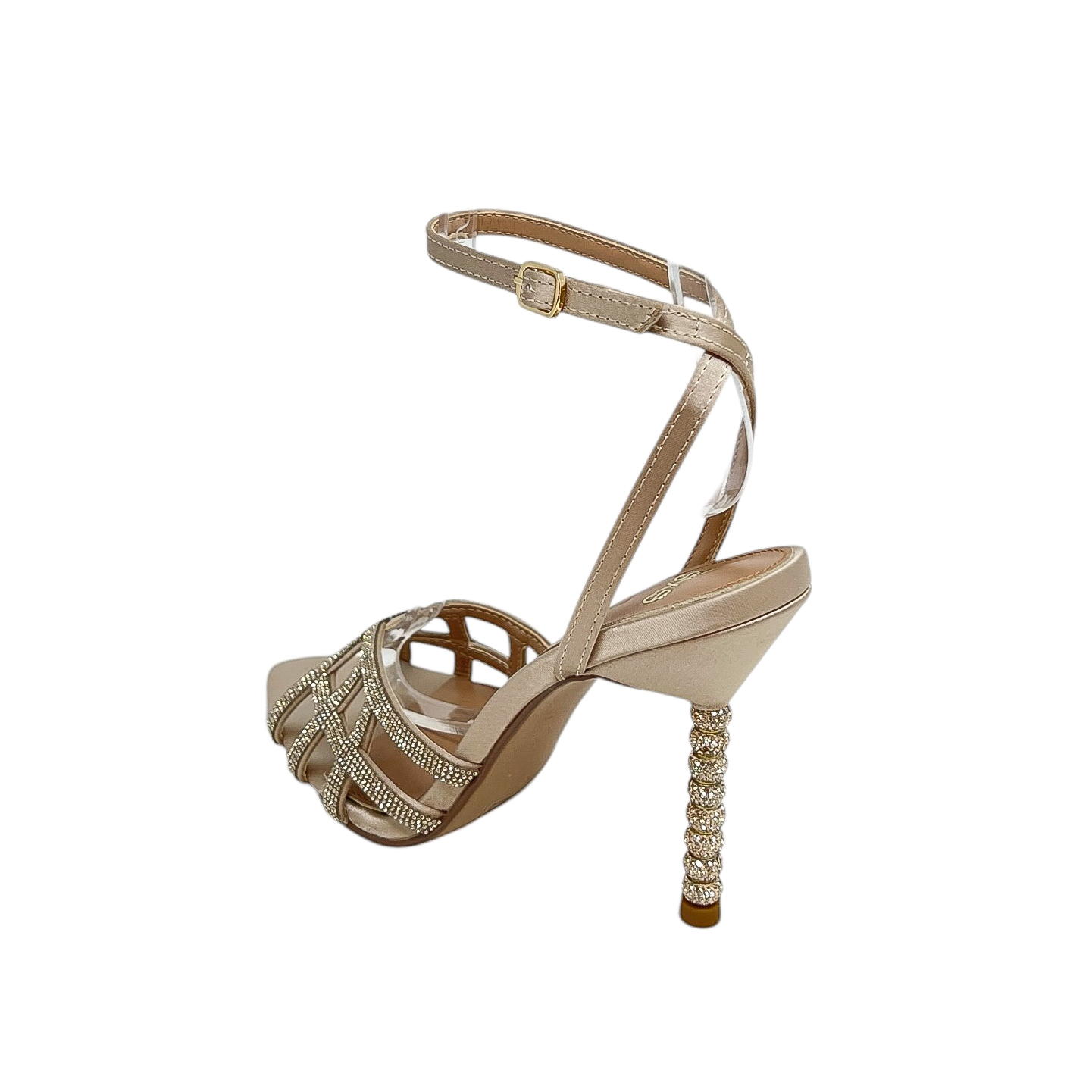 Sandalo a gabbia in strass champagne con cinturino alla caviglia e tacco di 10 centimetri