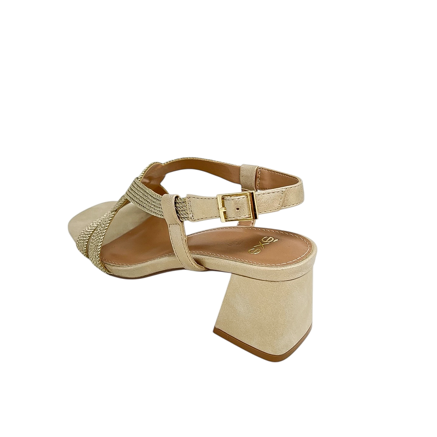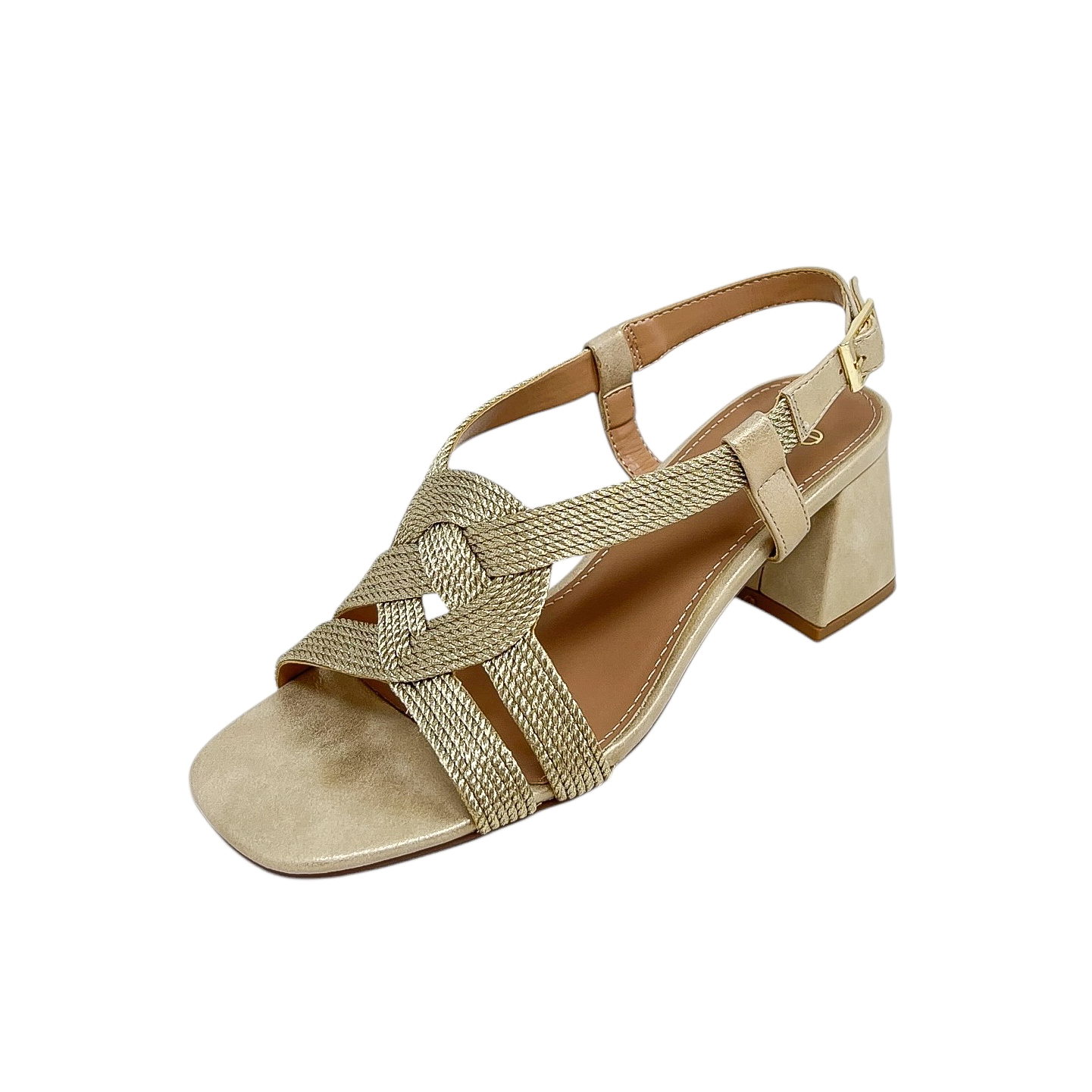 Sandalo incrociato in rafia oro con tacco grosso di 4 centimetri