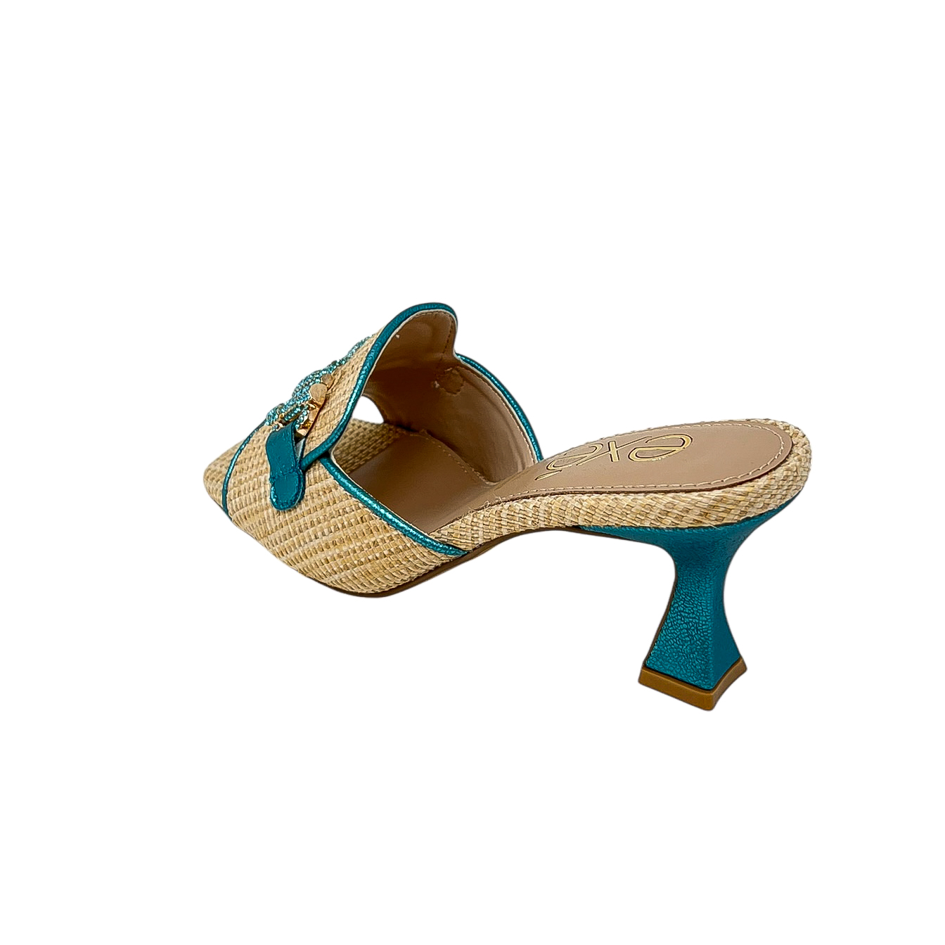 Ciabatta in rafia beige/rosa o beige/azzurro con morsetto in strass e tacco di 5 centimetri