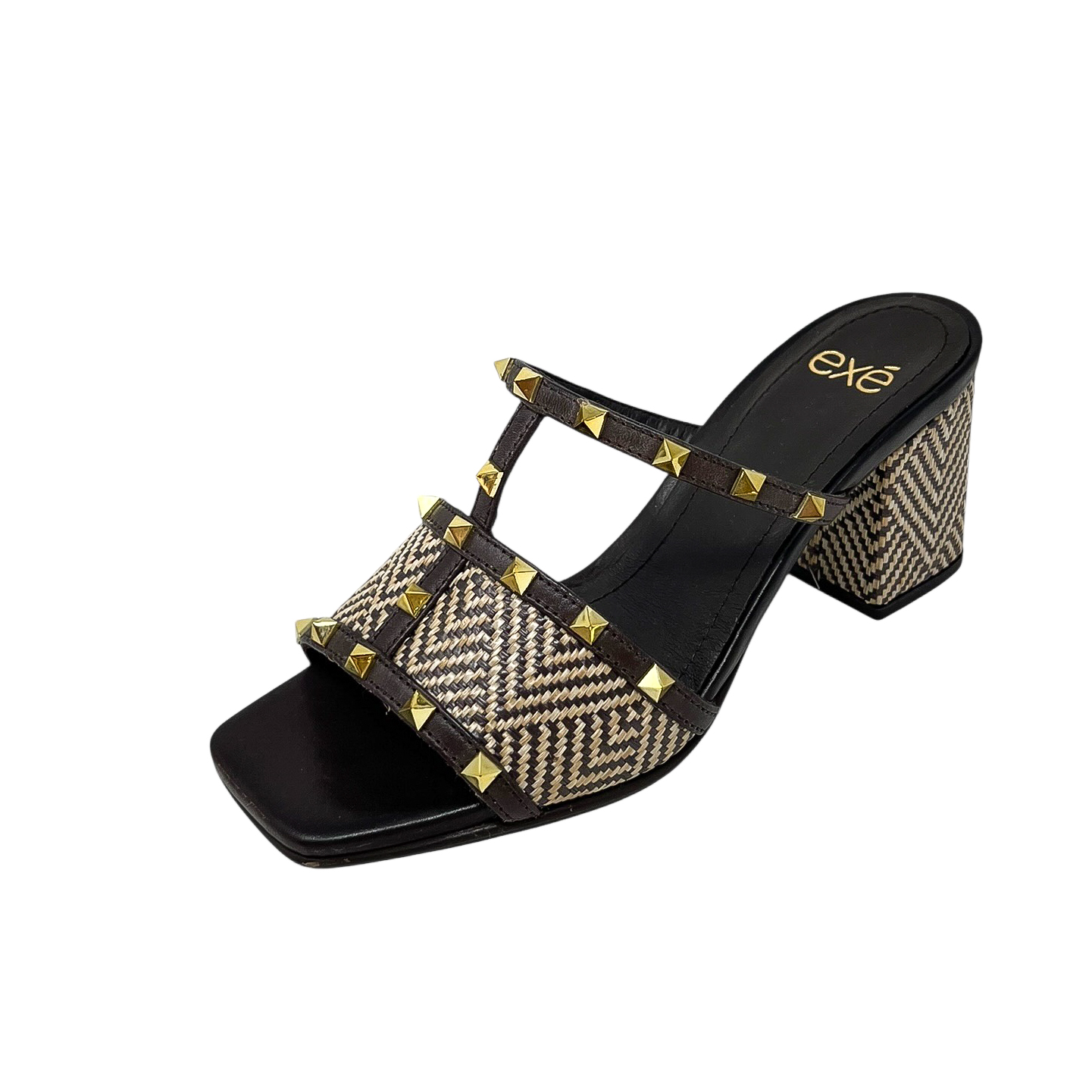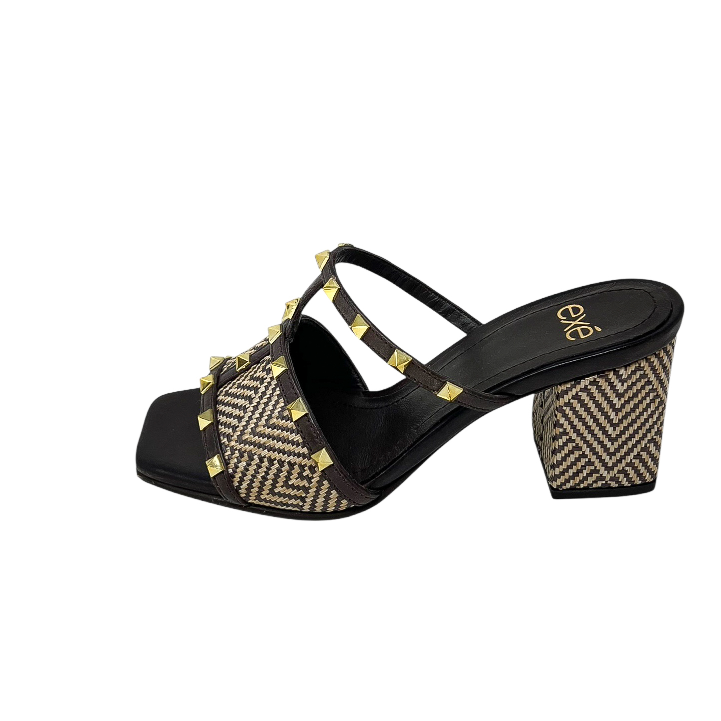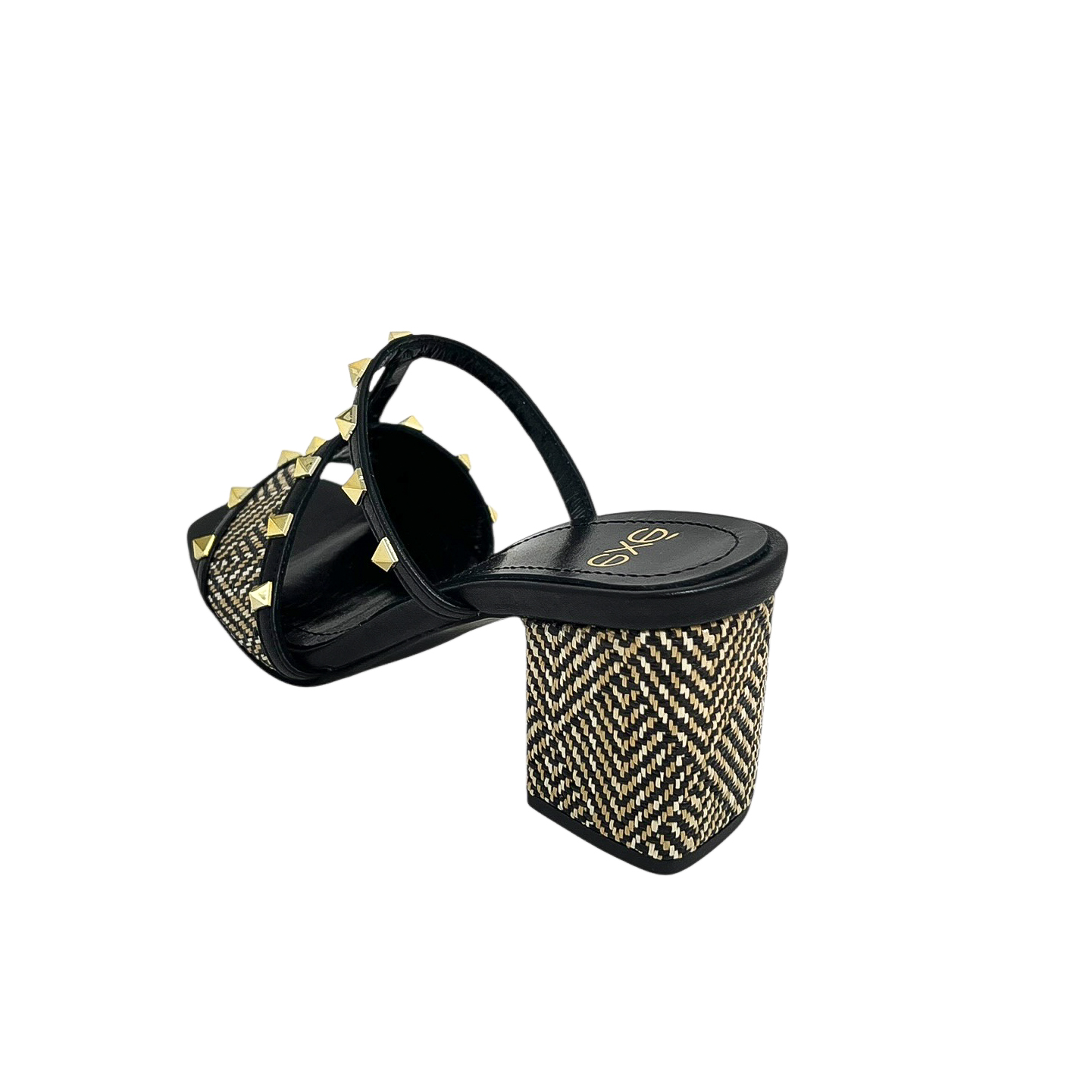 Ciabatta con fascia in rafia e borchiette nera o marrone con tacco grosso di 5 centimetri
