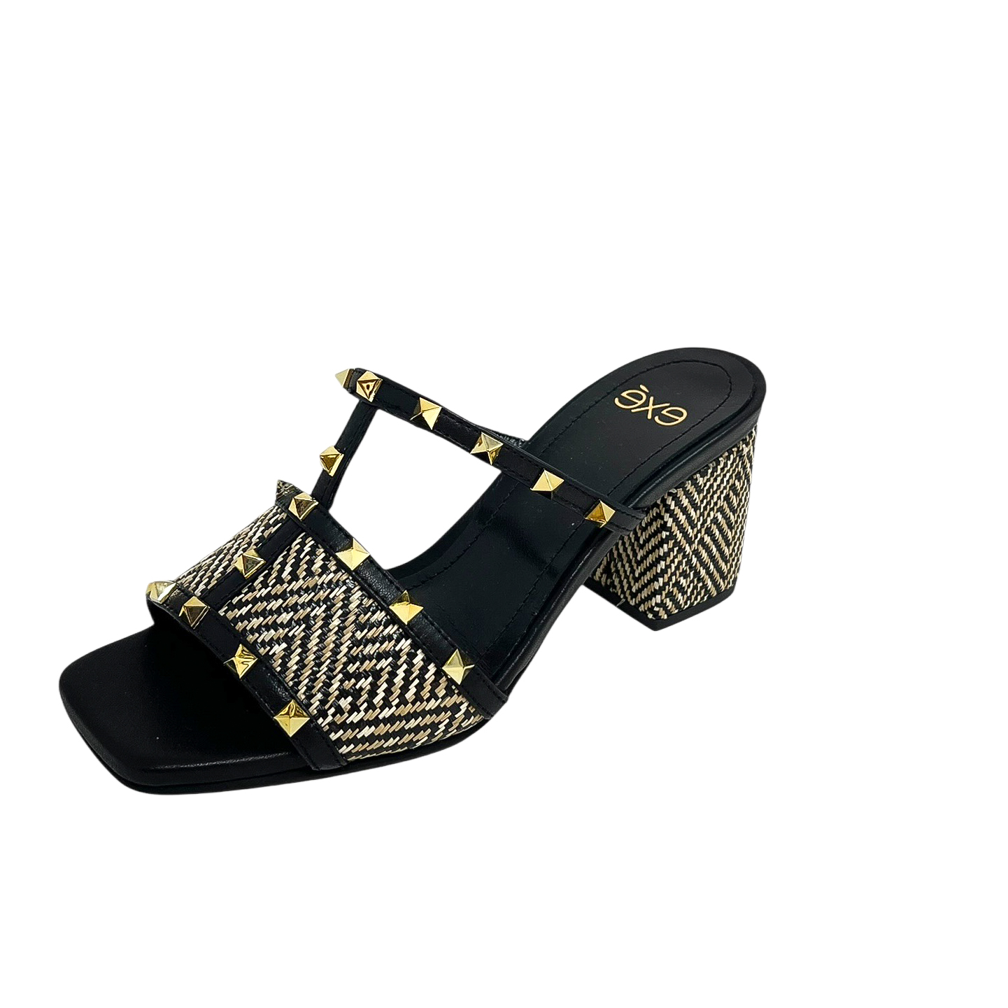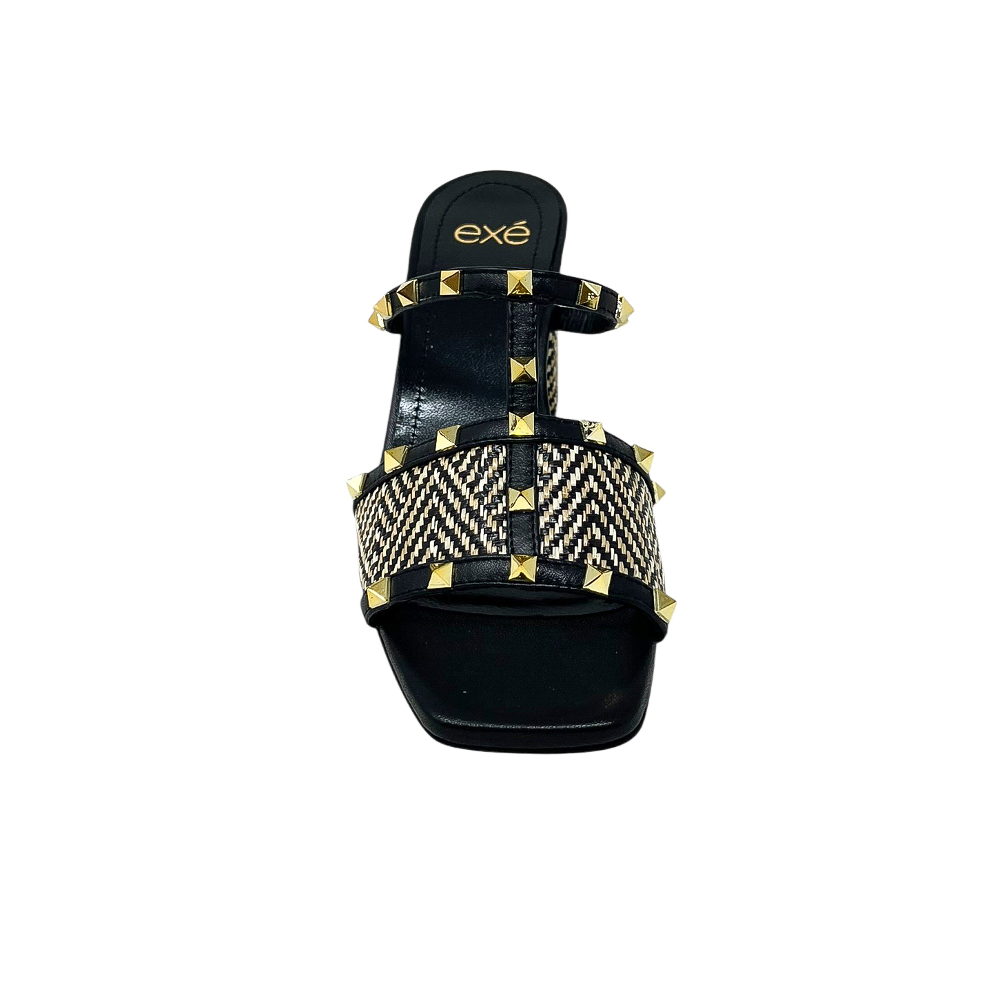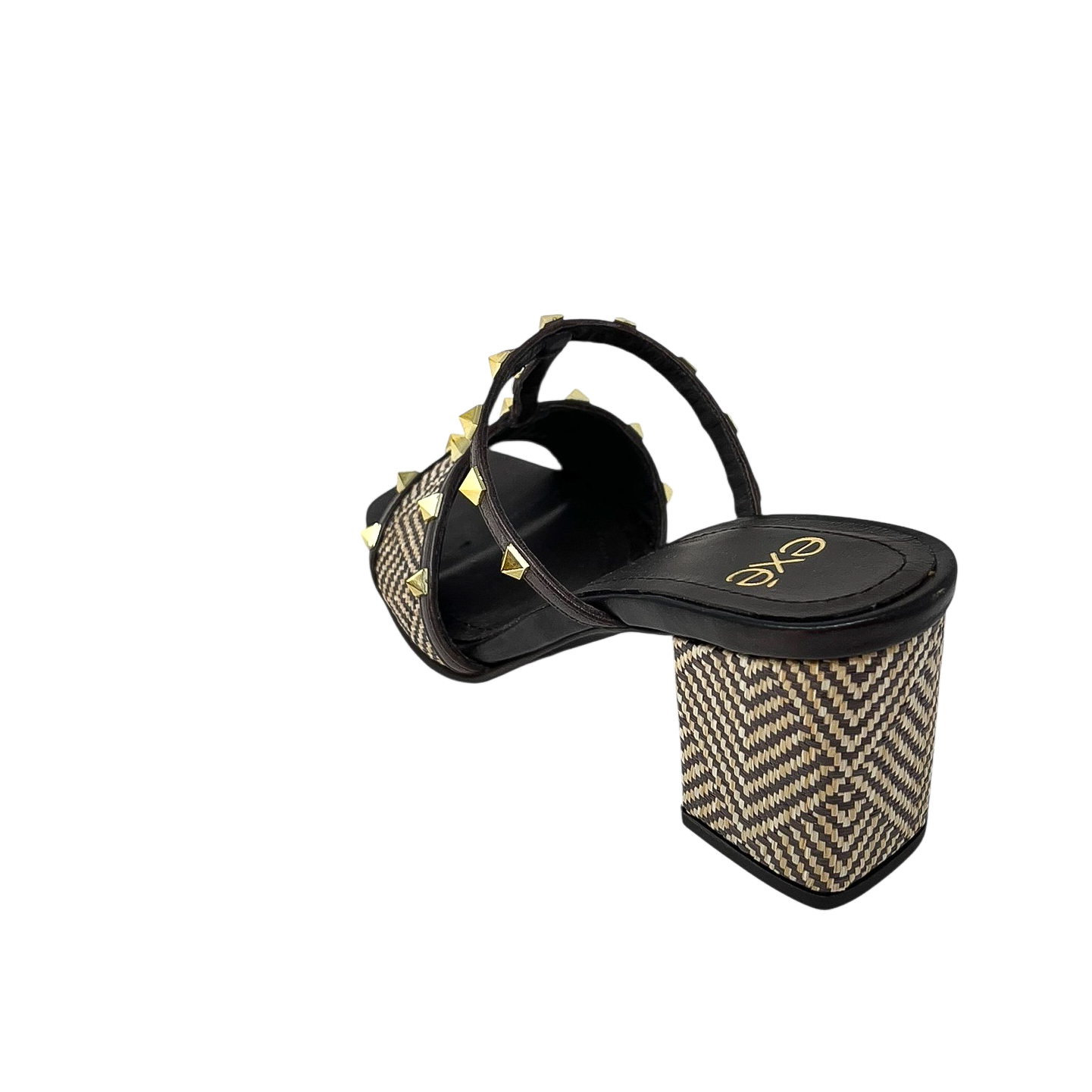 Ciabatta con fascia in rafia e borchiette nera o marrone con tacco grosso di 5 centimetri