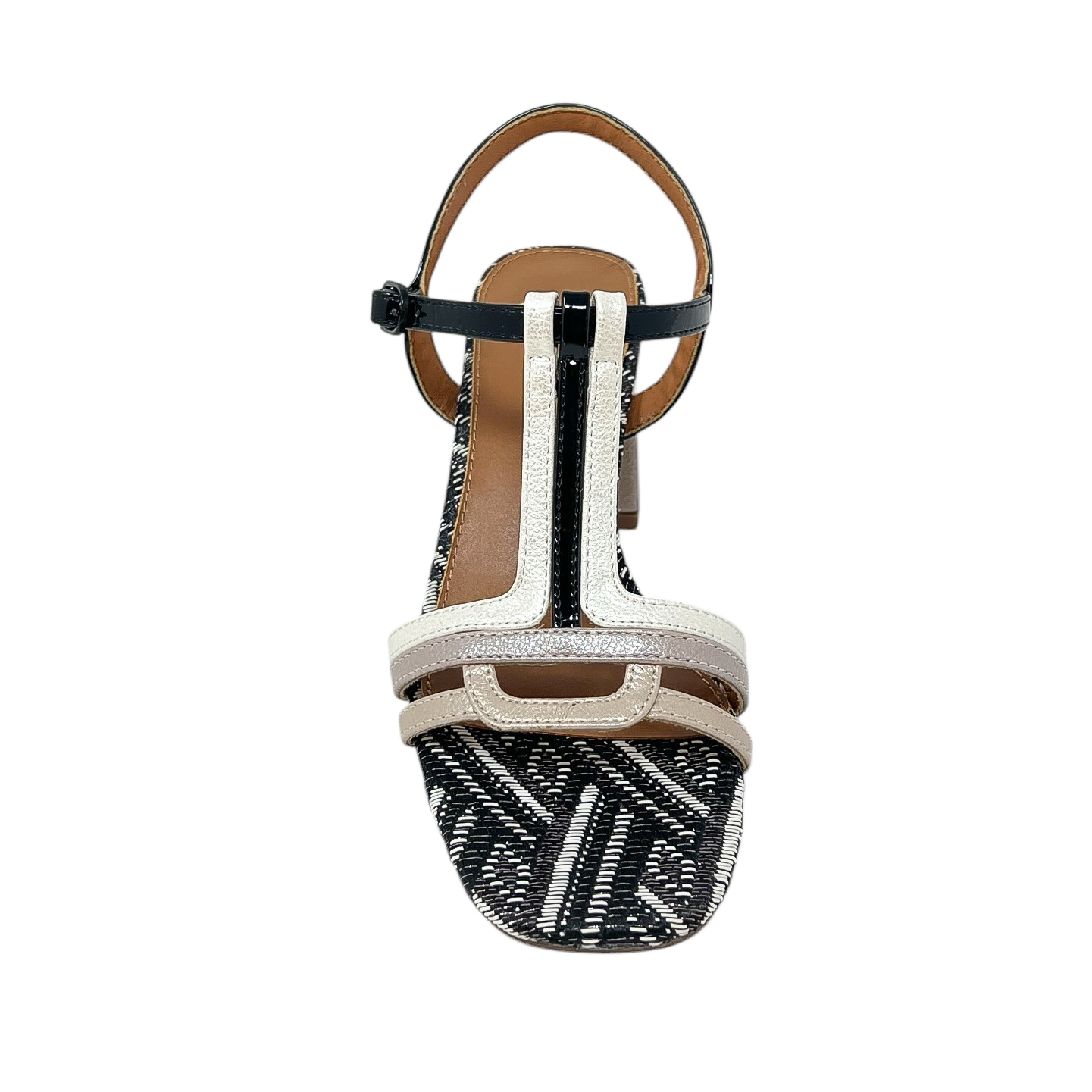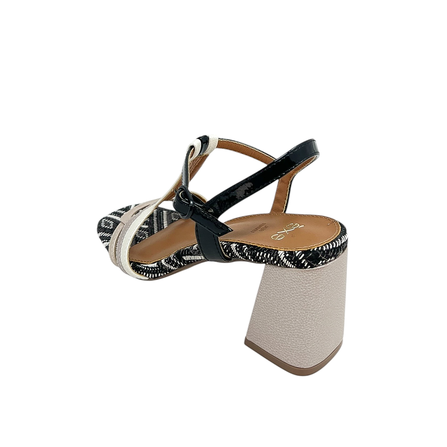Sandalo etnico cipria/bianco/nero con tacco grosso di 7 centimetri