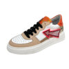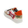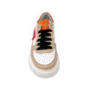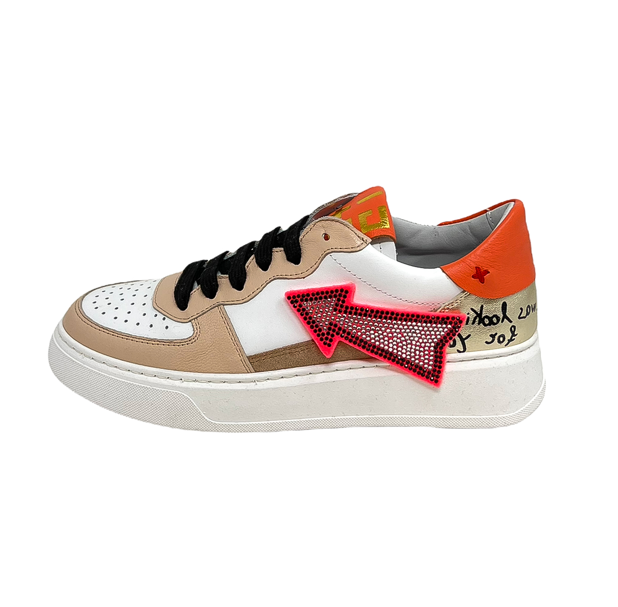 Sneaker in pelle bianca e beige con freccia laterale fuxia e cuore sull’altro piede fuxia
