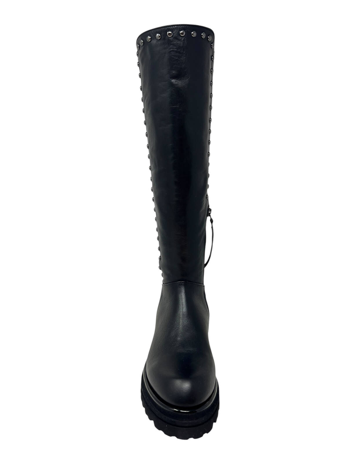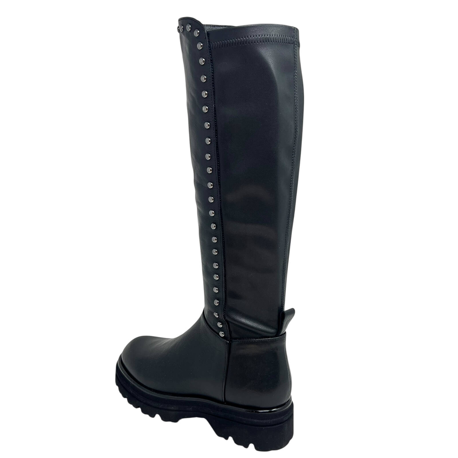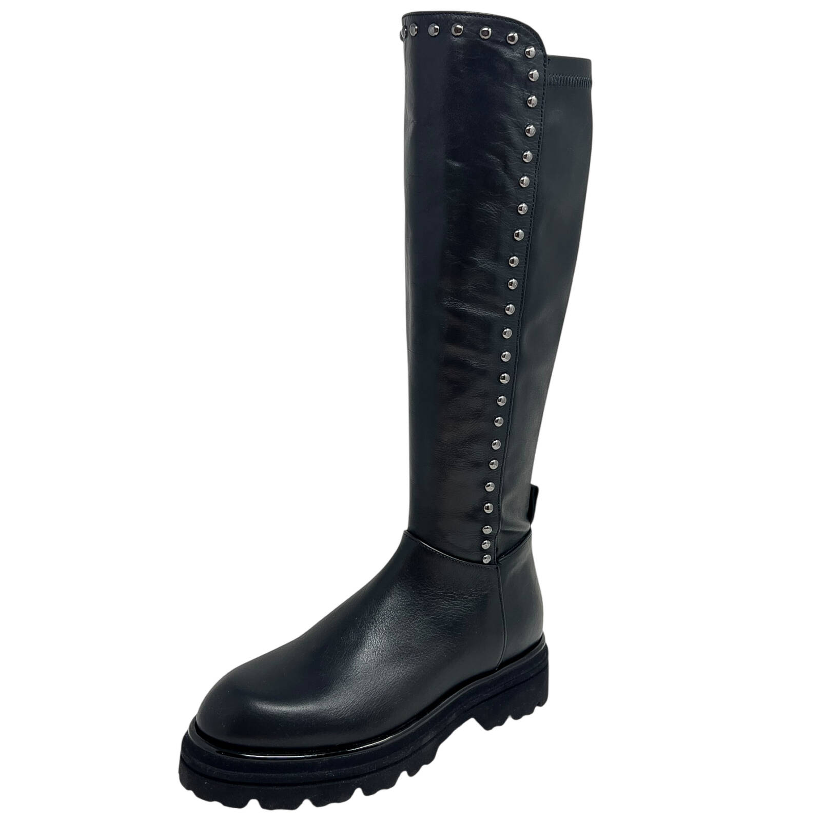 Stivale in pelle nero con polpaccio elasticizzato e borchiette piombo