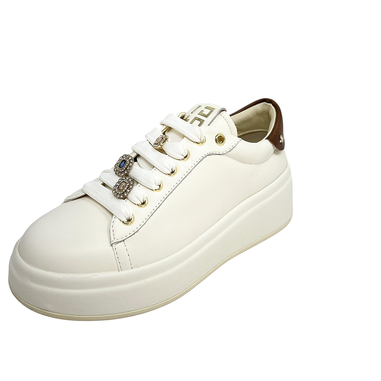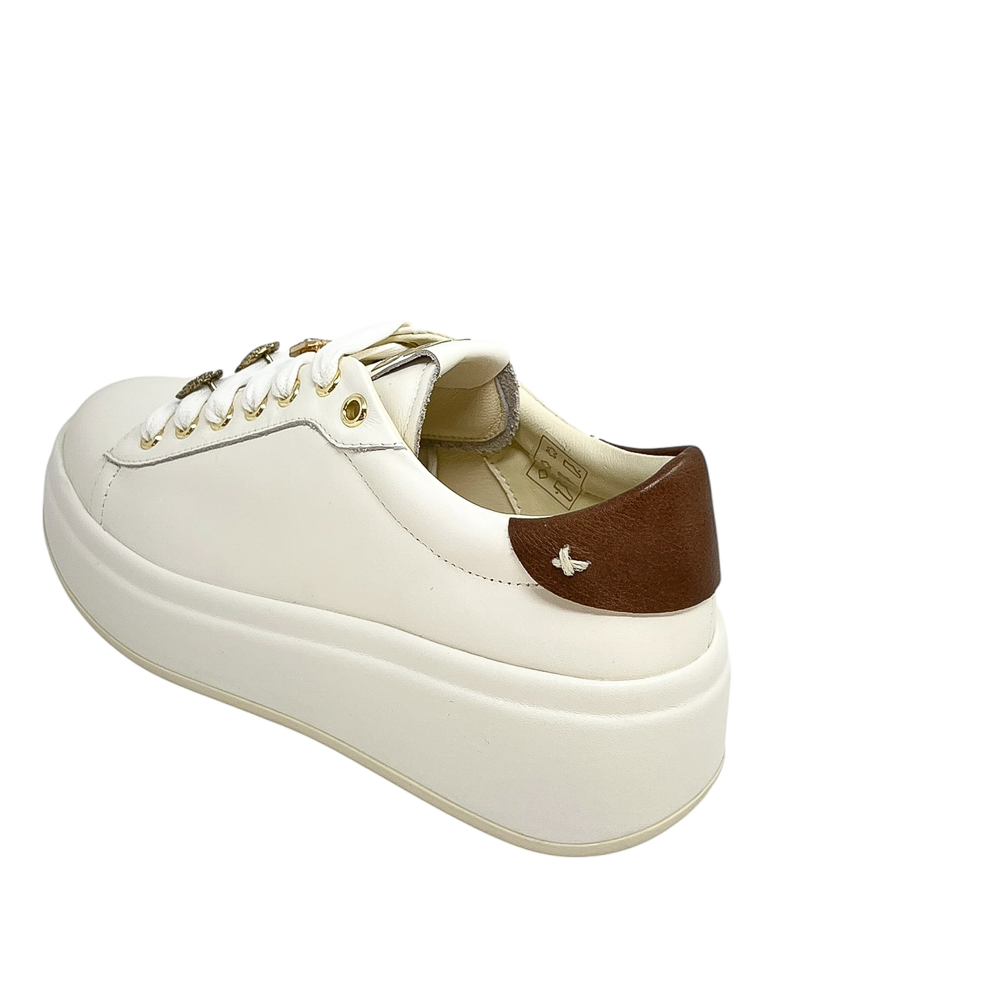 Sneaker in pelle panna con charms tallone color cammello .Suola di 3 centimetri