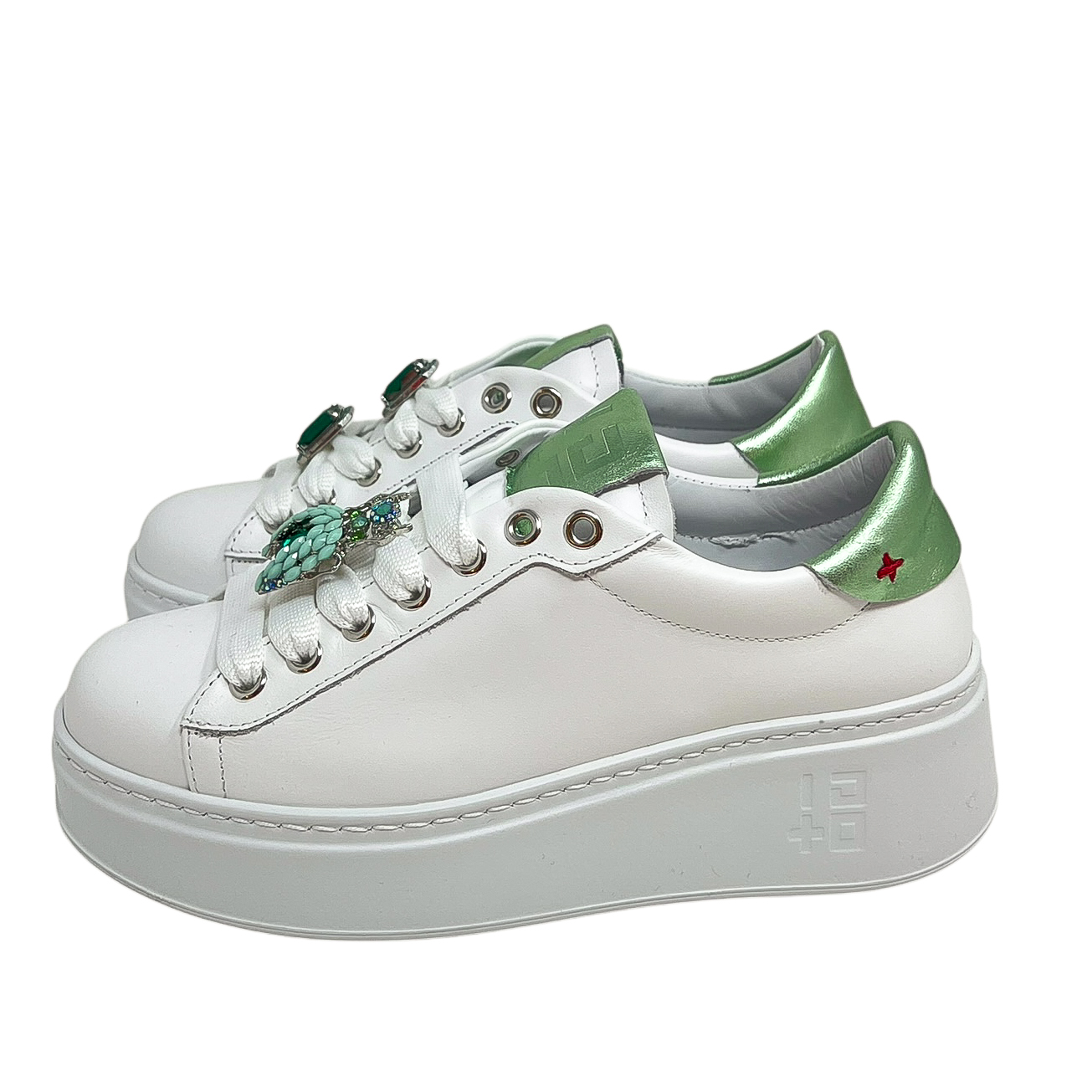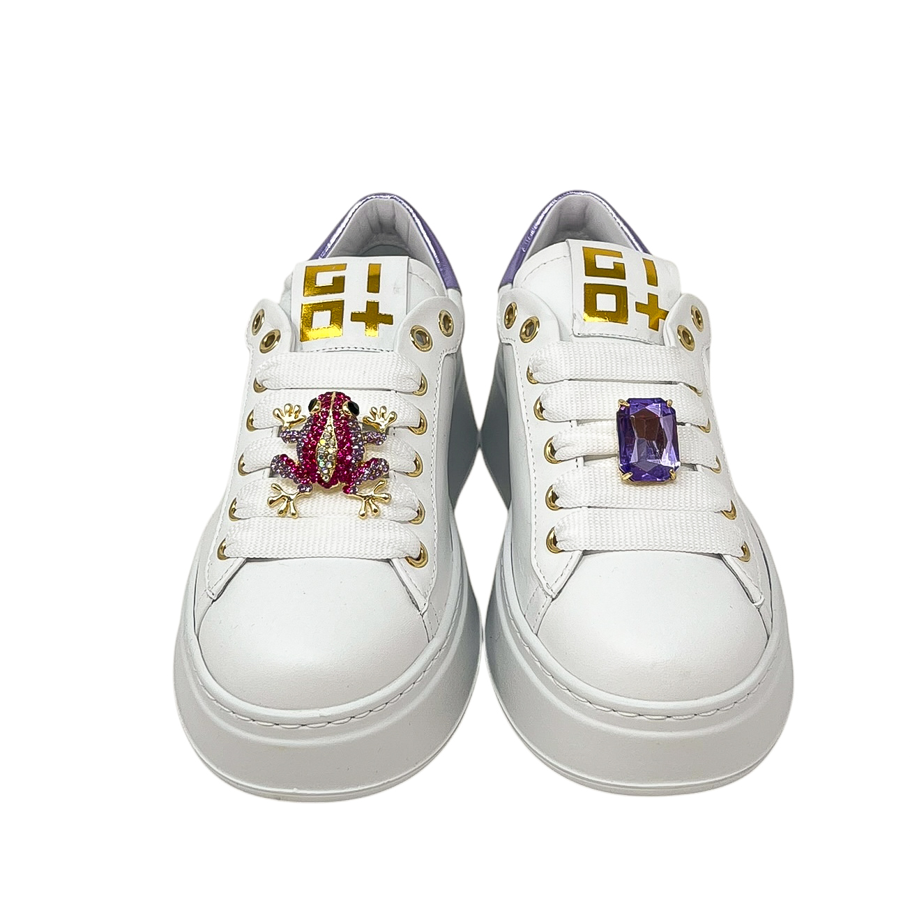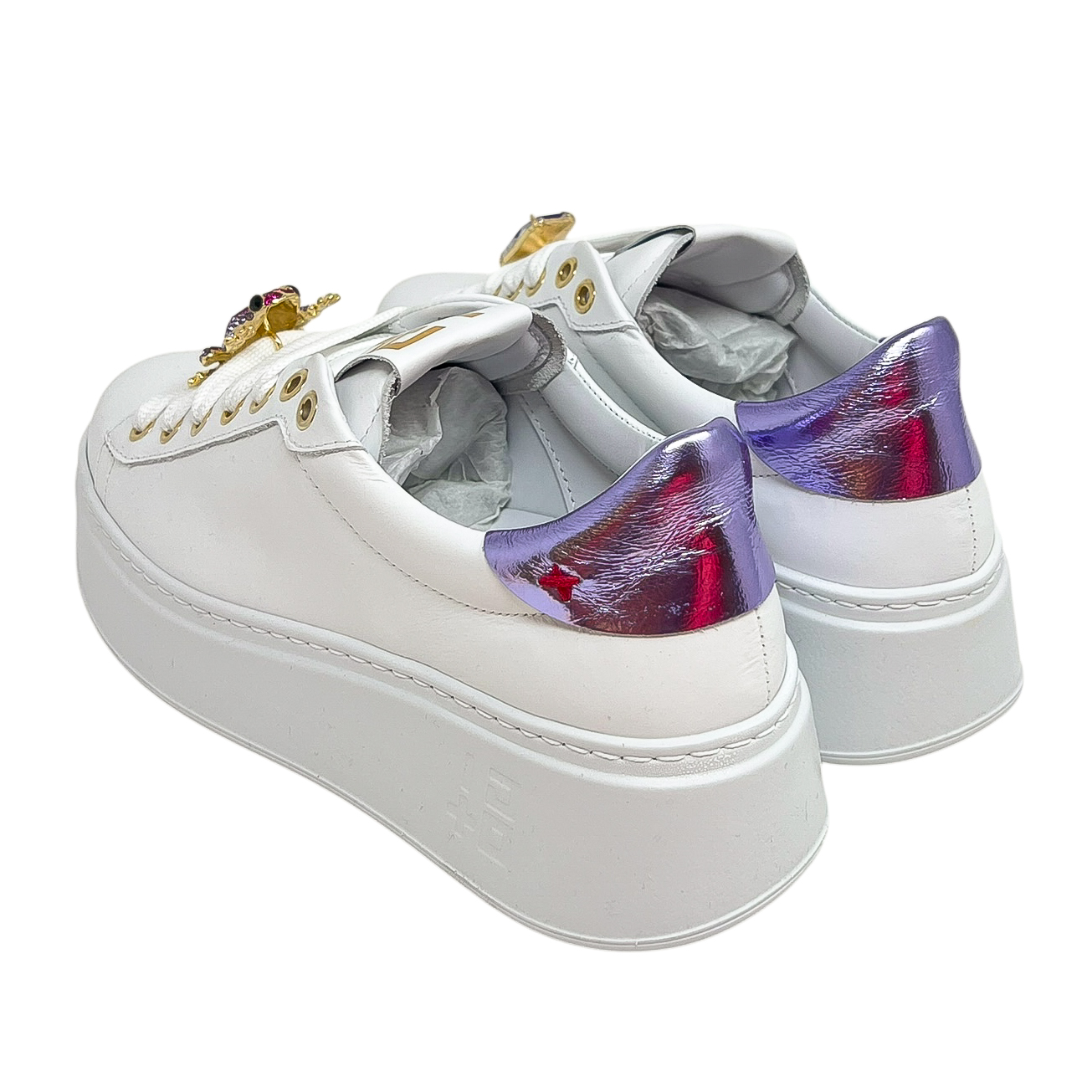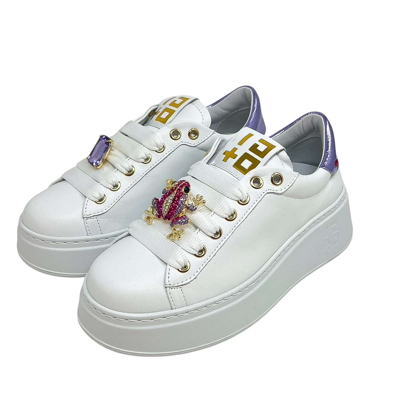 Sneaker in pelle bianca con dettagli lilla e accessori sui lacci a rana.Suola di 3 centimetri