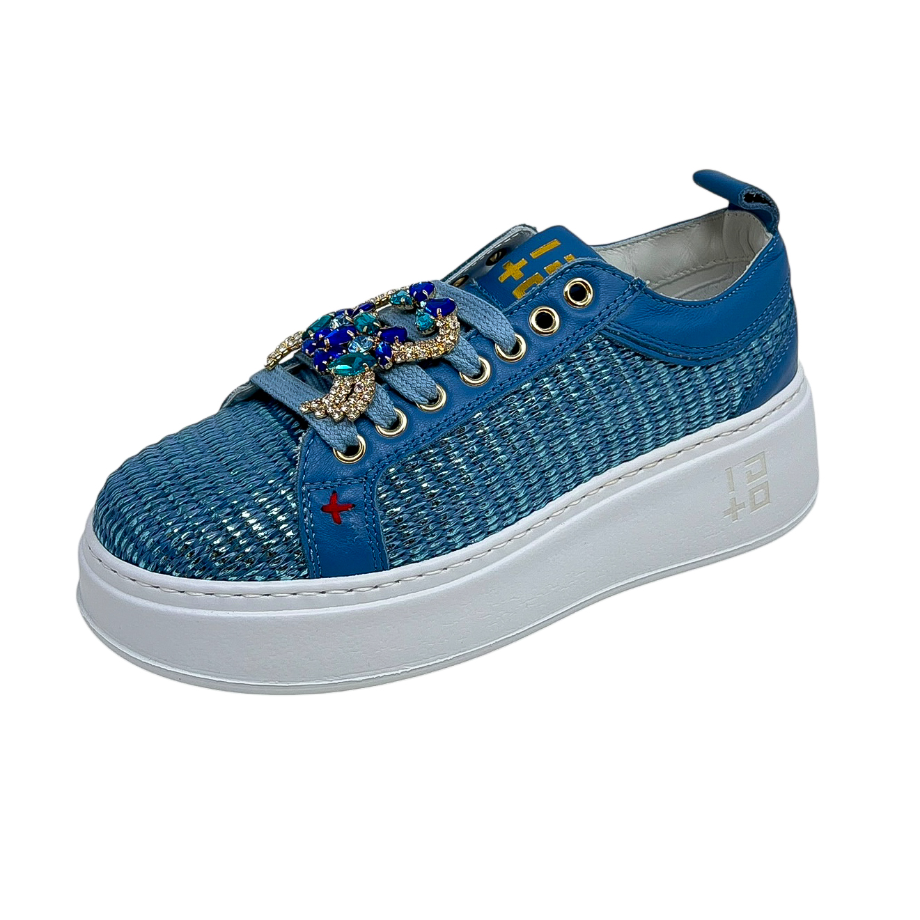 Sneaker in rafia azzurra con accessorio a granchio sui lacci. Suola di 3 centimetri
