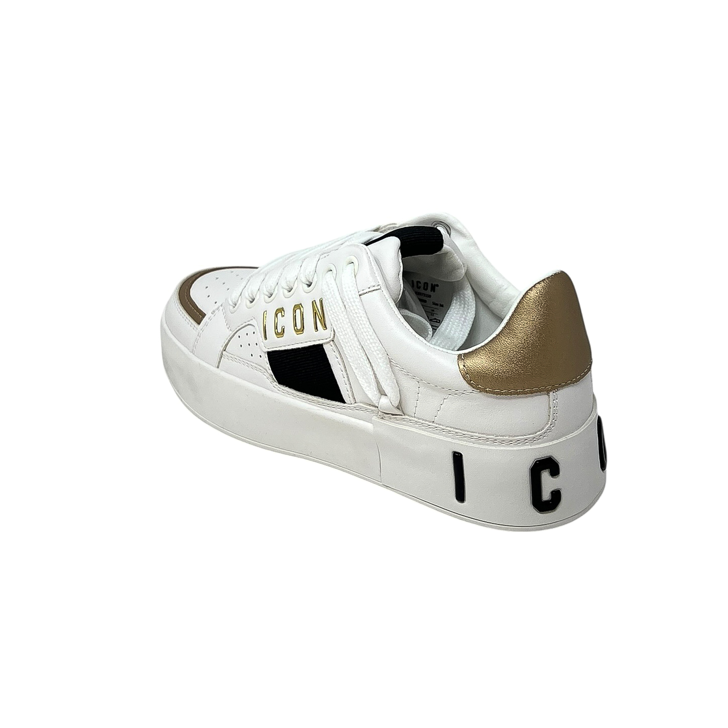 Sneaker bianca con dettagli oro e neri. Suola di 2 centimetri