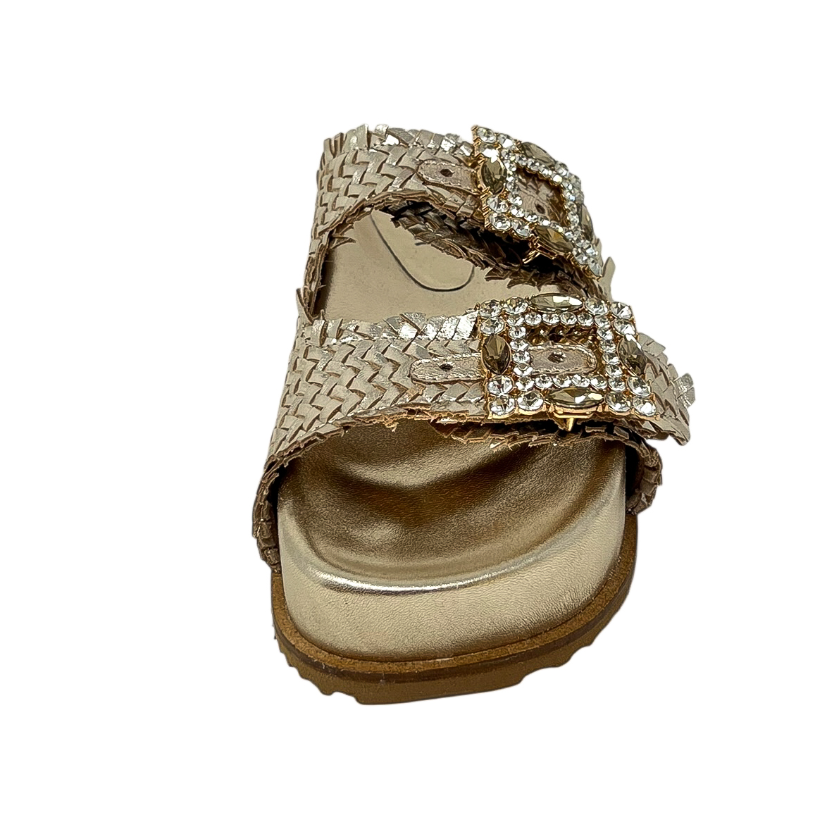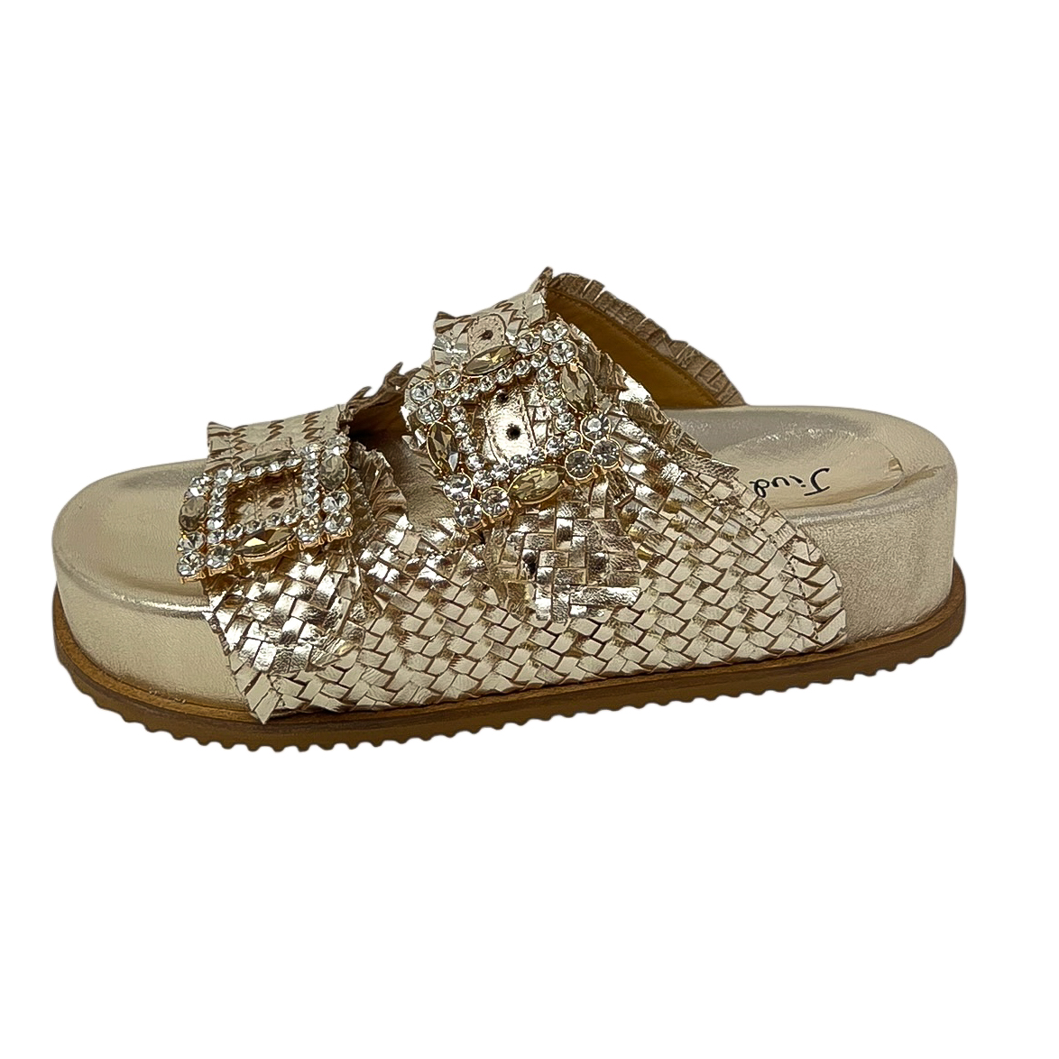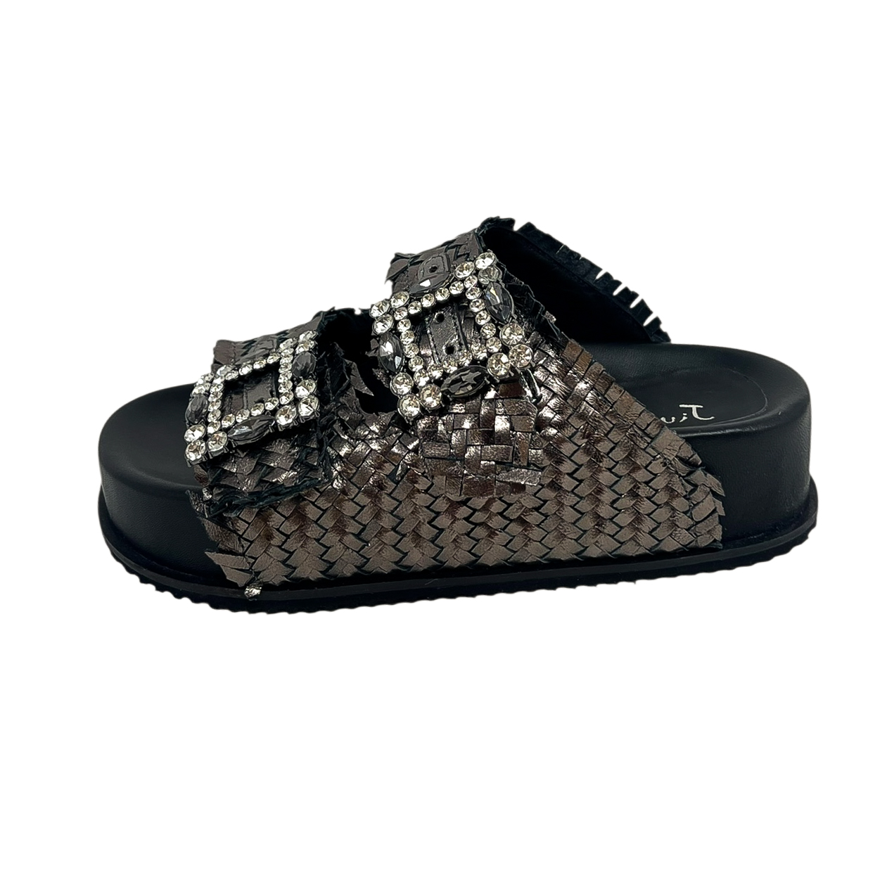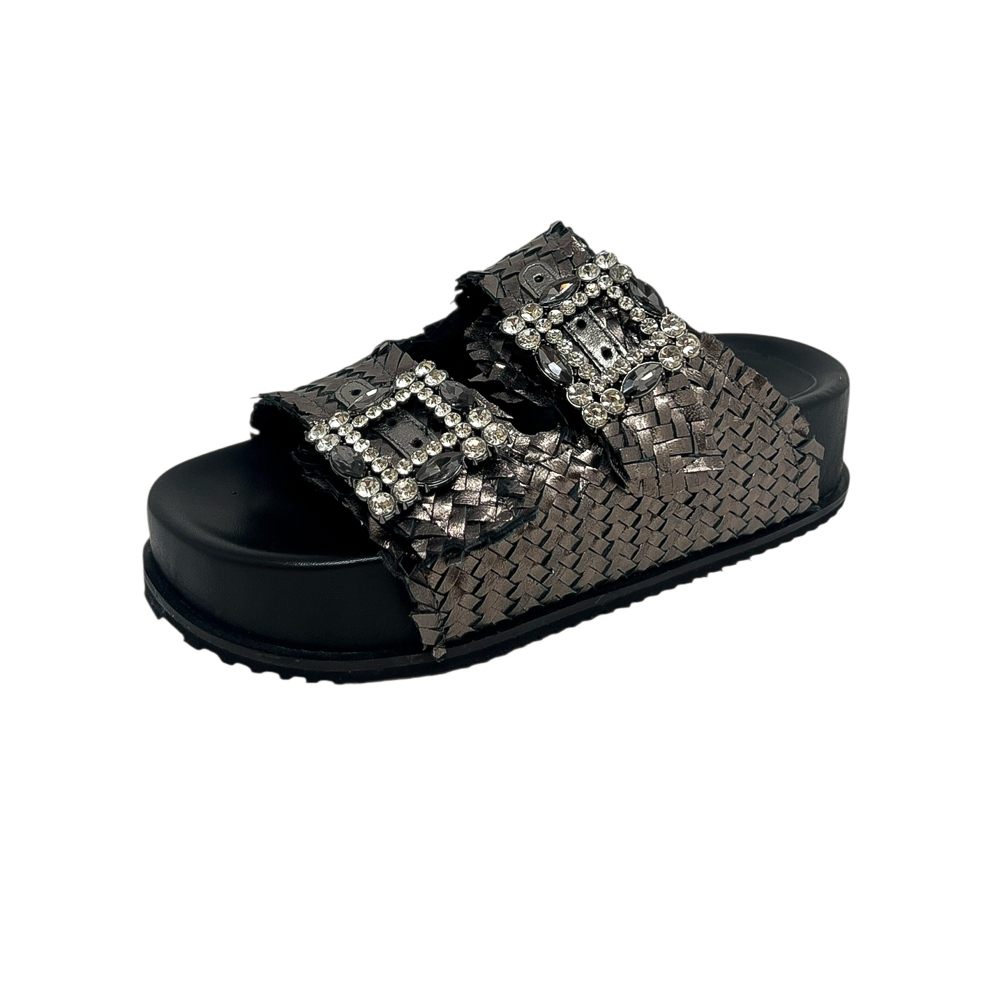 Ciabatta con due fasce intrecciate nero, oro o bianco, due fibbie in strass e zeppa di 3 centimetri