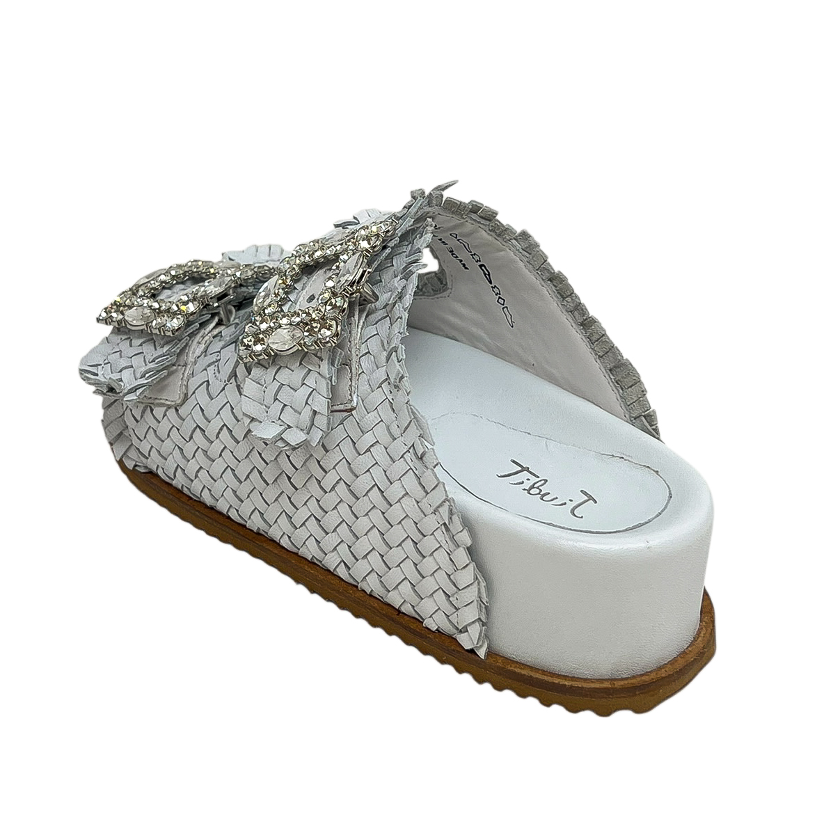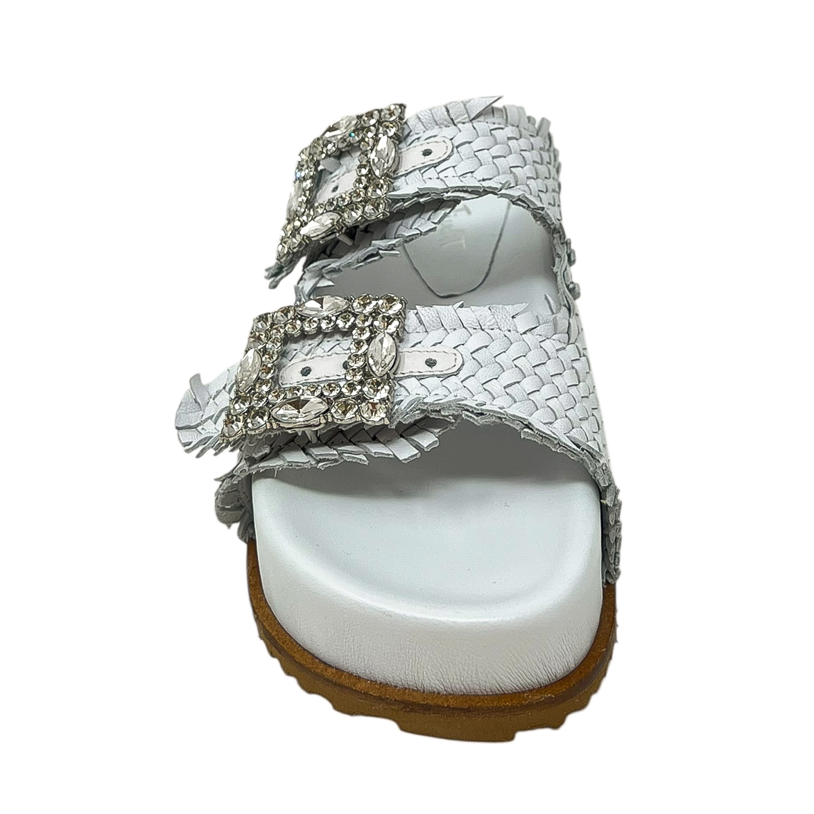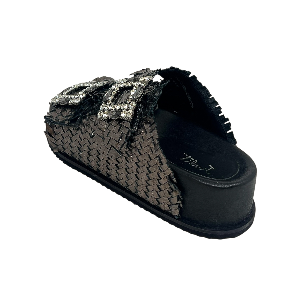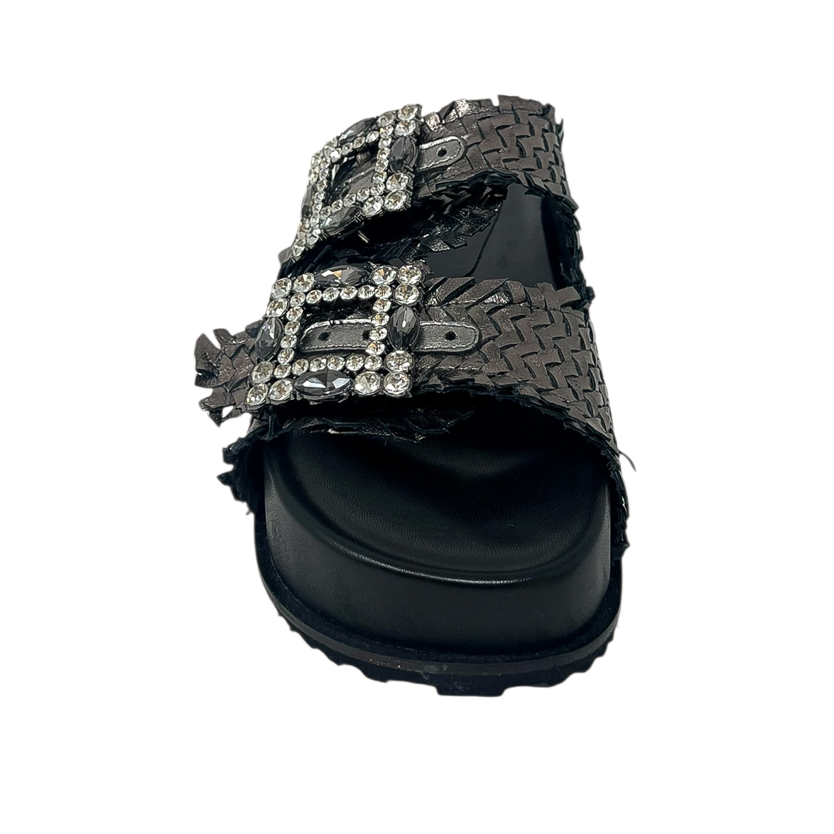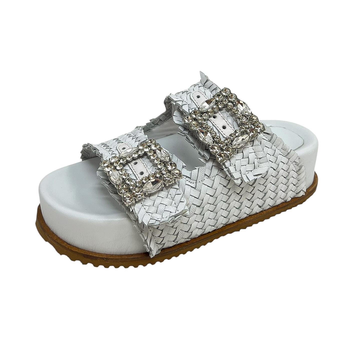 Ciabatta con due fasce intrecciate nero, oro o bianco, due fibbie in strass e zeppa di 3 centimetri