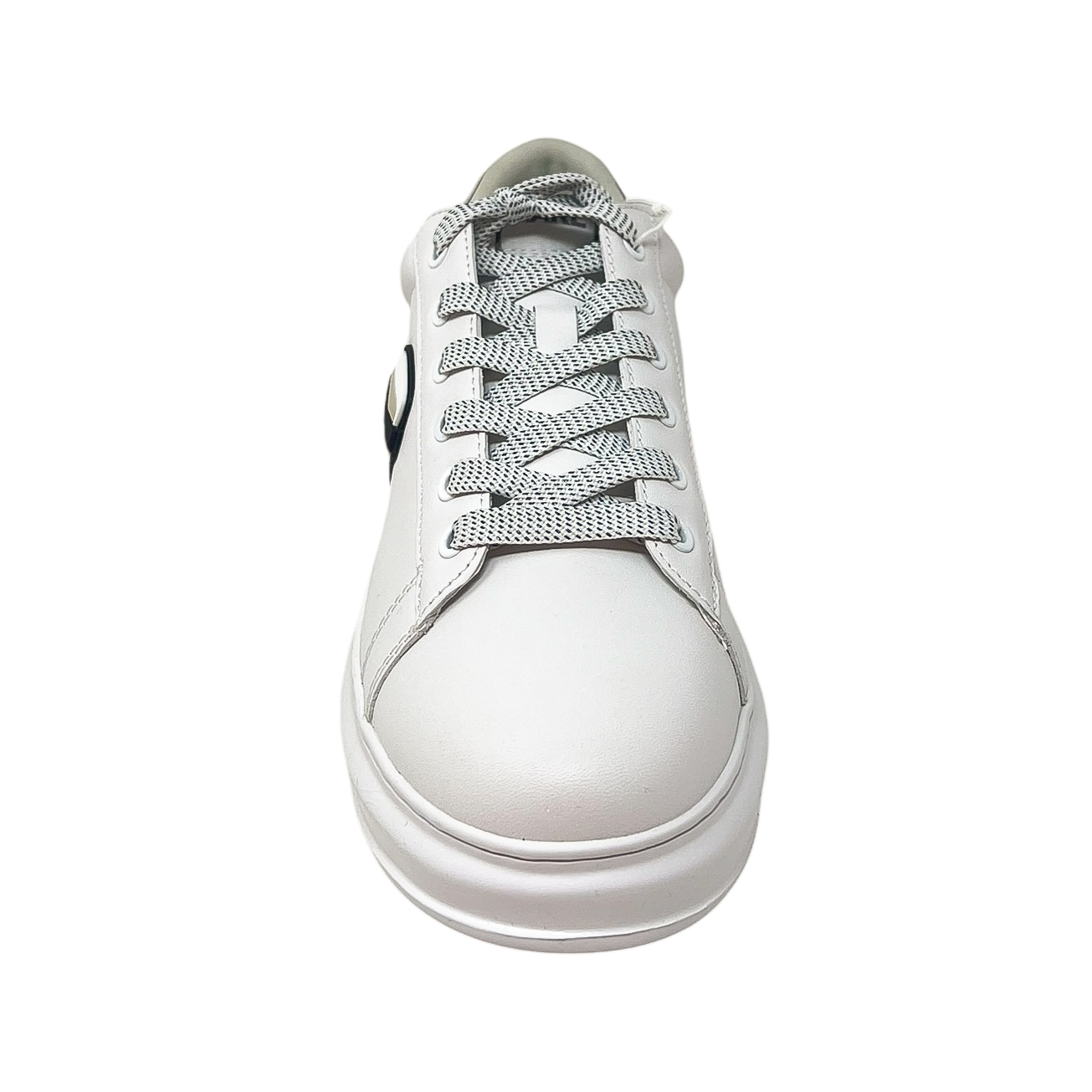 Sneaker in pelle bianca con omino laterale e tallone piombo. Suola di 2 centimetri