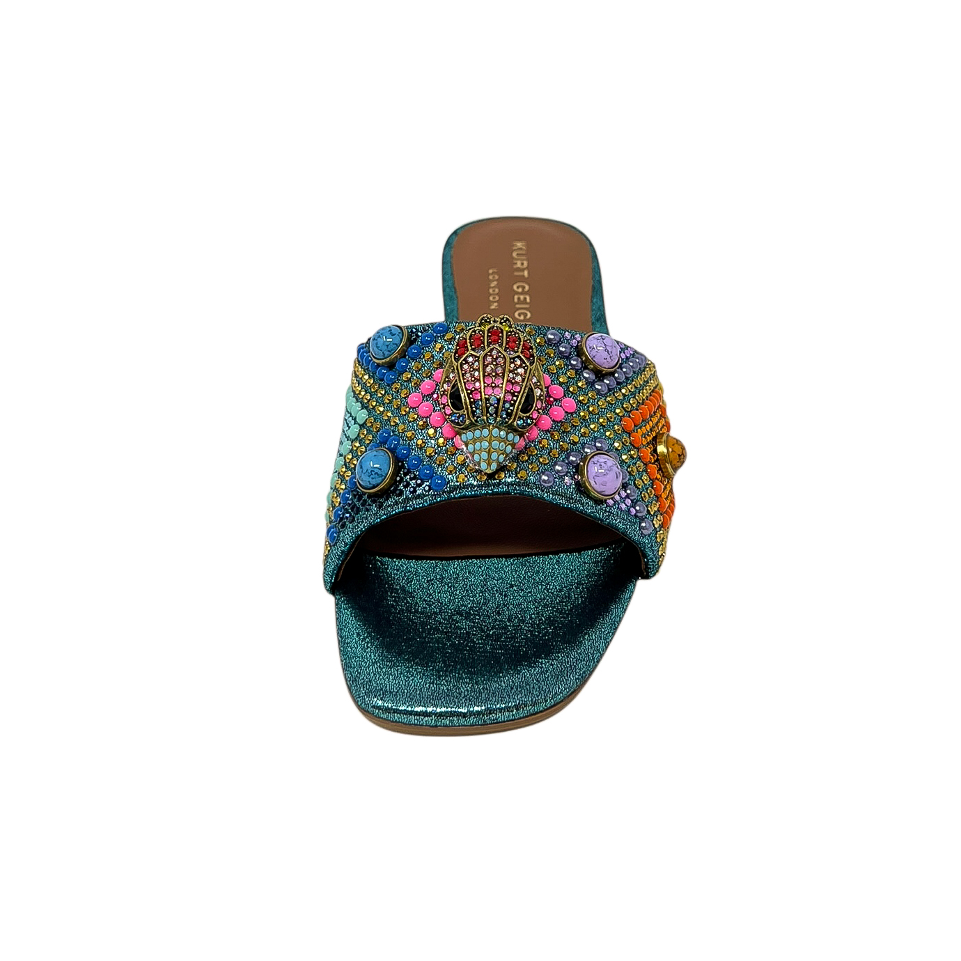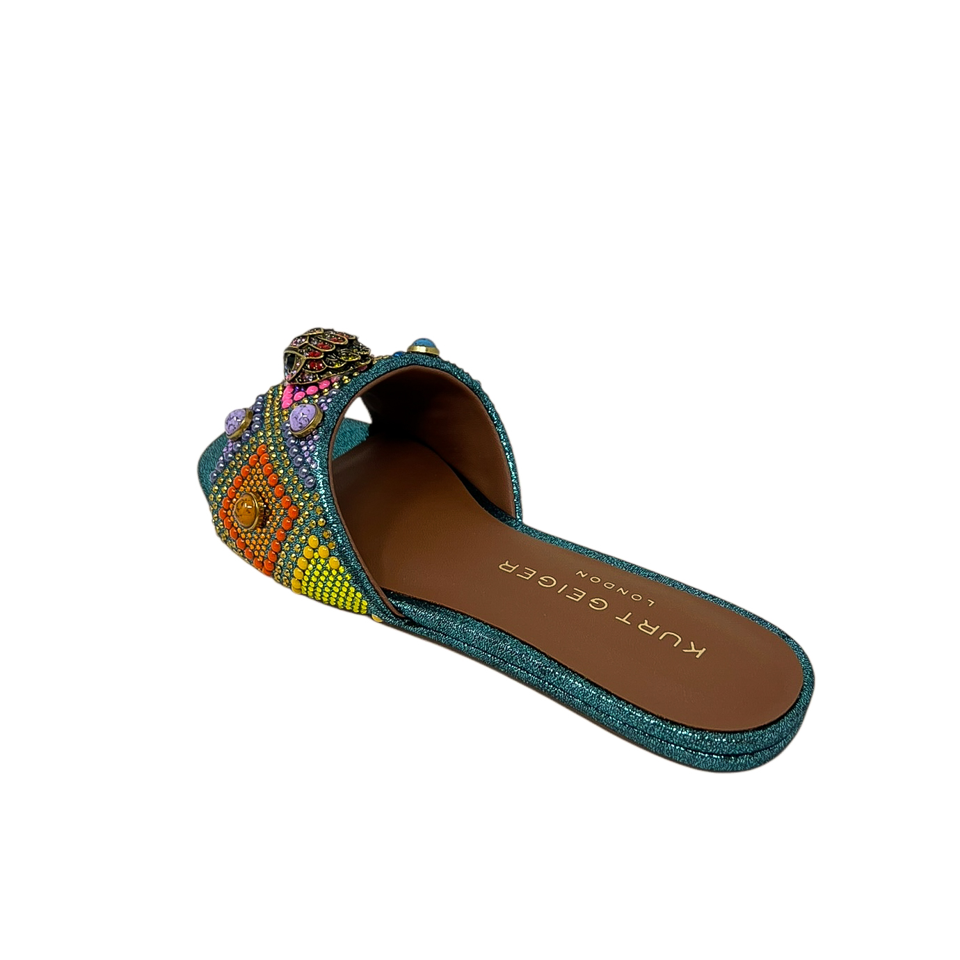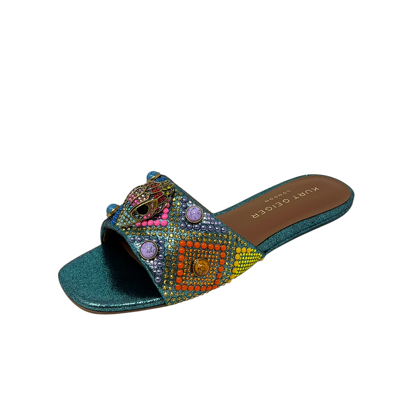 Ciabatta con fascia in pietre e strass multicolor e accessorio aquila