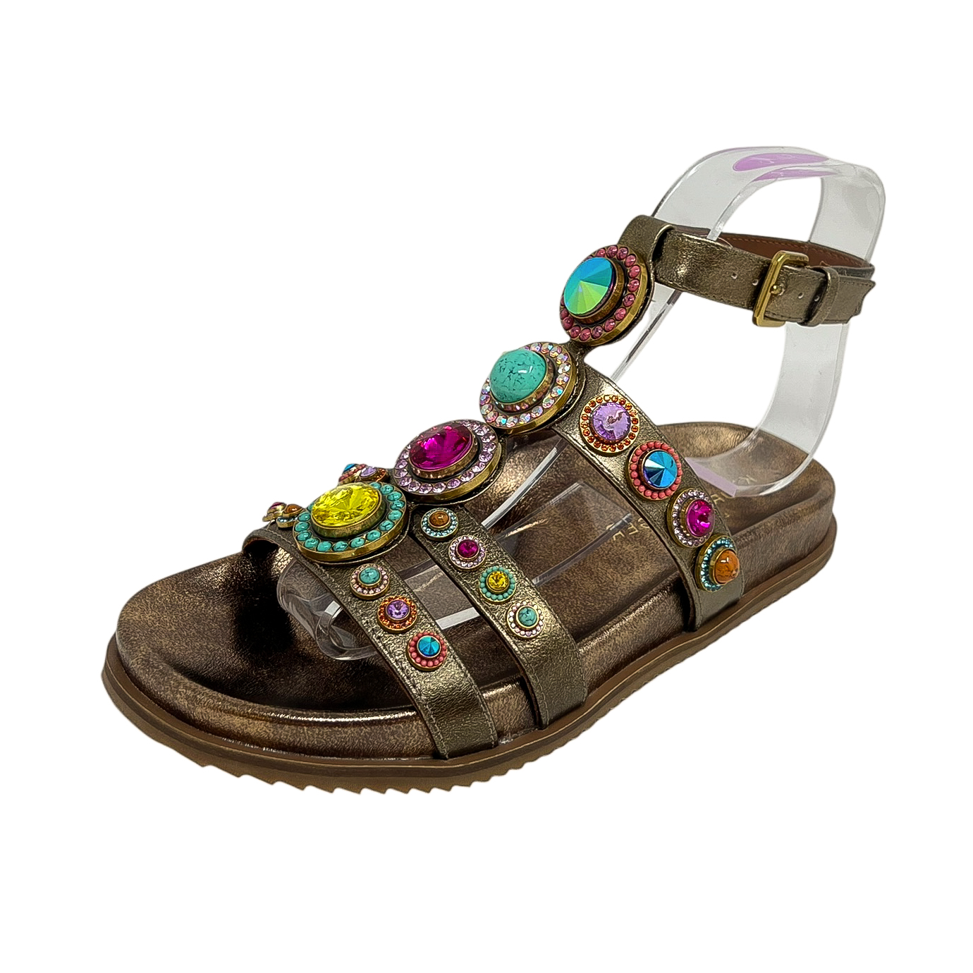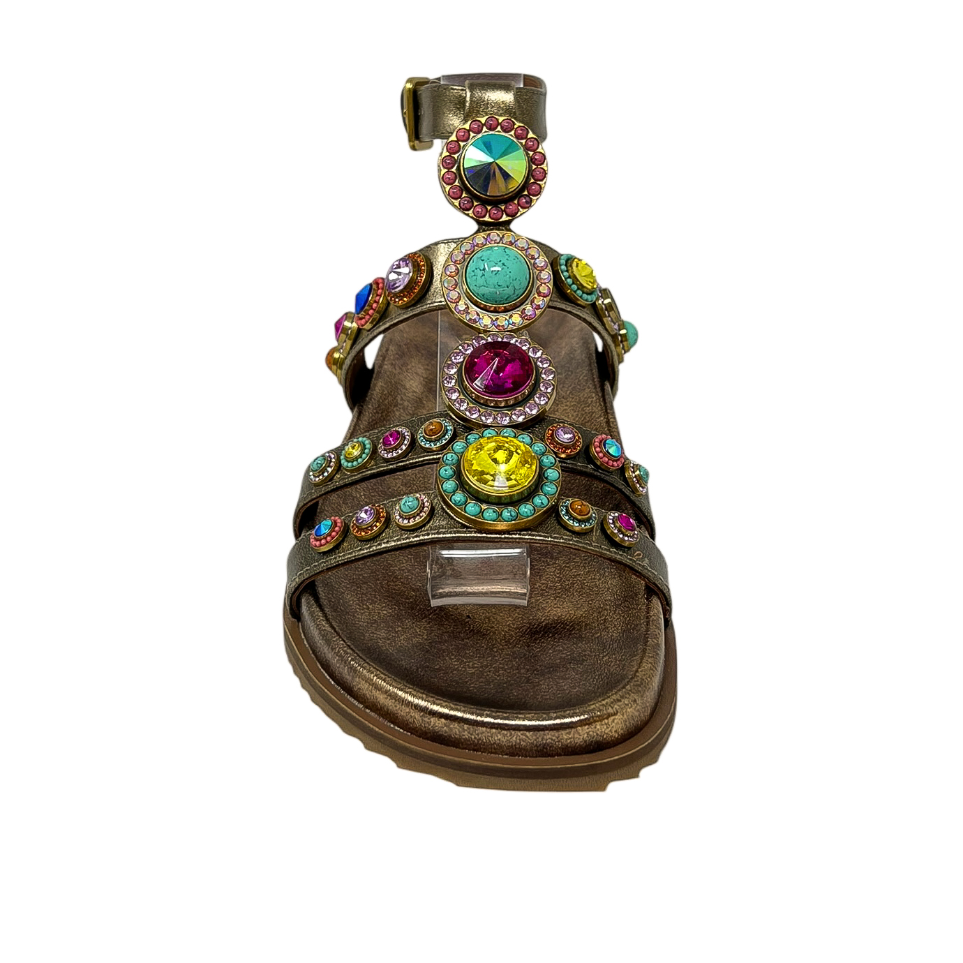 Sandalo oro metallizzato con pietre grosse multicolor e suola in fussbett