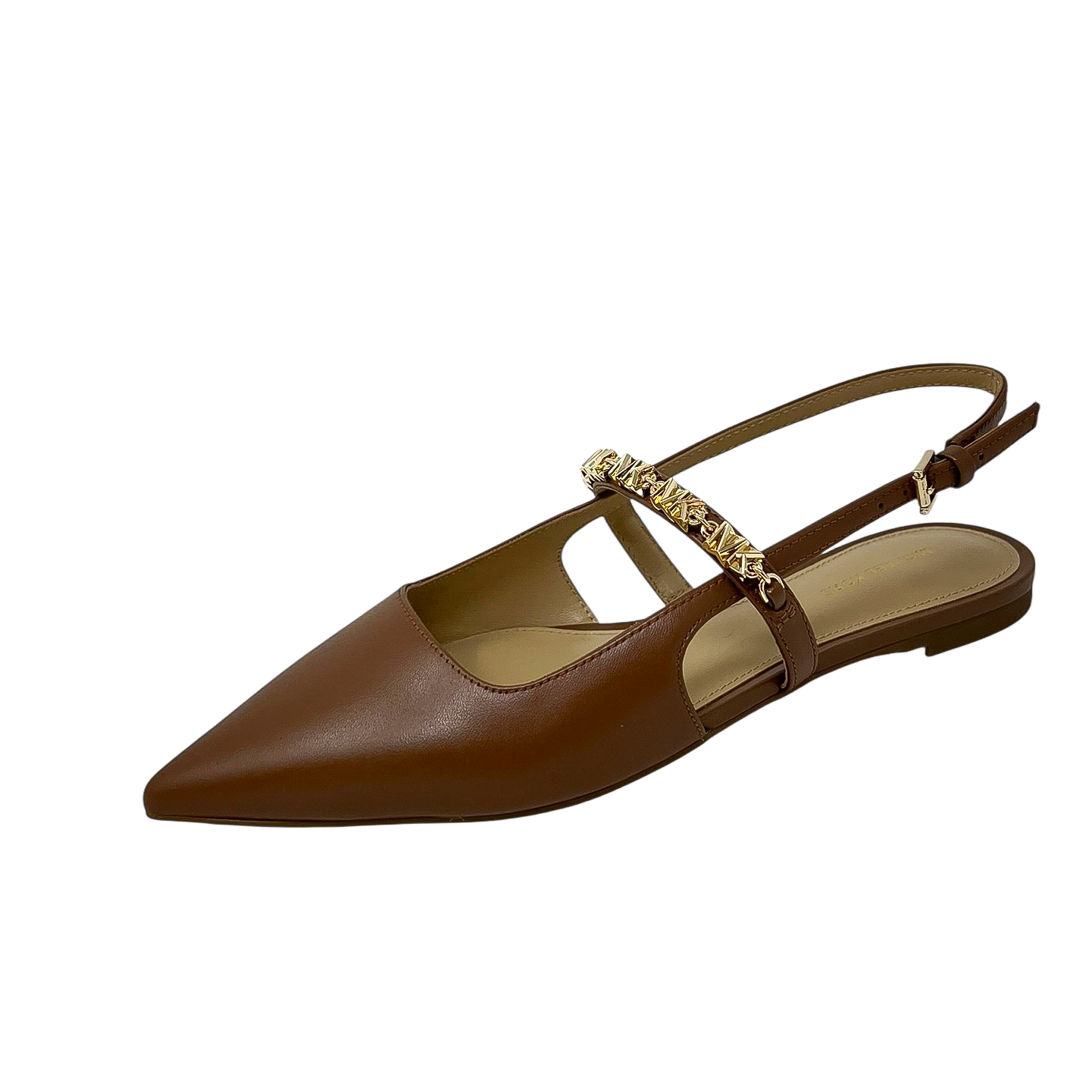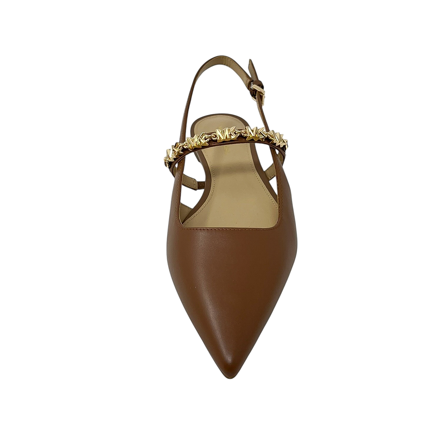 Chanel in pelle cuoio con cinturino sul collo del piede e loghi dorati.
