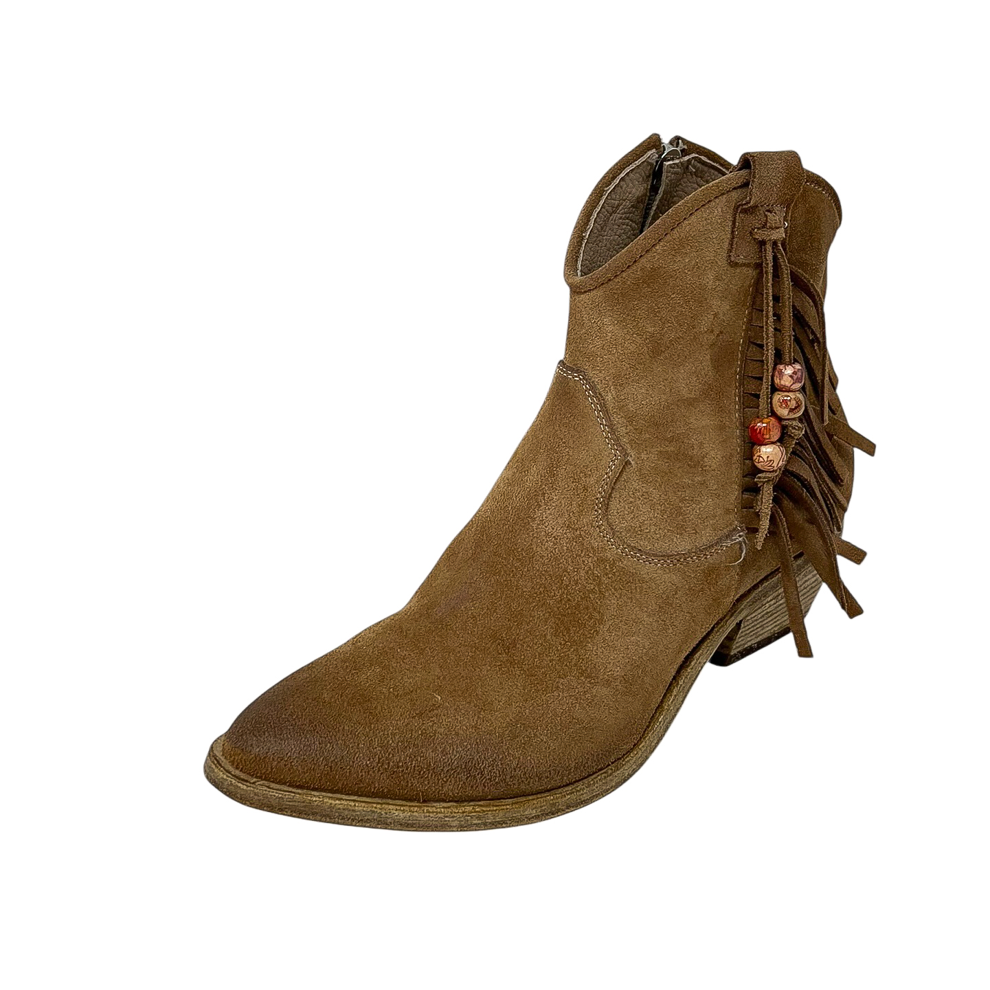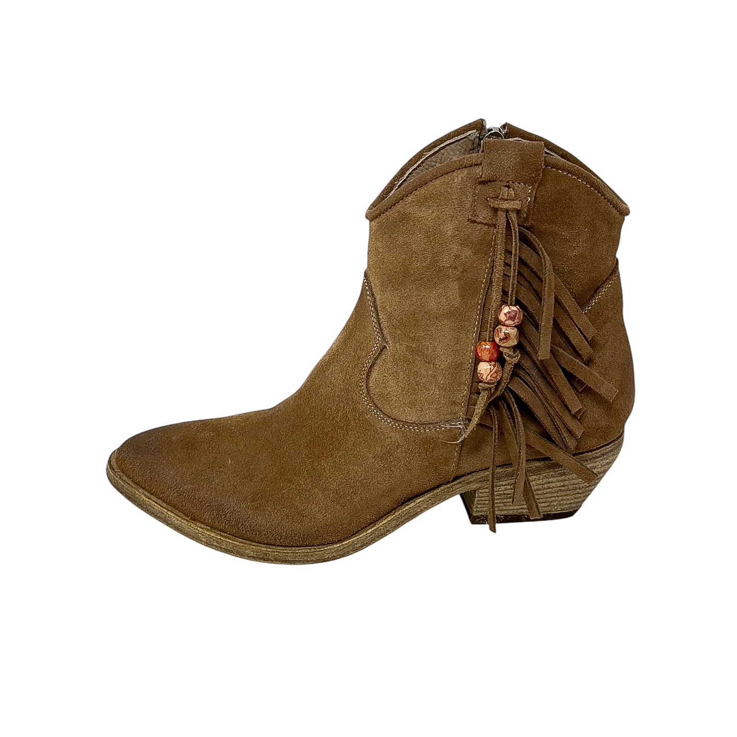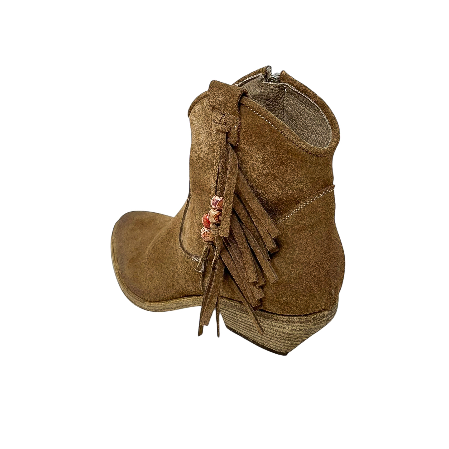 Stivaletto camperos in camoscio tortora/cuoio con frange e perline