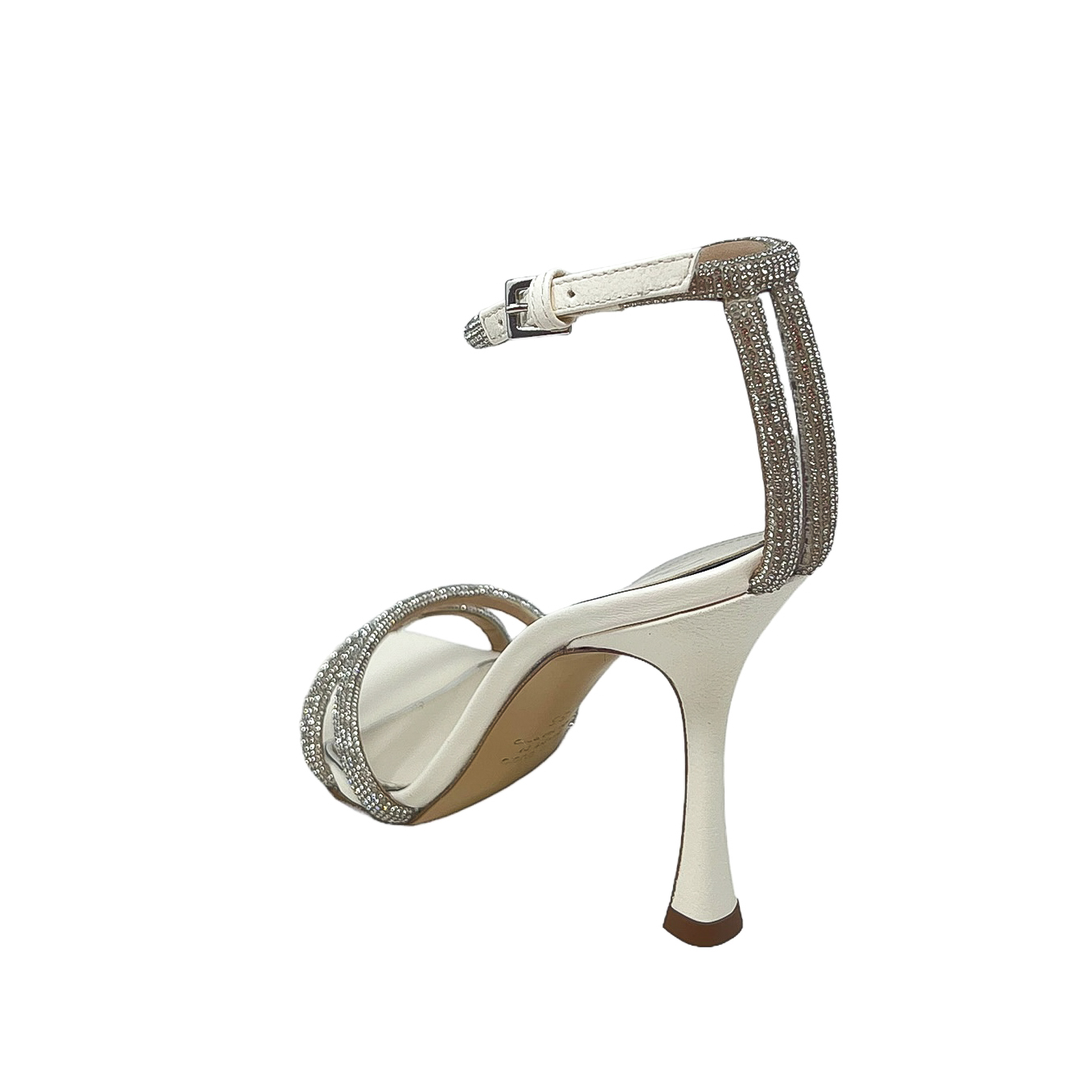Sandalo in pelle avorio con listini e cinturino alla caviglia in veri Swarovski. Tacco di 10 centimetri a rocchetto