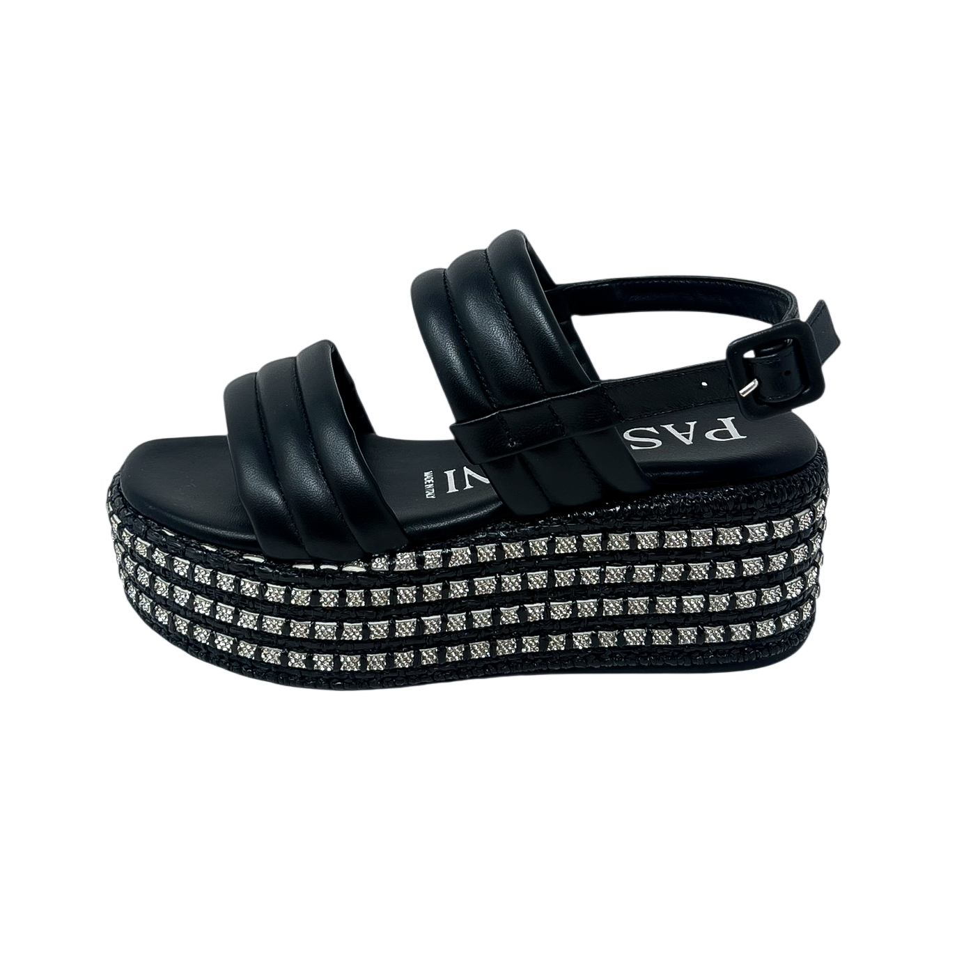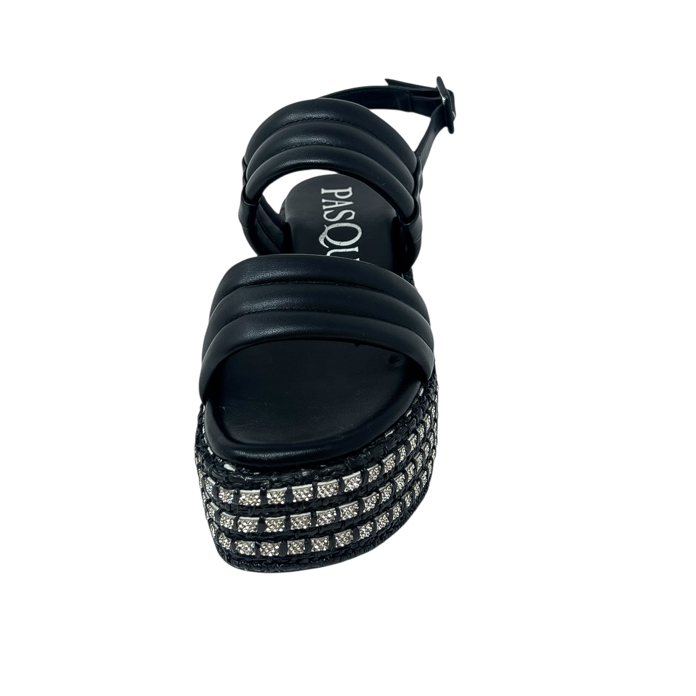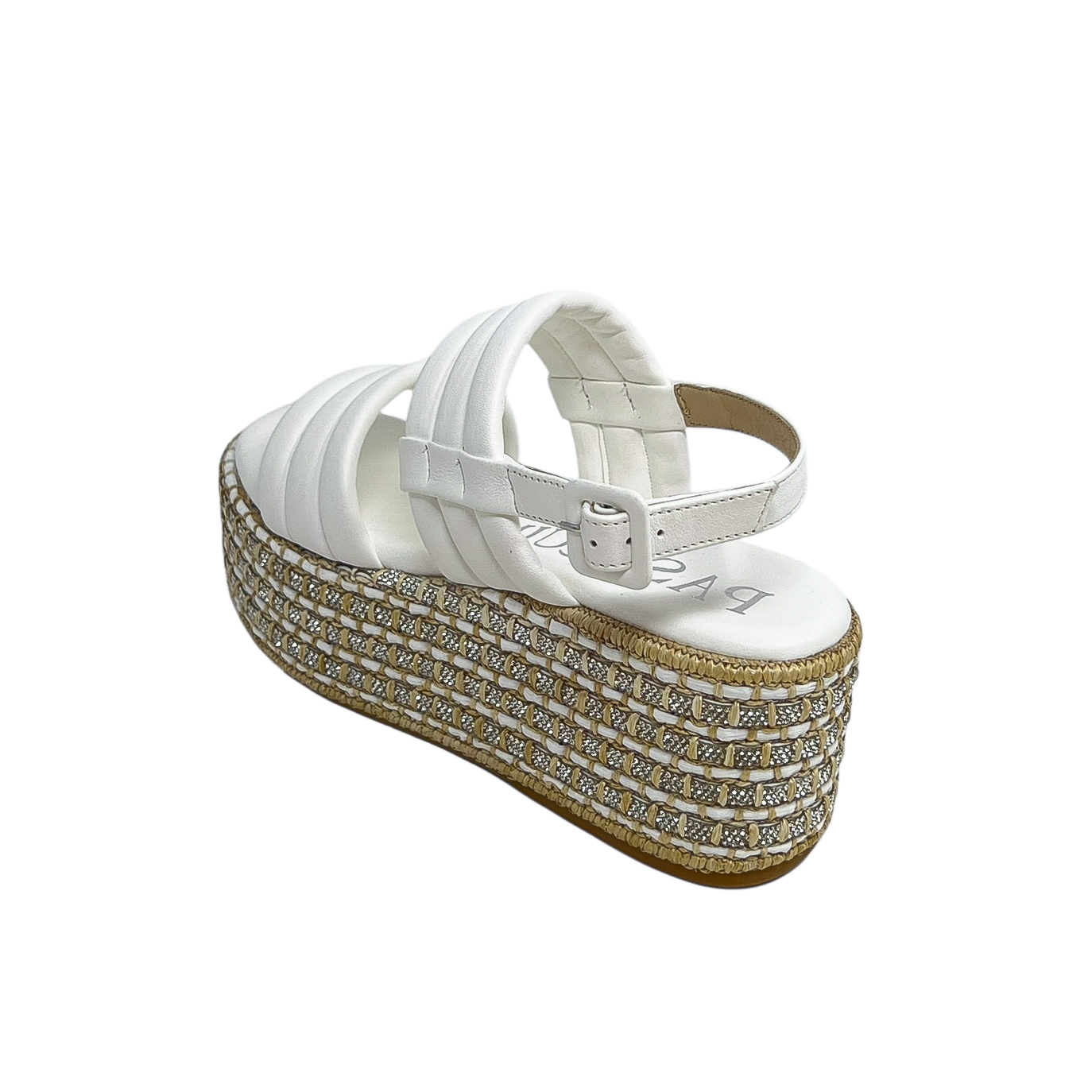 Sandalo con due fasce in pelle imbottite bianco o nero con zeppa in strass di 5 centimetri