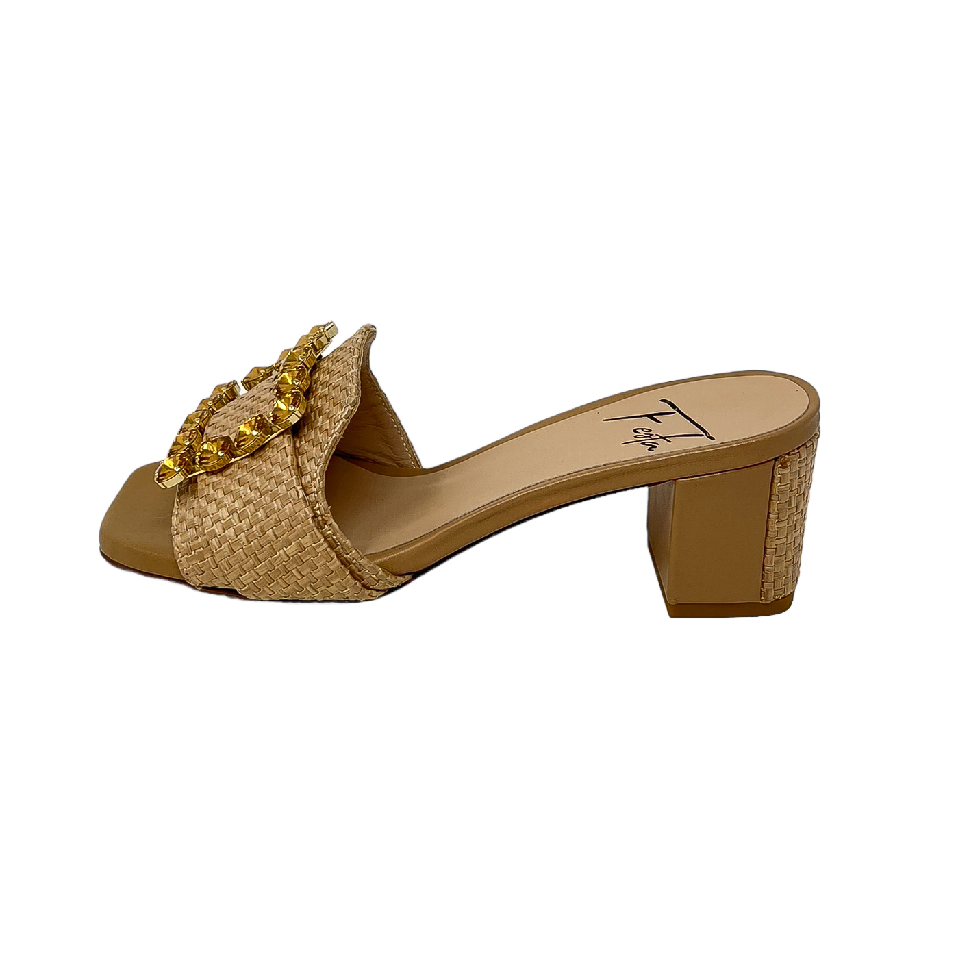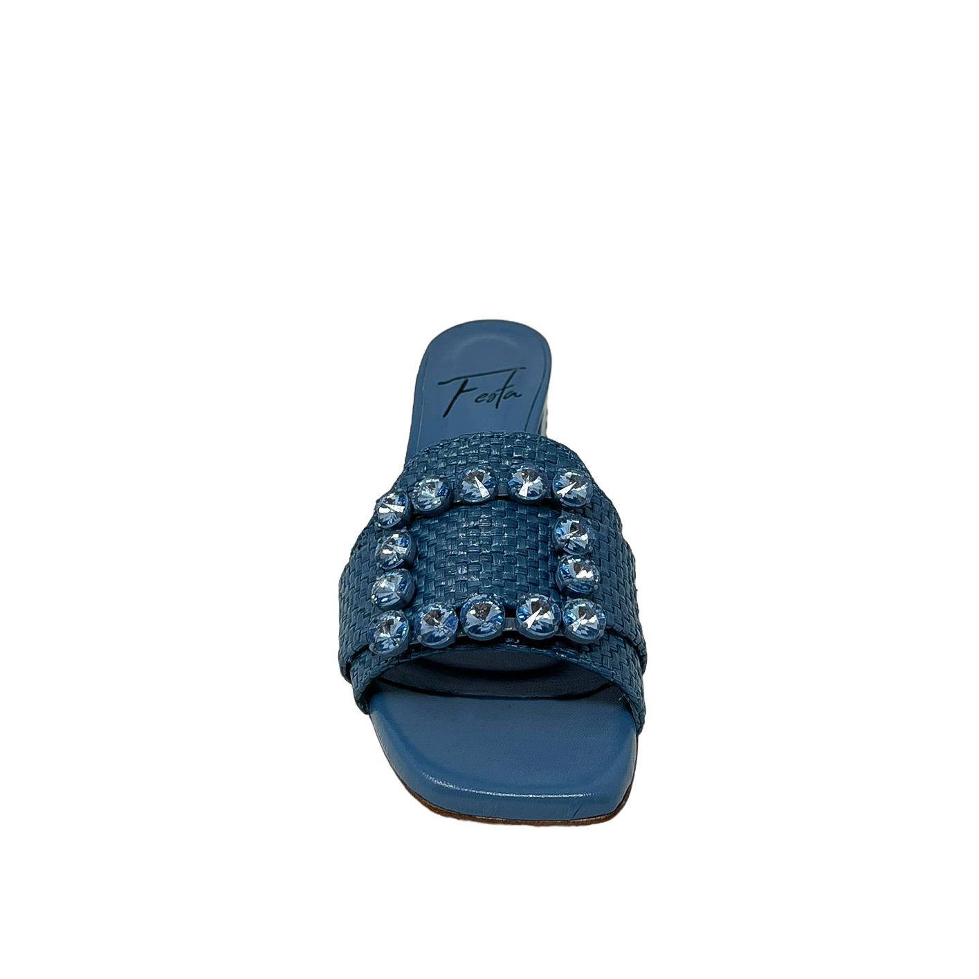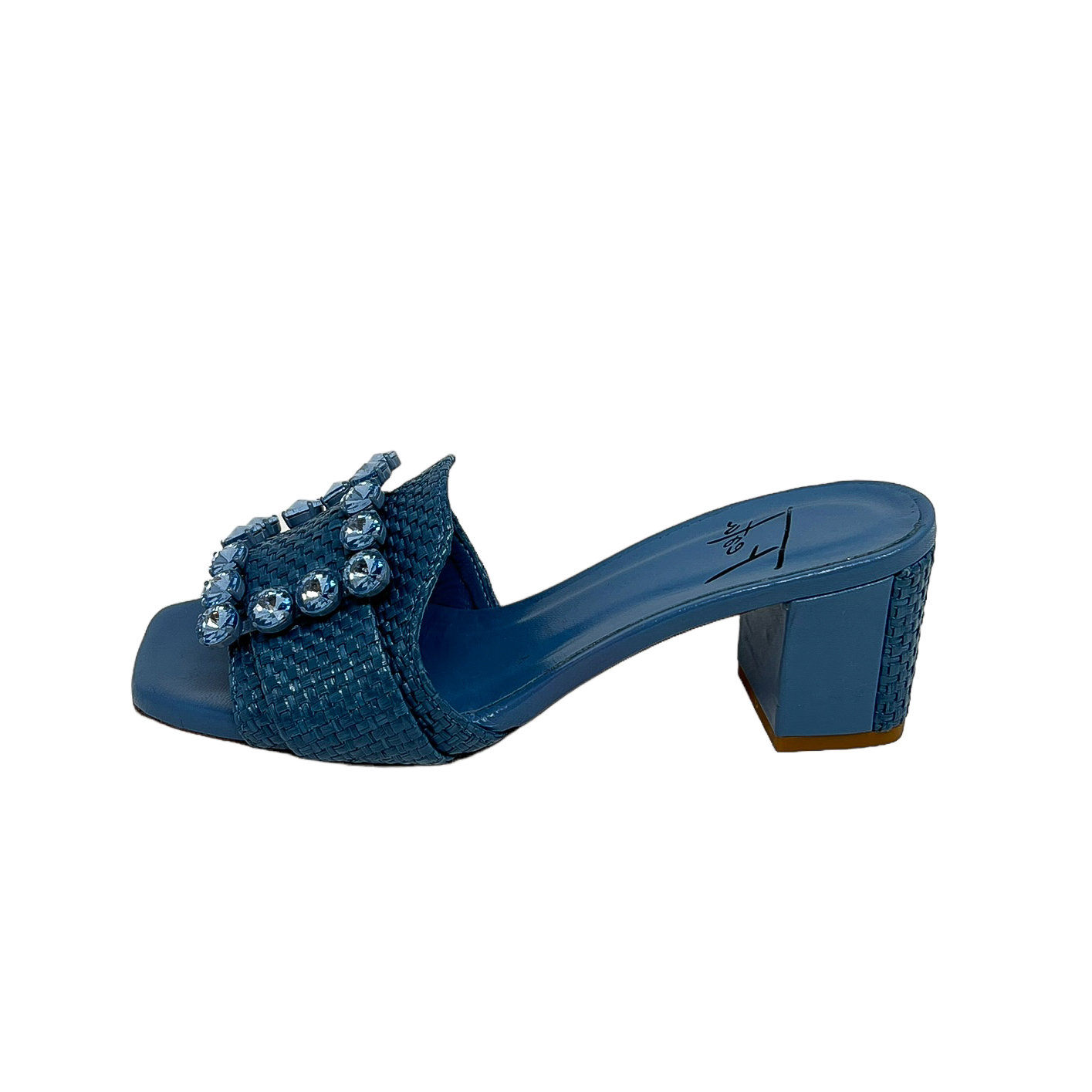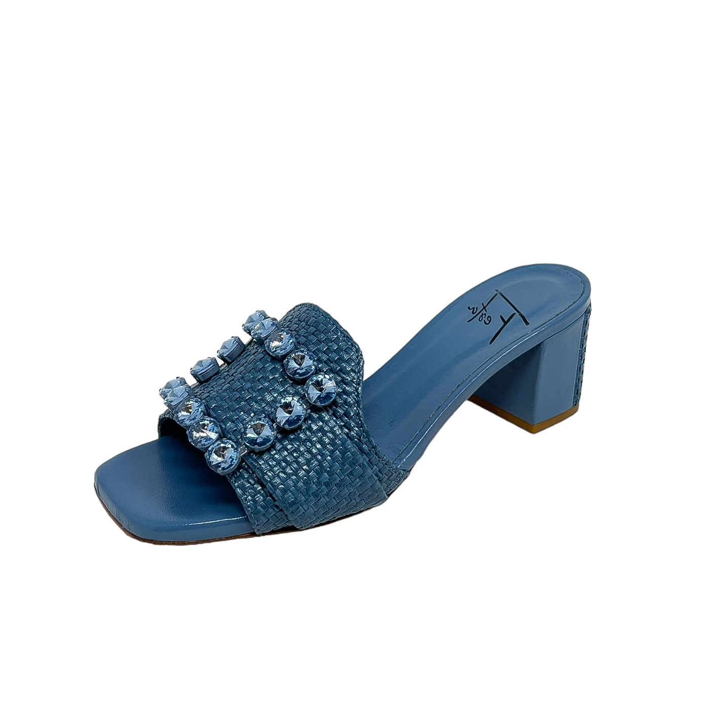Ciabatta in rafia beige o azzurro con accessorio in strass e tacco grosso di 6 centimetri