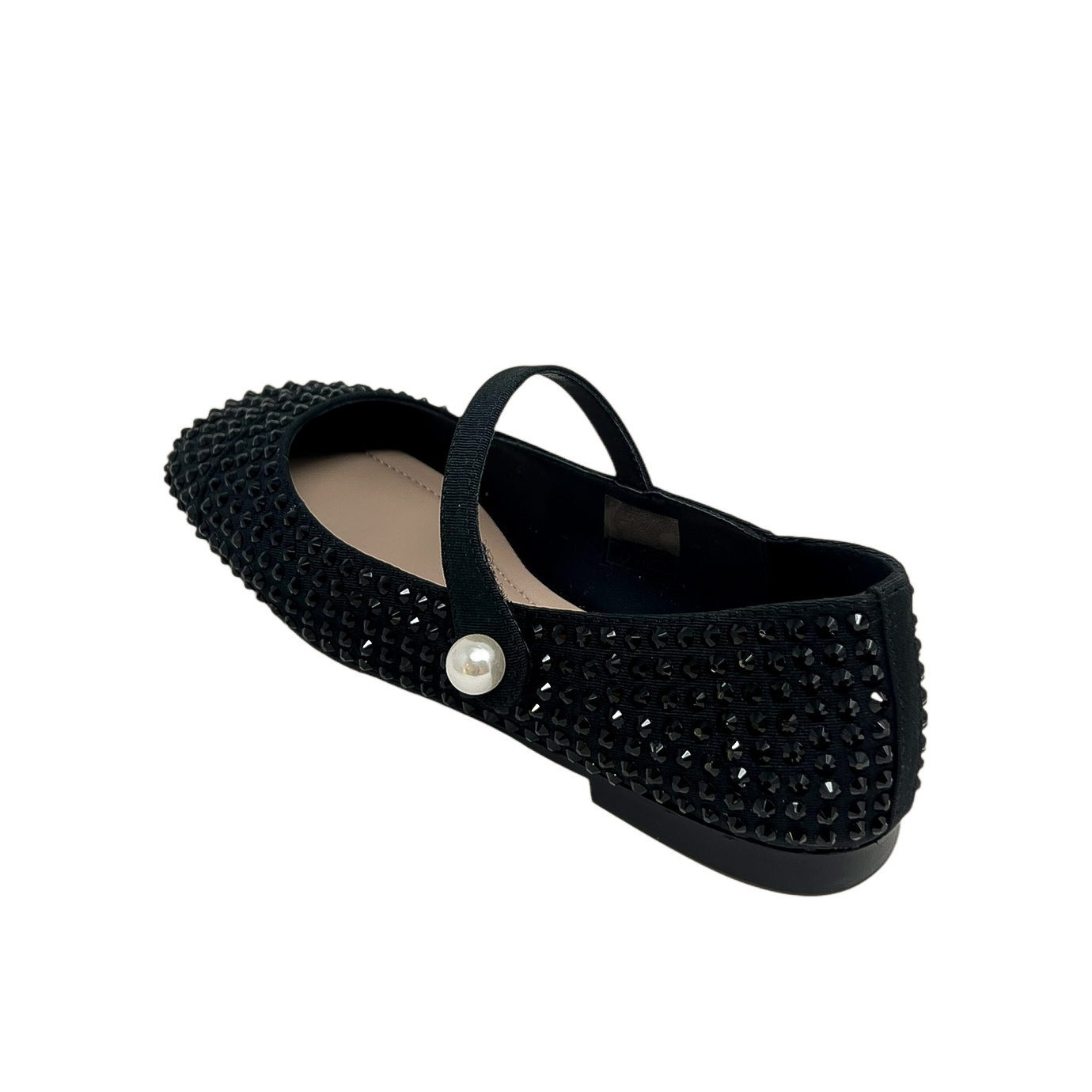 Ballerina nera con strass e cinturino sul collo del piede con perla