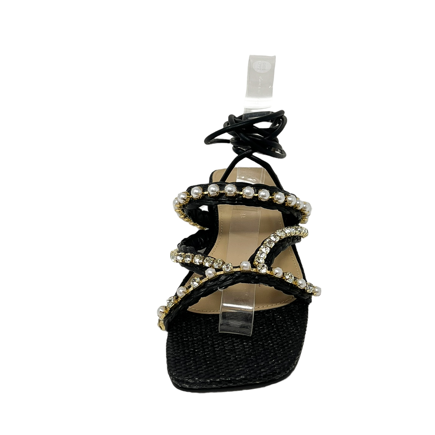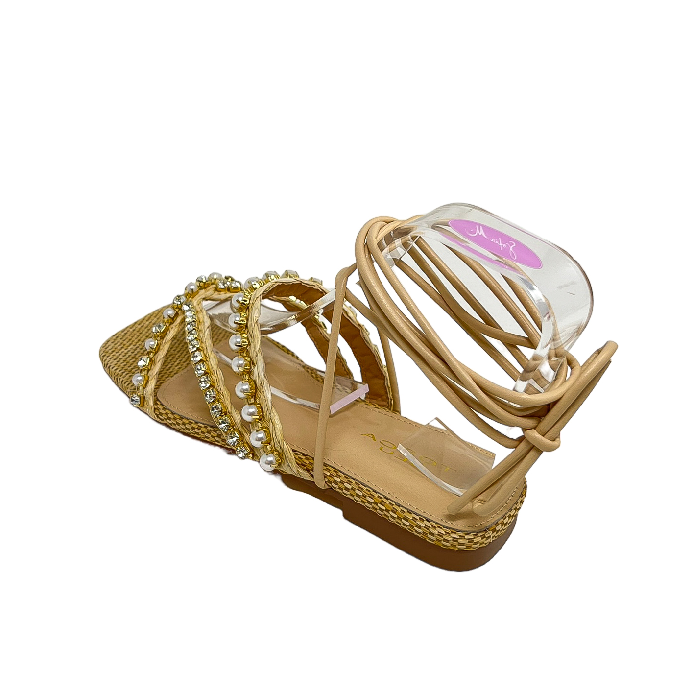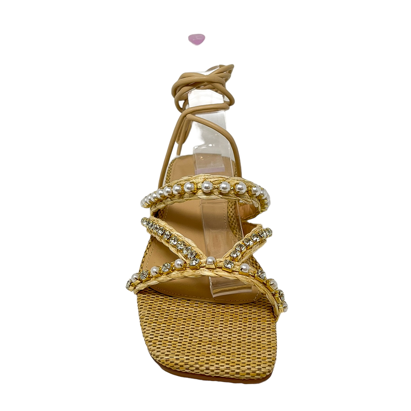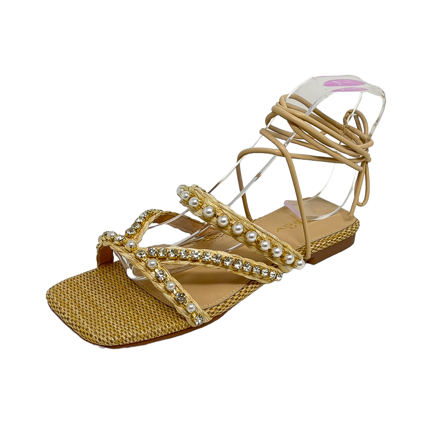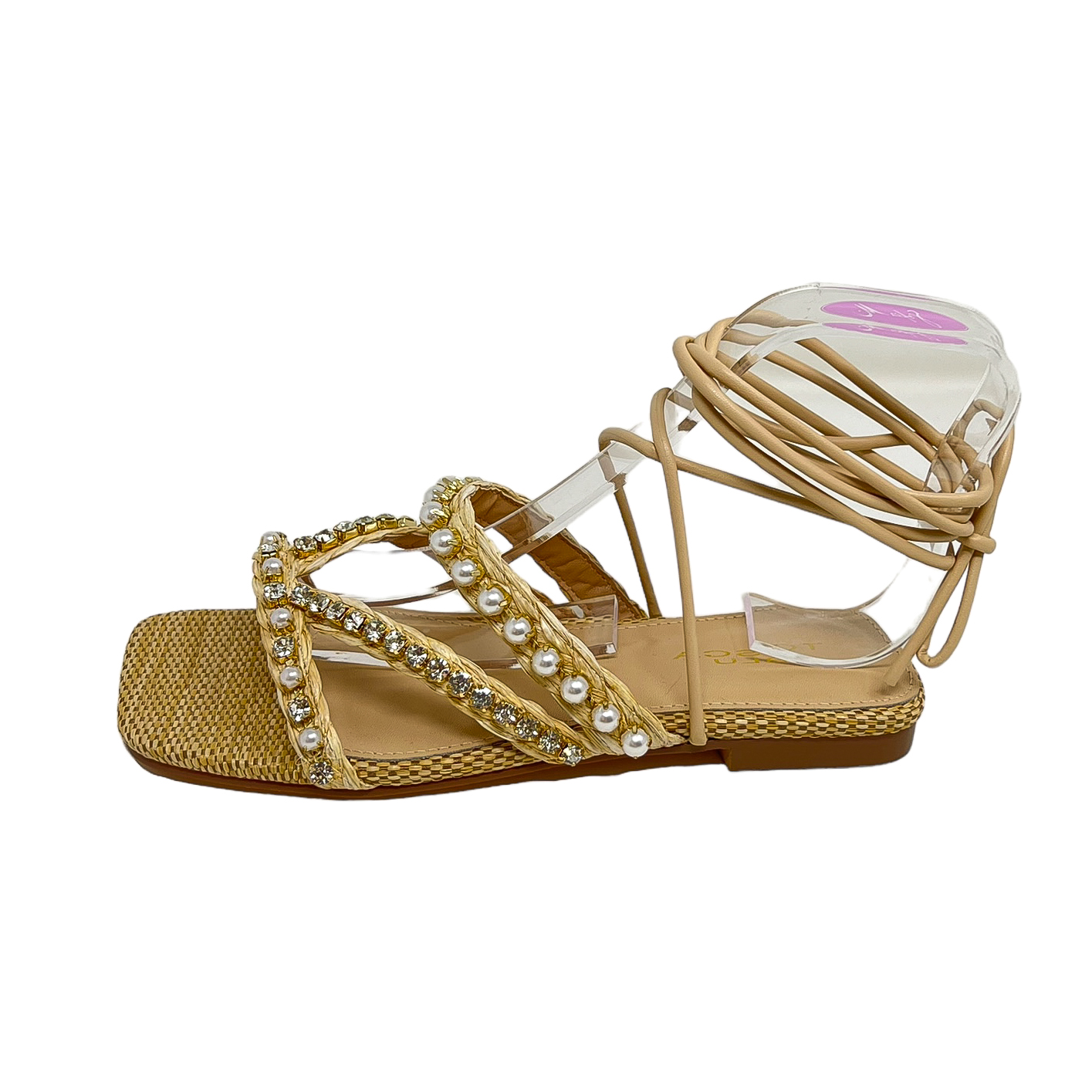Sandalo in rafia beige/cuoio o nero con perle e strass, lacci alla caviglia