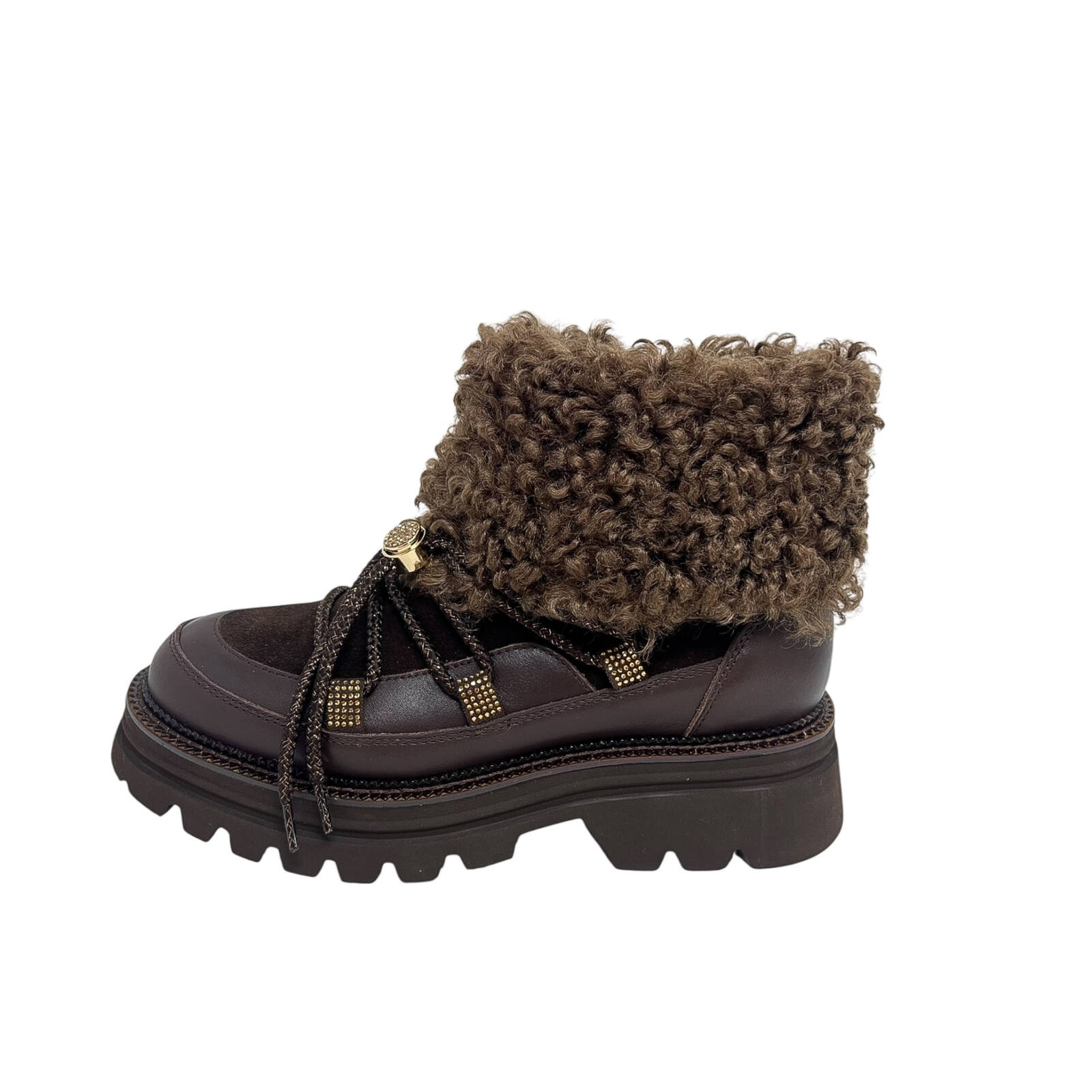 Anfibio in pelle nera o camoscio beige con pelo sulla linguetta e allacciatura a pedula