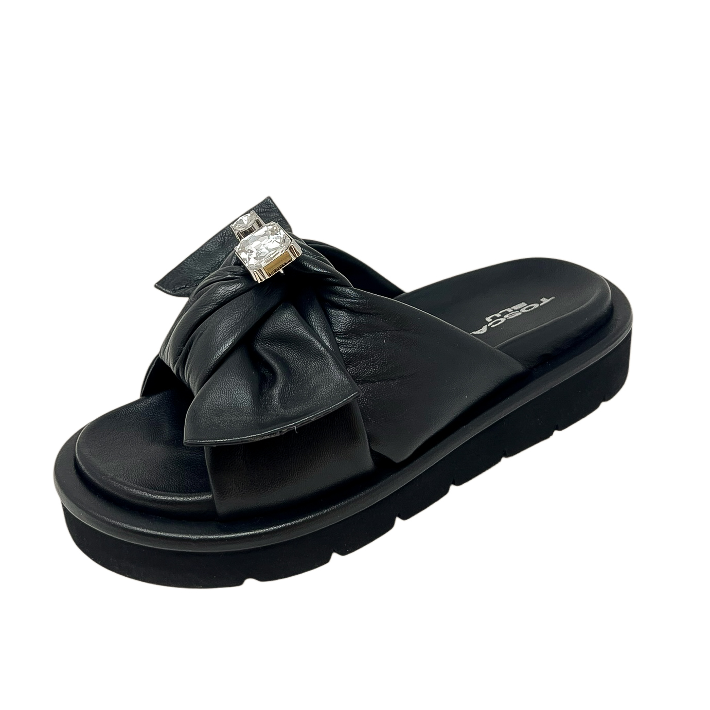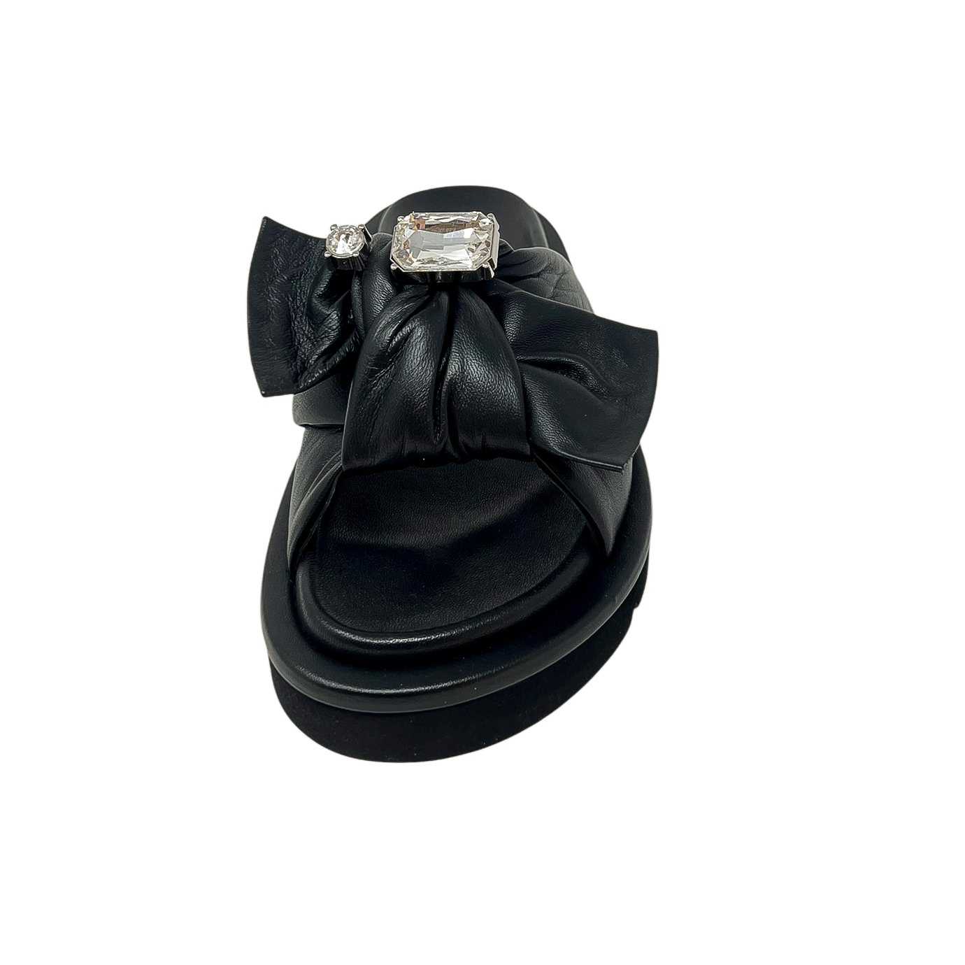 Ciabatta in pelle nera con fiocco e strass. Suola fussbett
