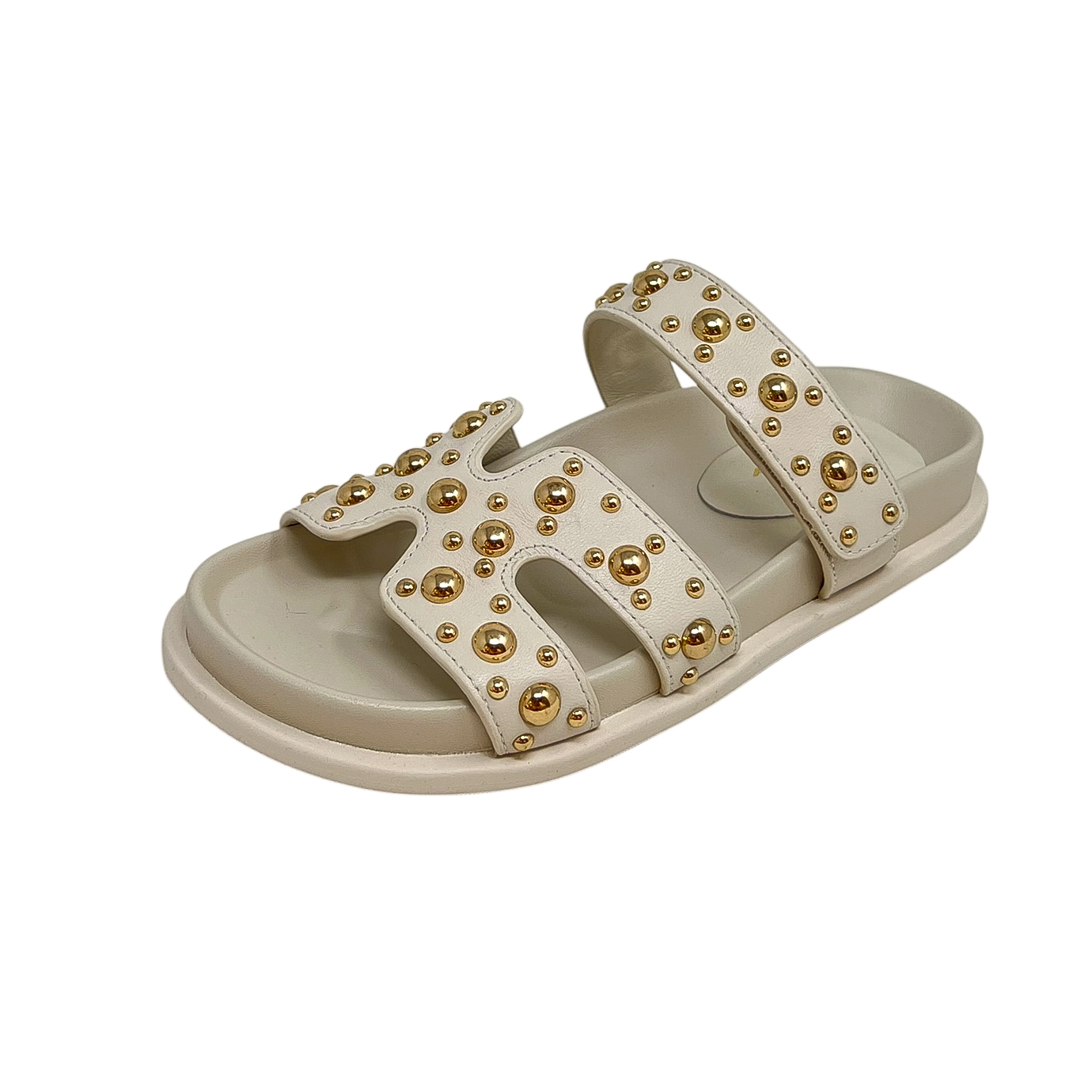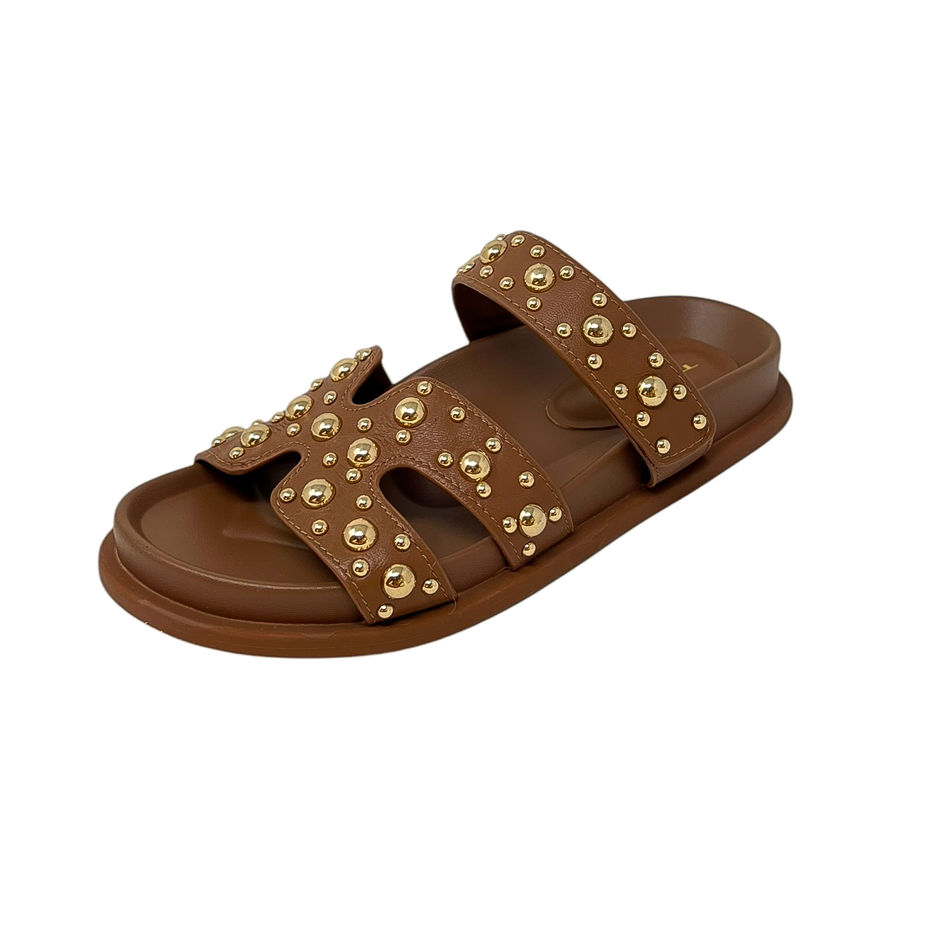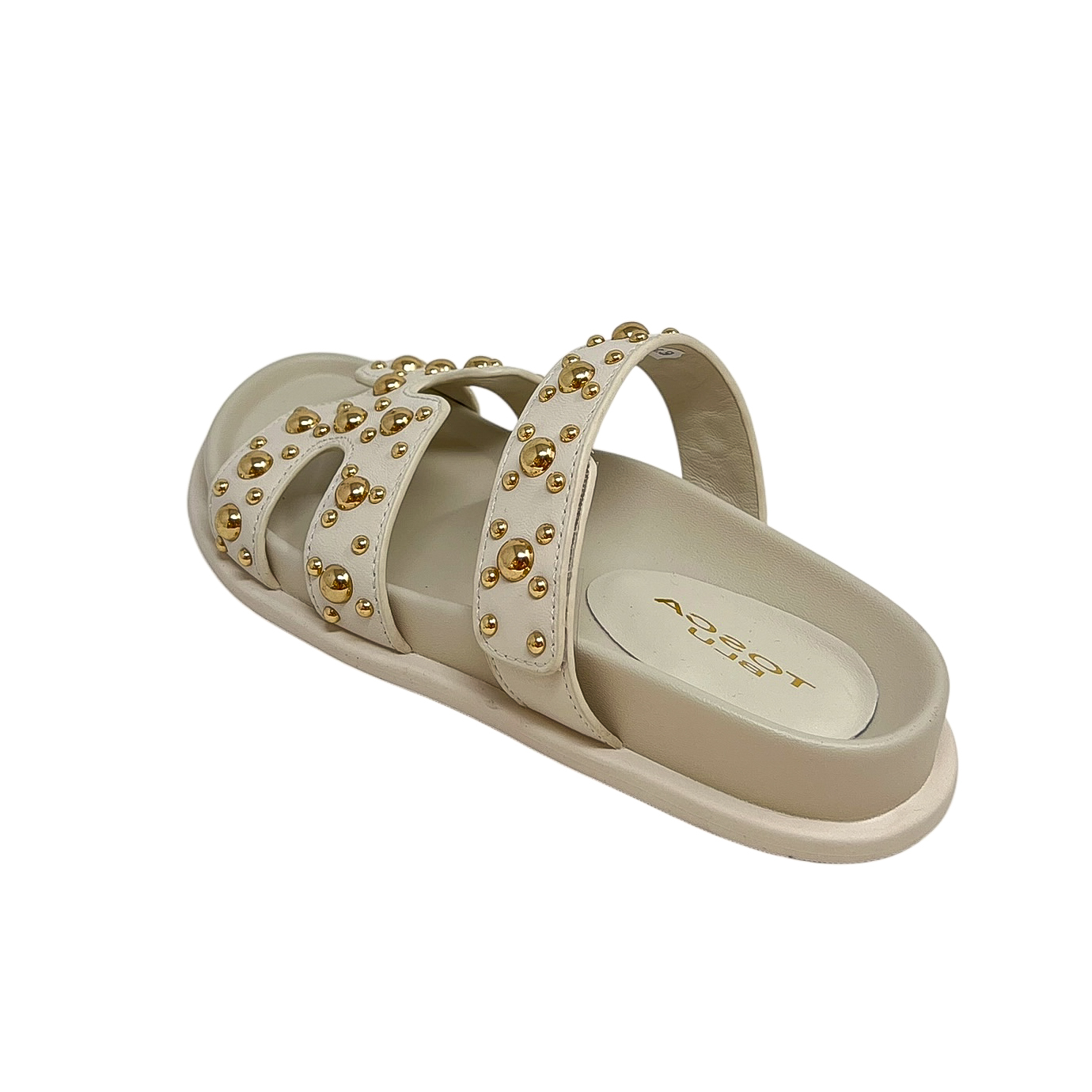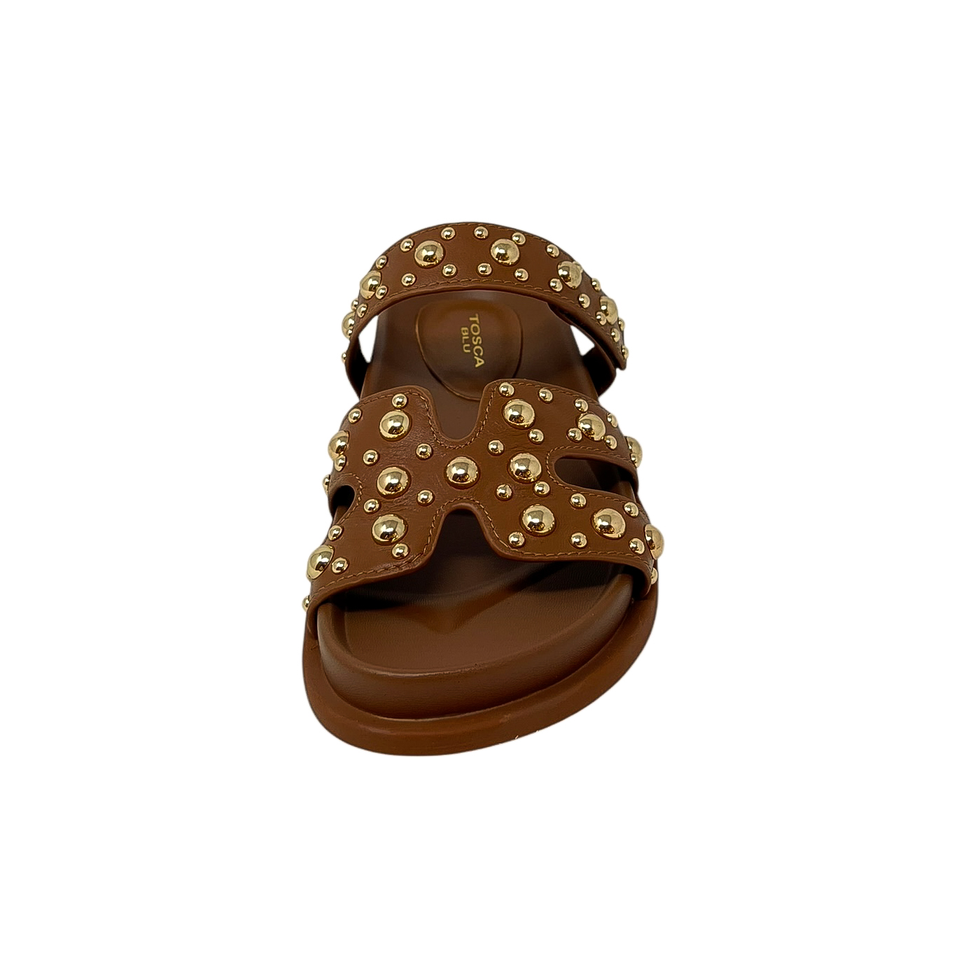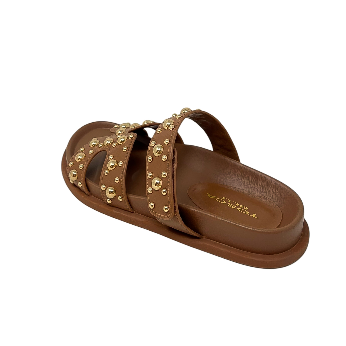 Ciabatta in pelle con due fasce cuoio o panna con borchiette dorate e suola fussbett