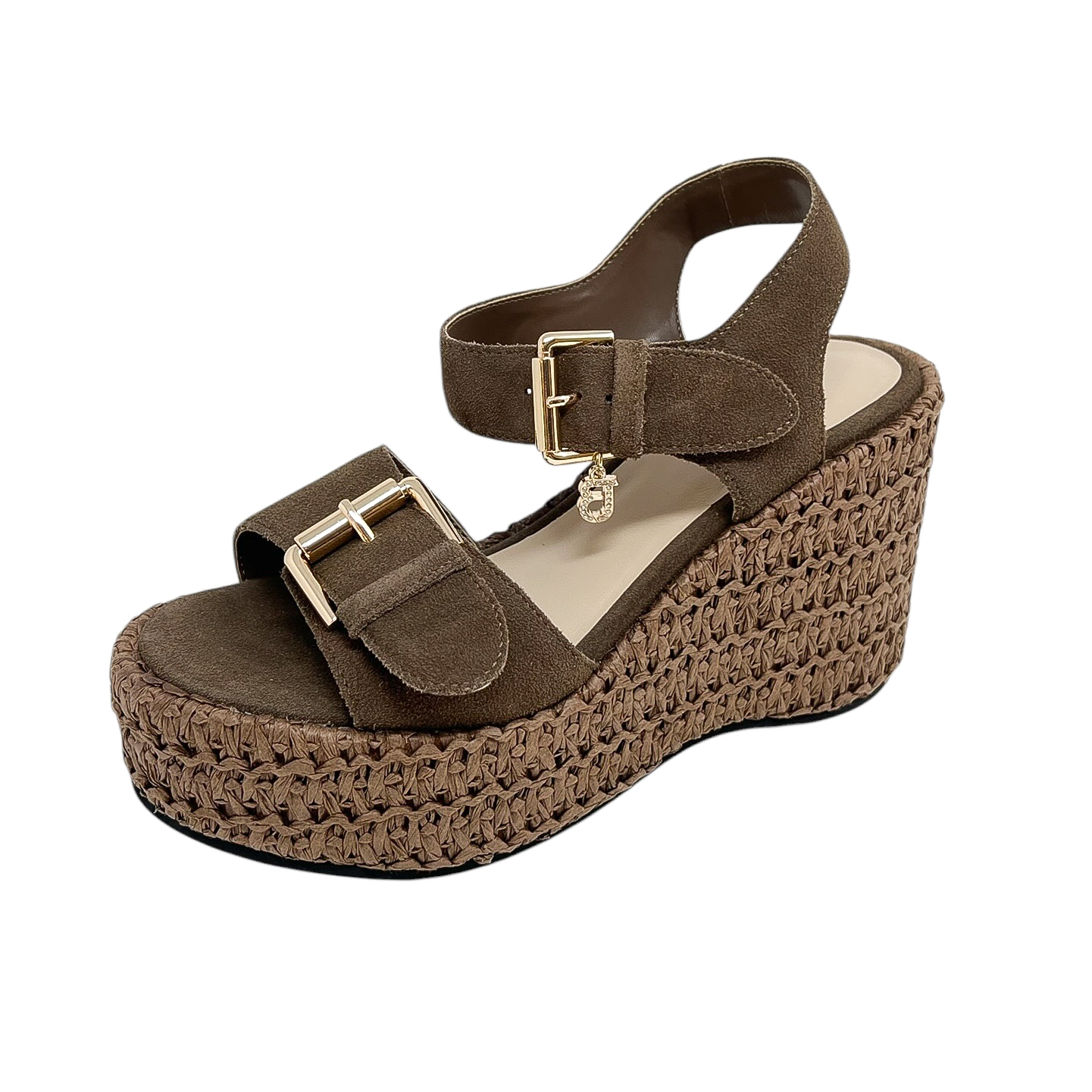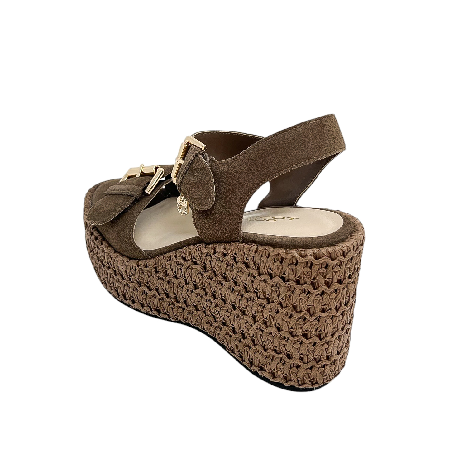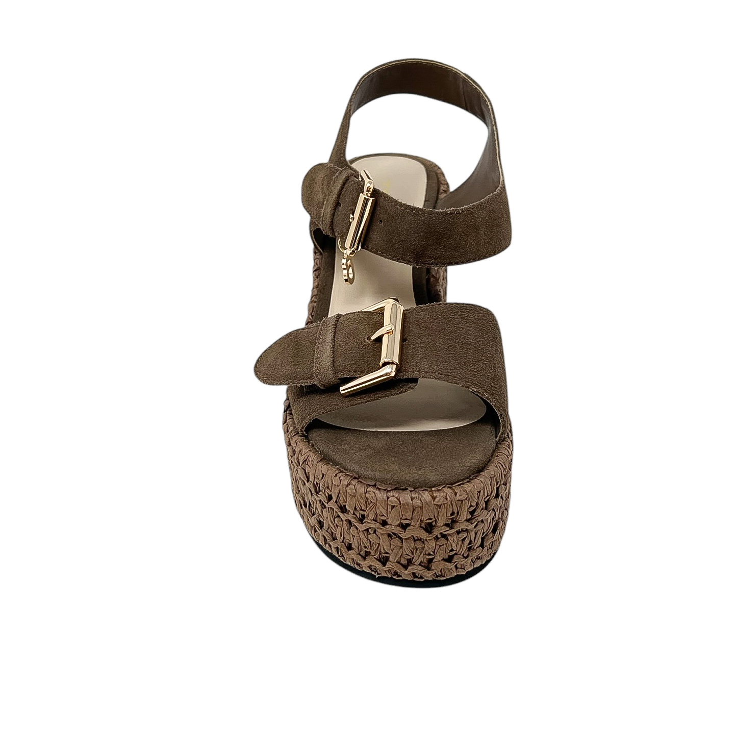 Sandalo in camoscio cioccolata con due fibbie e zeppa di 8 centimetri in rafia