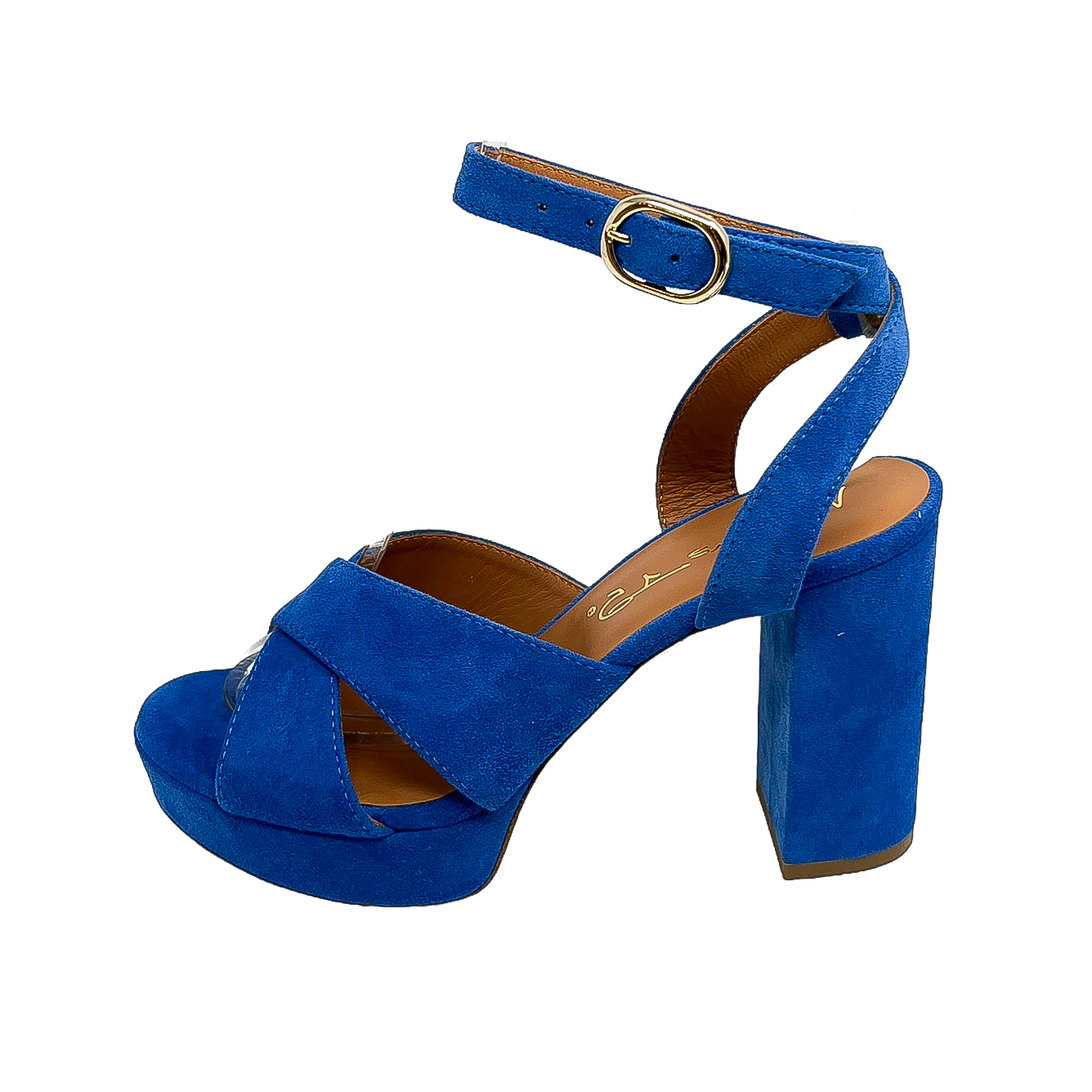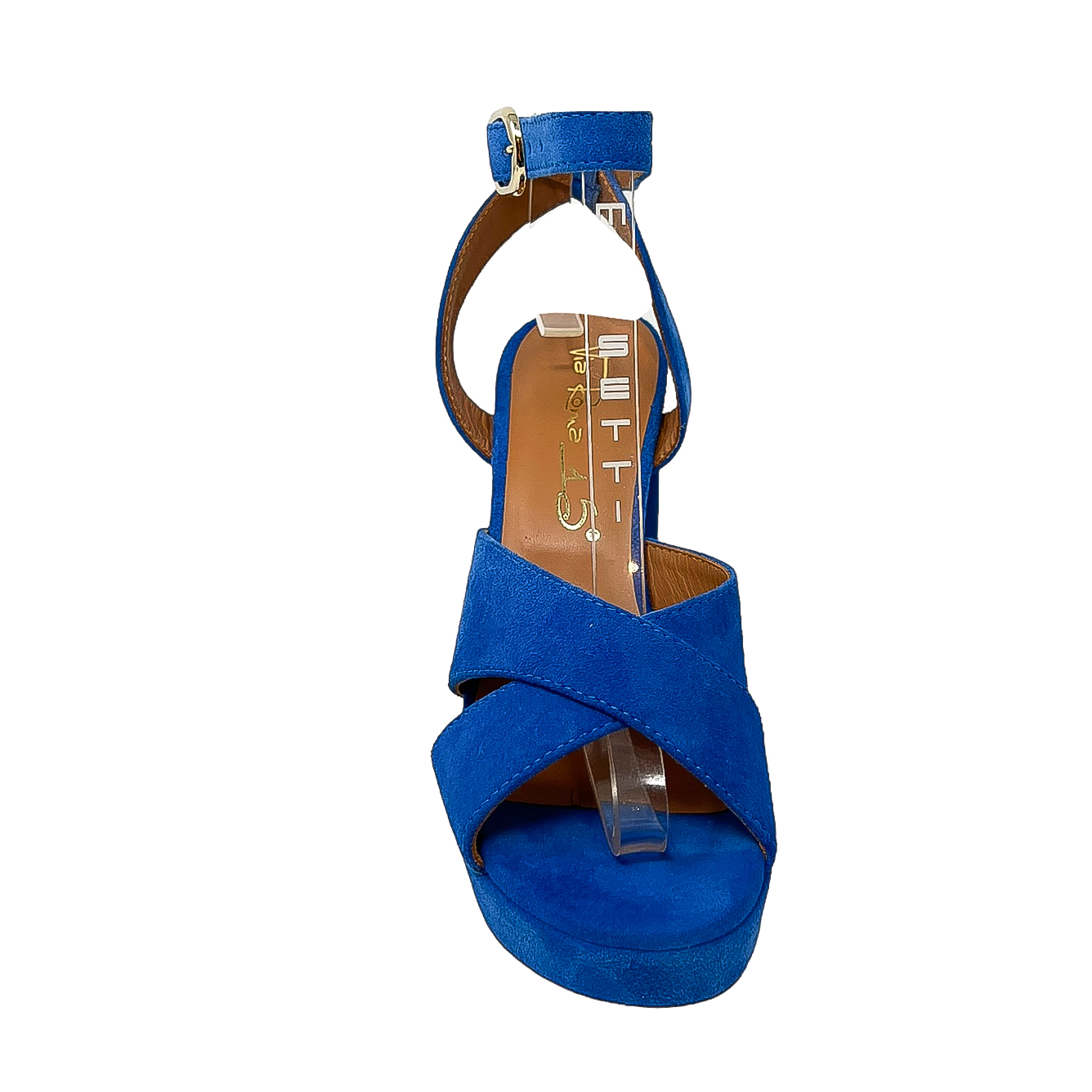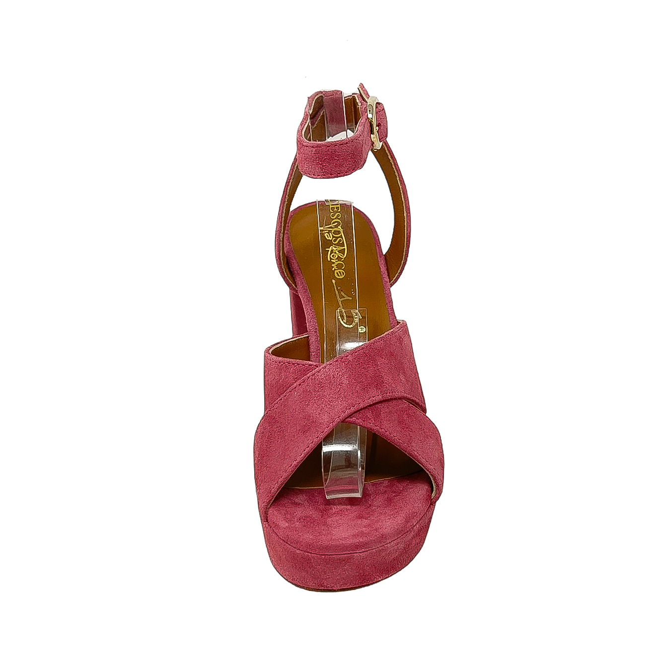 Sandalo in camoscio bluette o camoscio rosa con due fasce incrociate davanti, cinturino alla caviglia e tacco grosso di 12 centimetri con platform