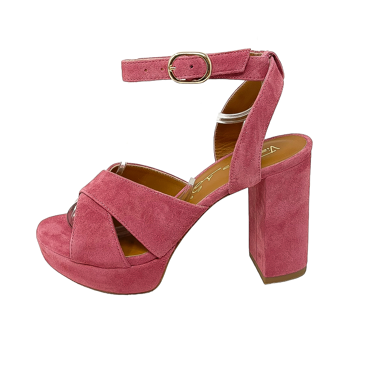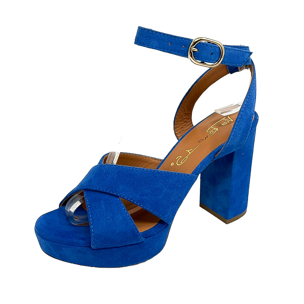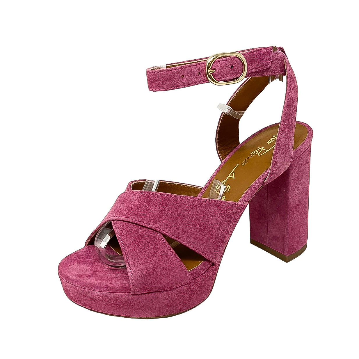 Sandalo in camoscio bluette o camoscio rosa con due fasce incrociate davanti, cinturino alla caviglia e tacco grosso di 12 centimetri con platform