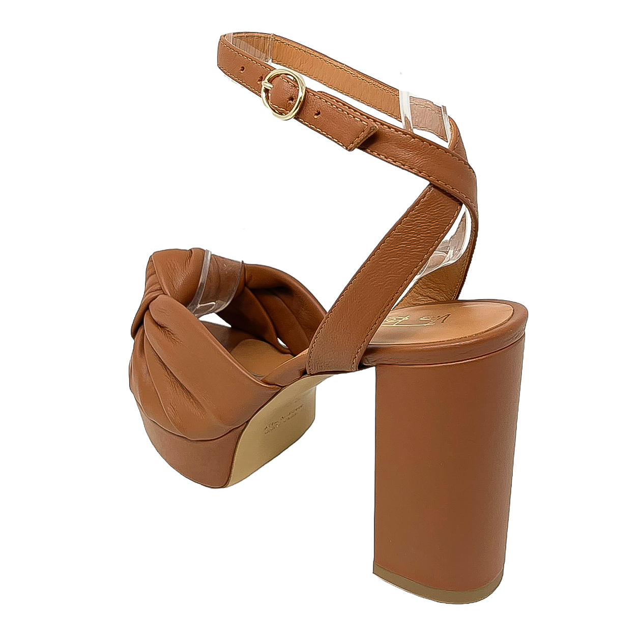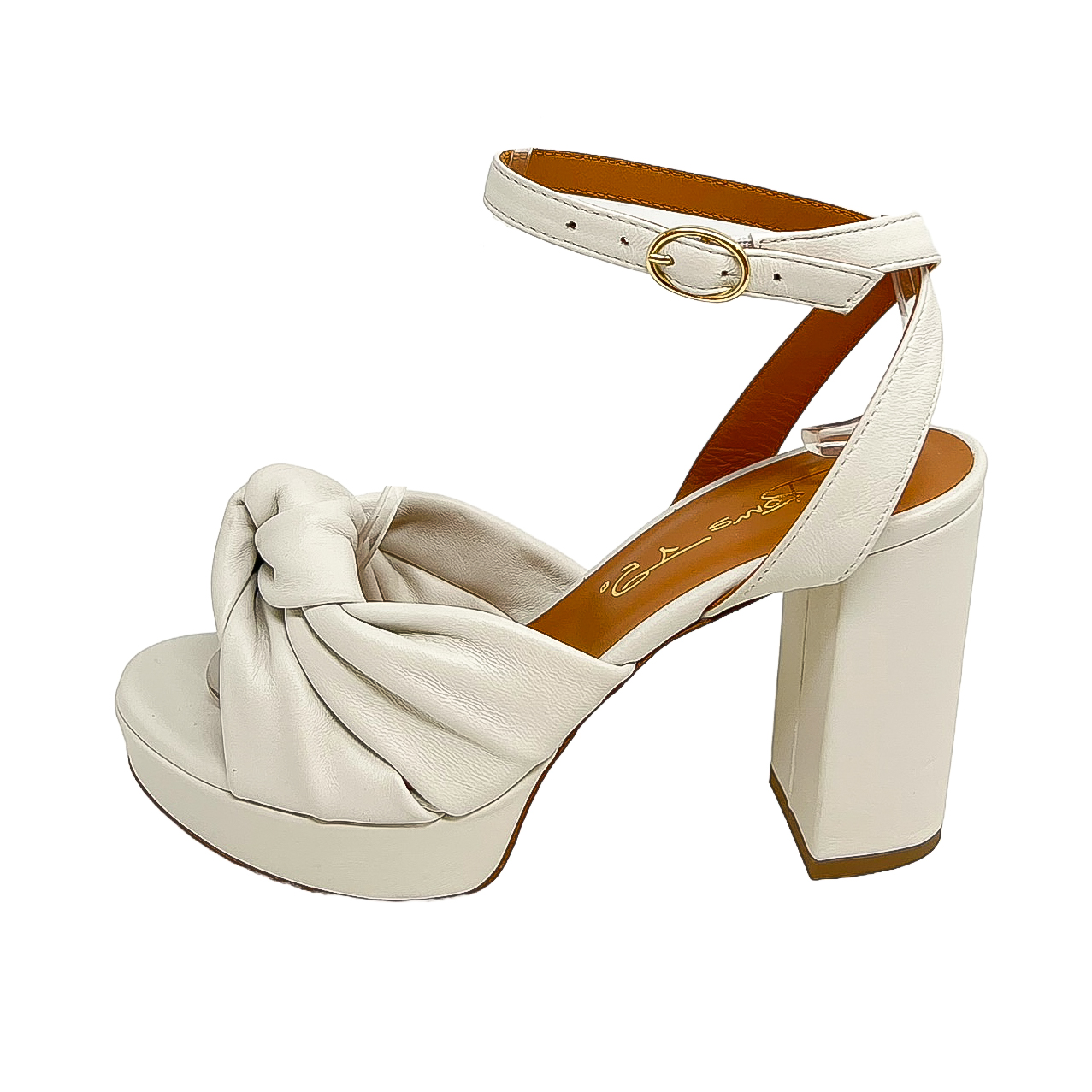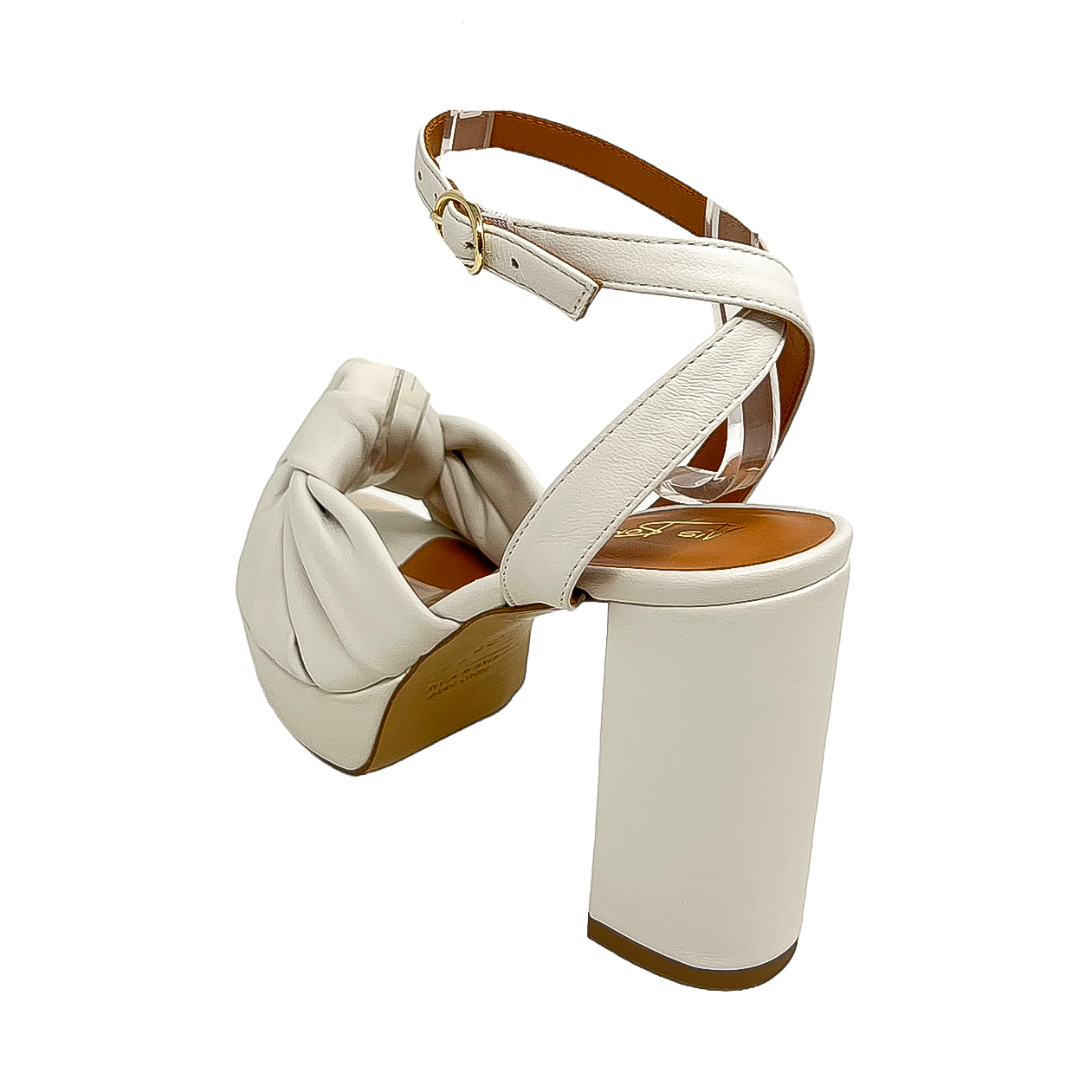 Sandalo in pelle bianco o cuoio con nodo imbottito davanti, cinturino alla caviglia e tacco grosso di 12 centimetri con platform