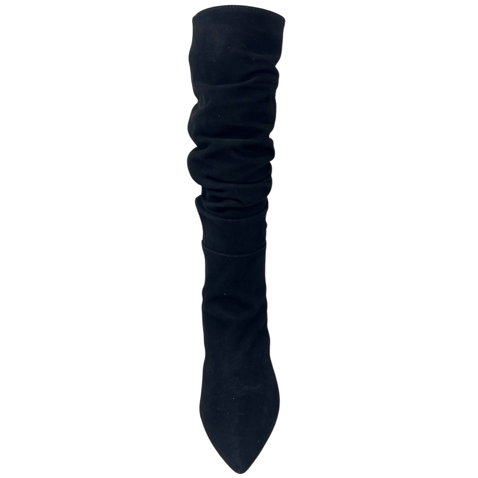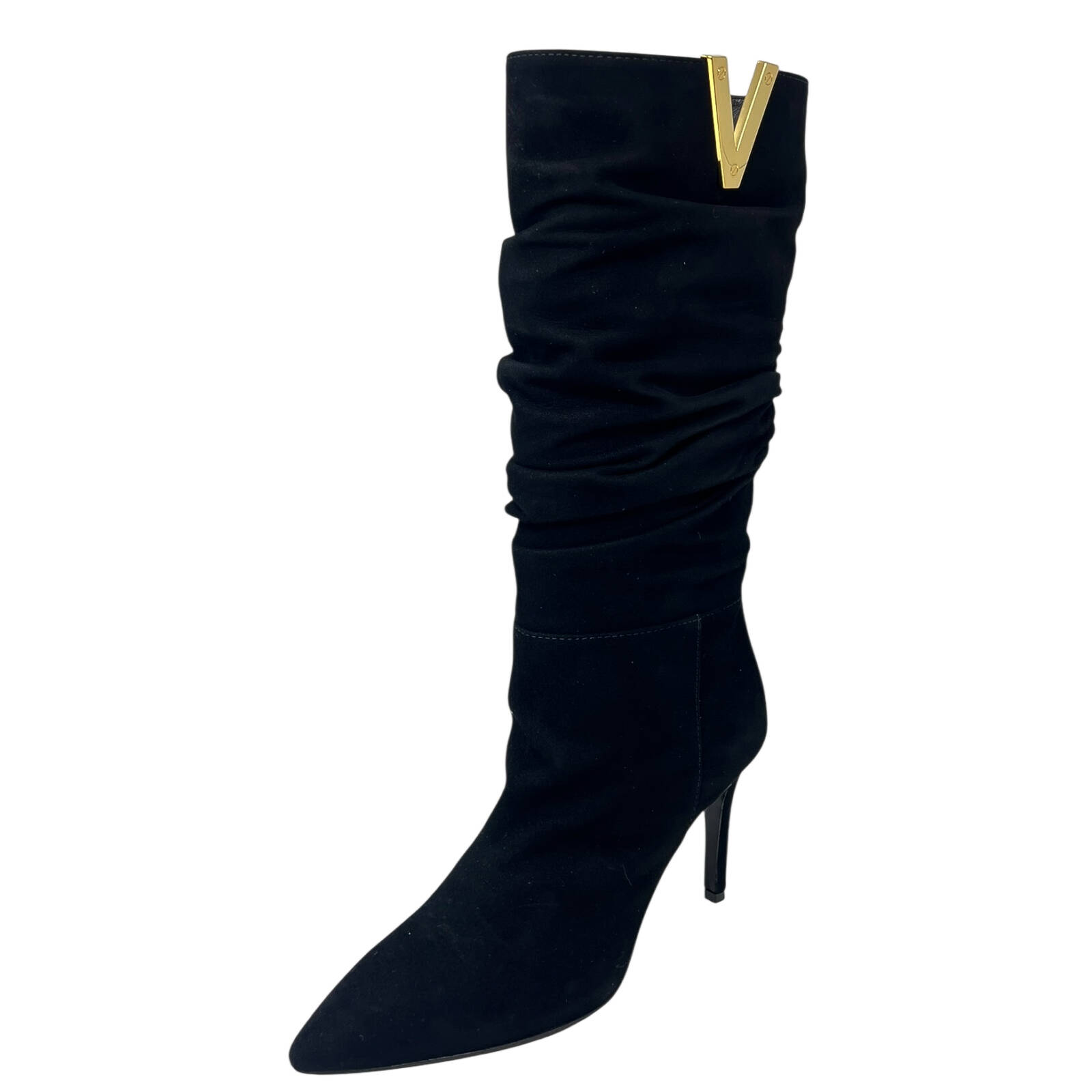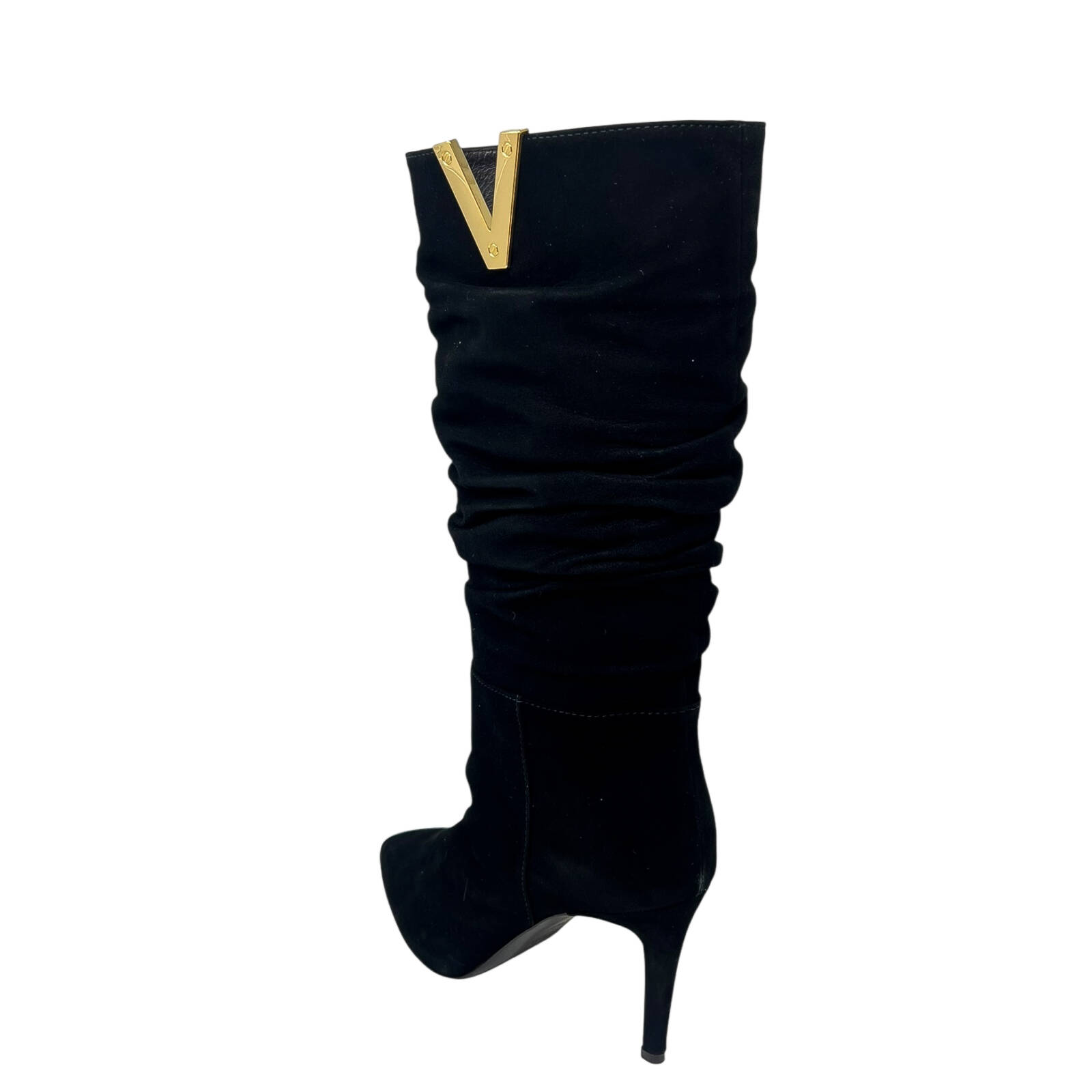 Stivale in camoscio nero arricciato con V laterale dorata e tacco di 8 centimetri